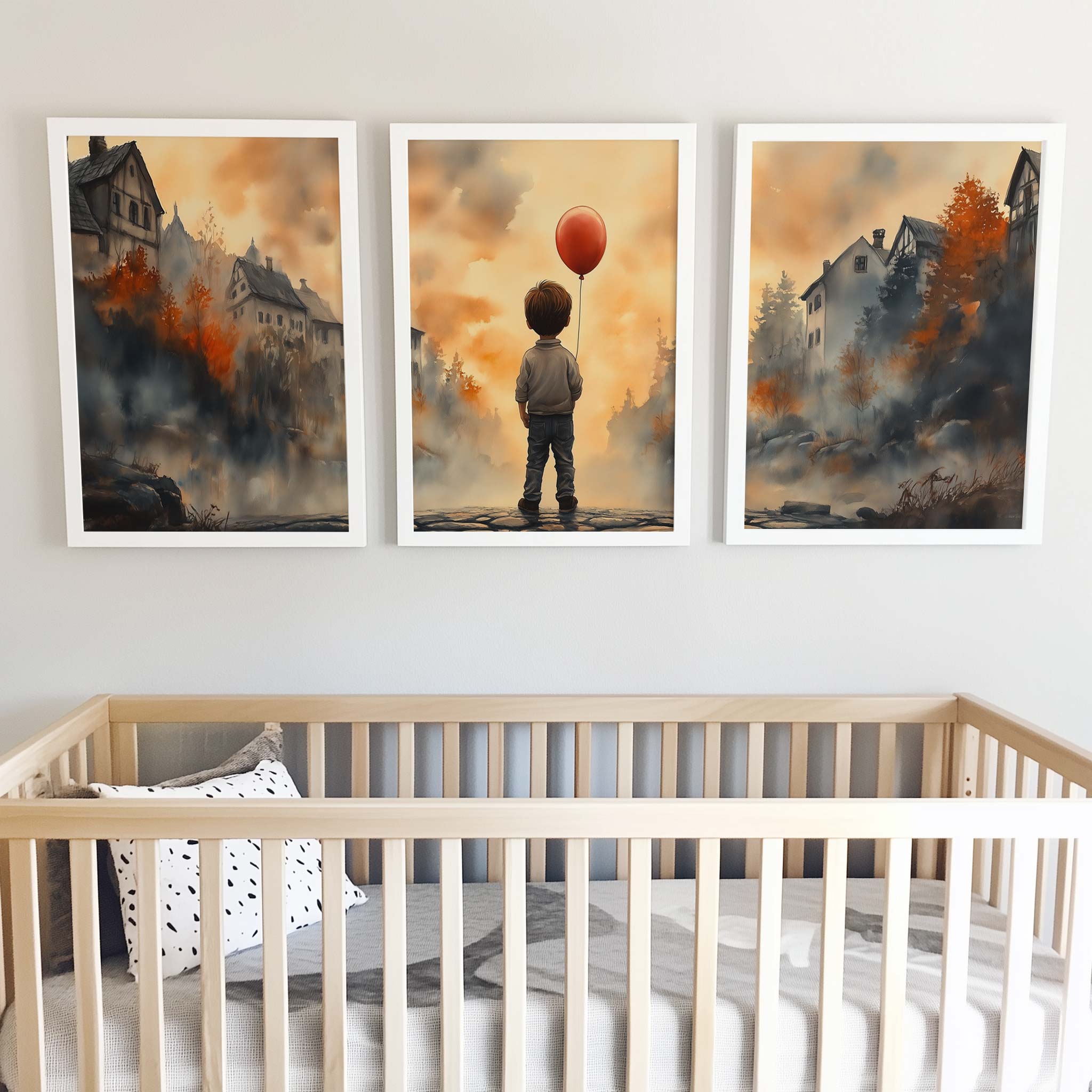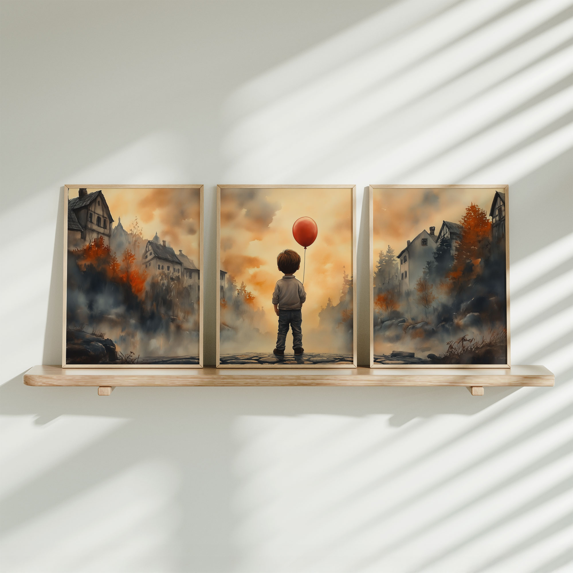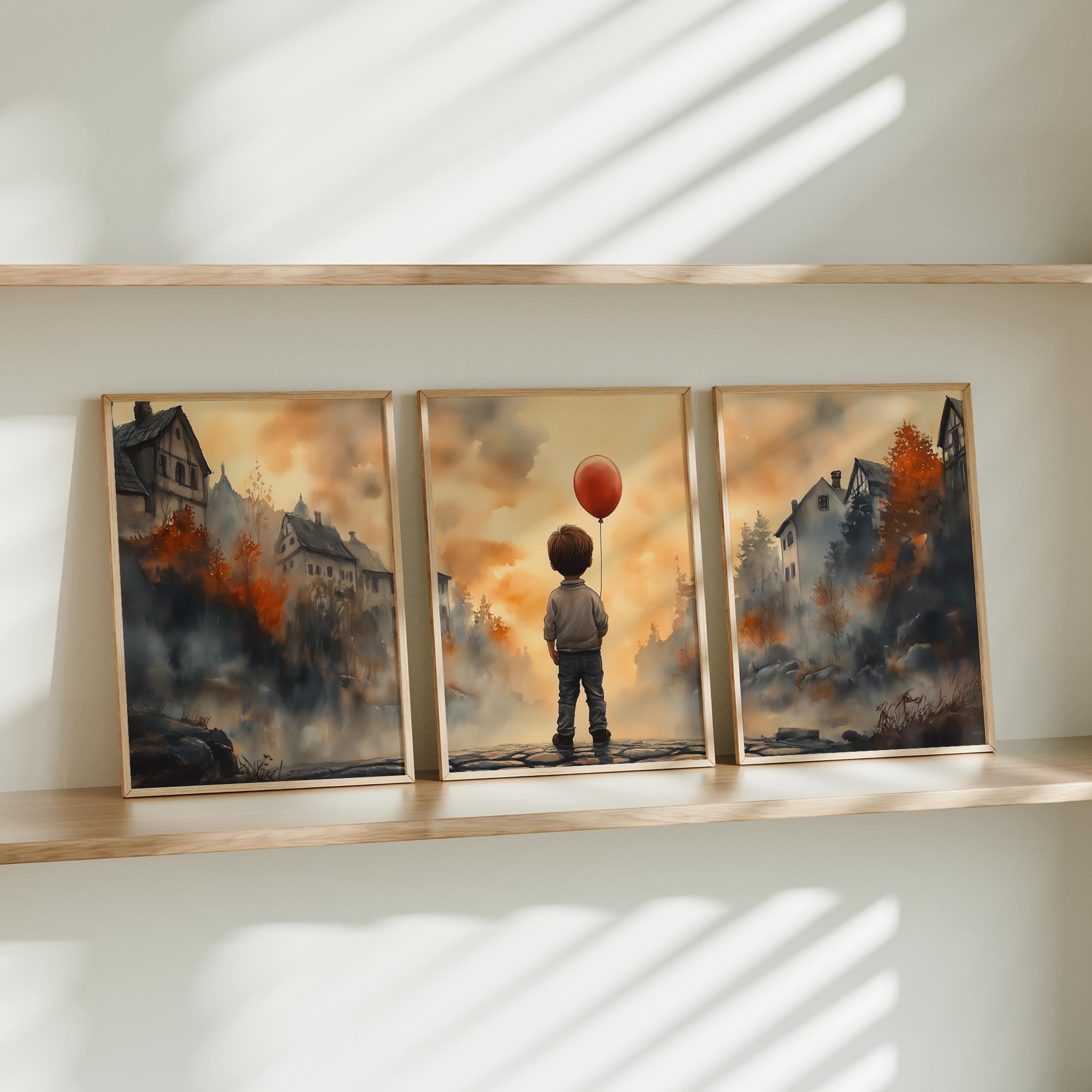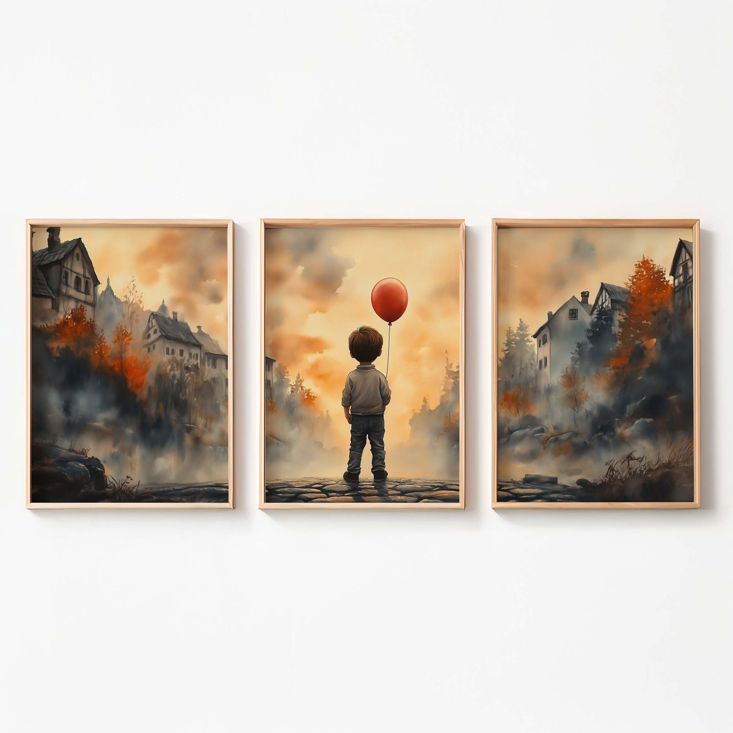 Terug naar collectie / Kinderkamer posters / Jongen met rode ballon in warm dorpstafereel