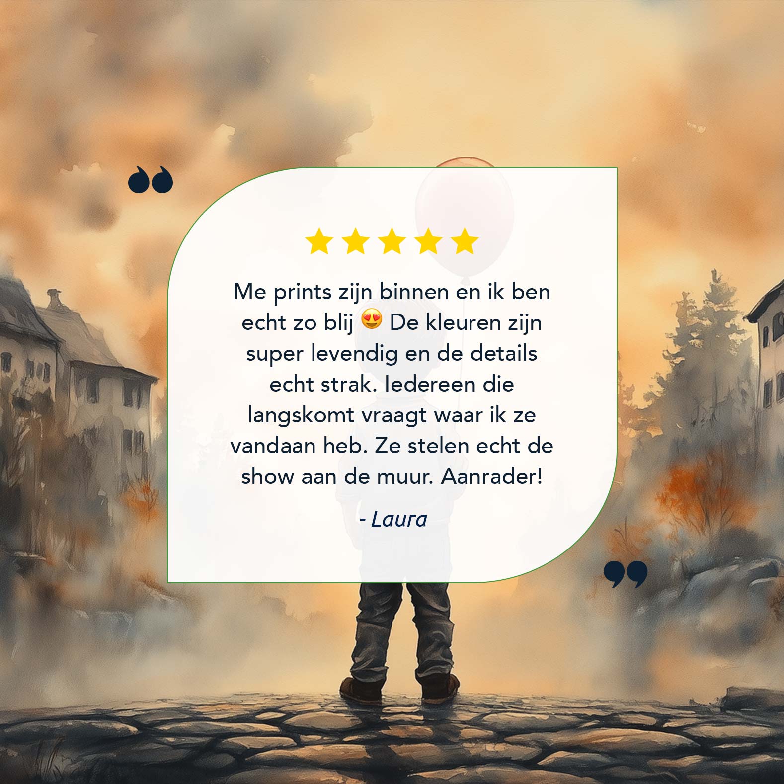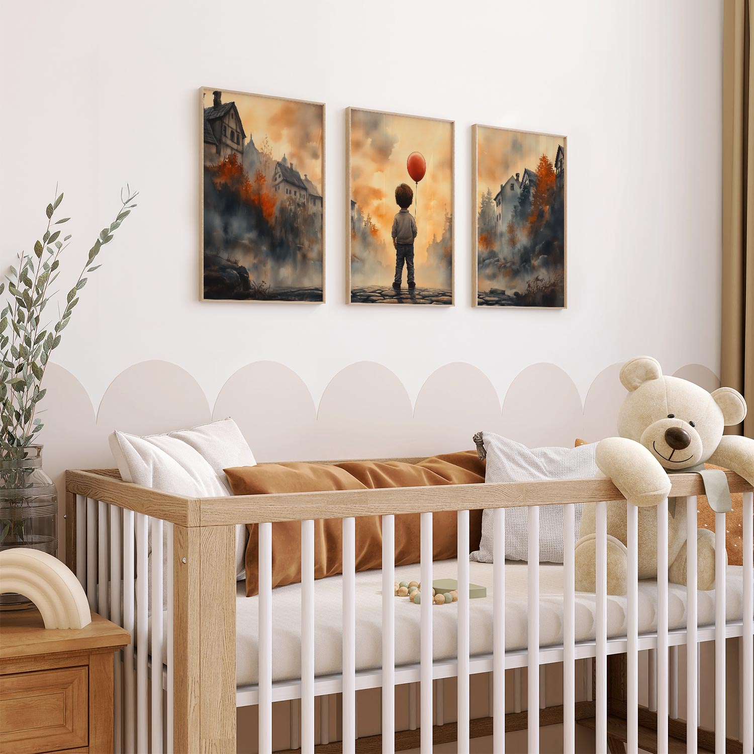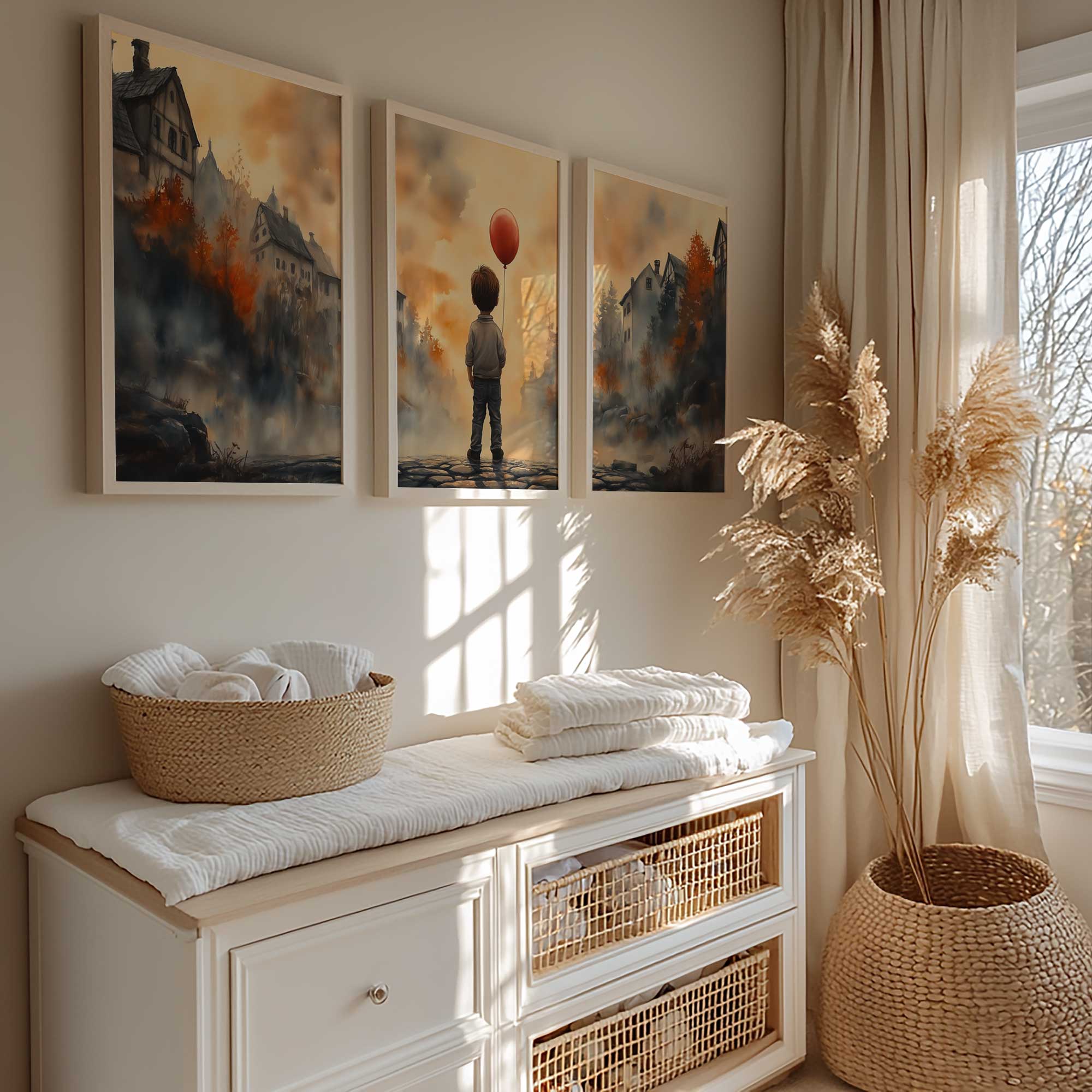 Terug naar collectie / Kinderkamer posters / Jongen met rode ballon in warm dorpstafereel