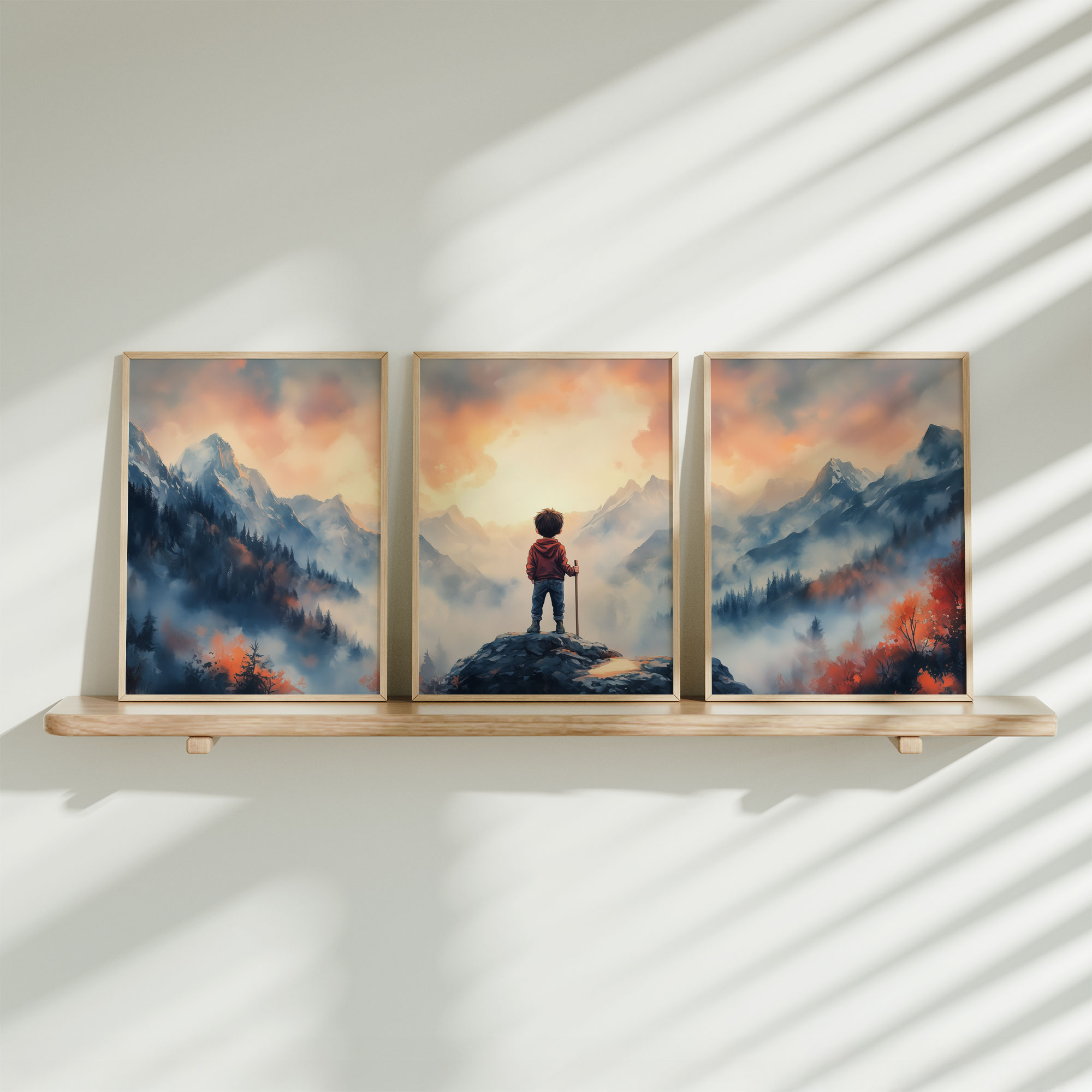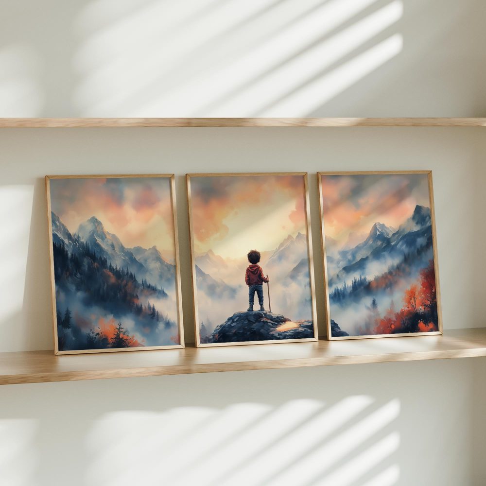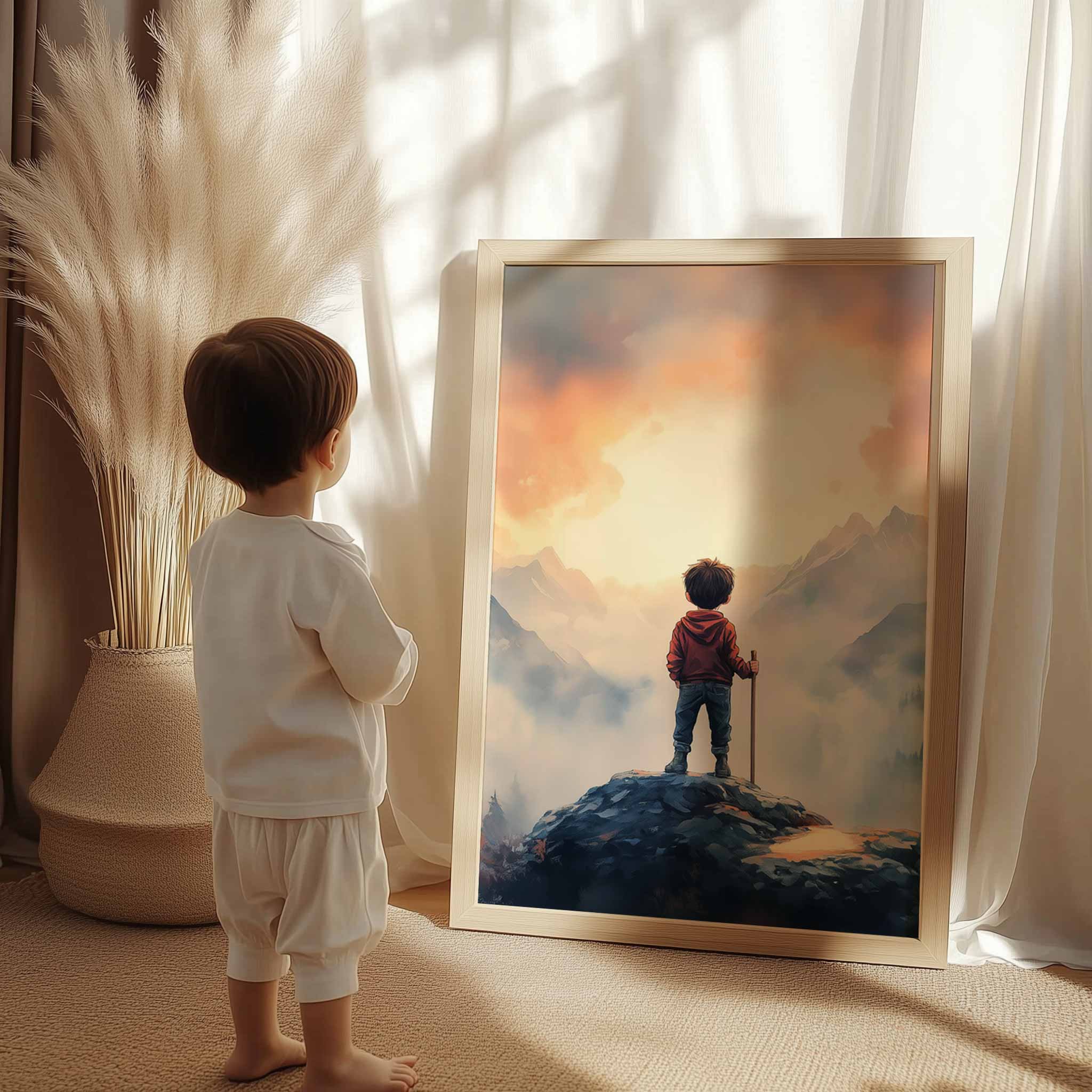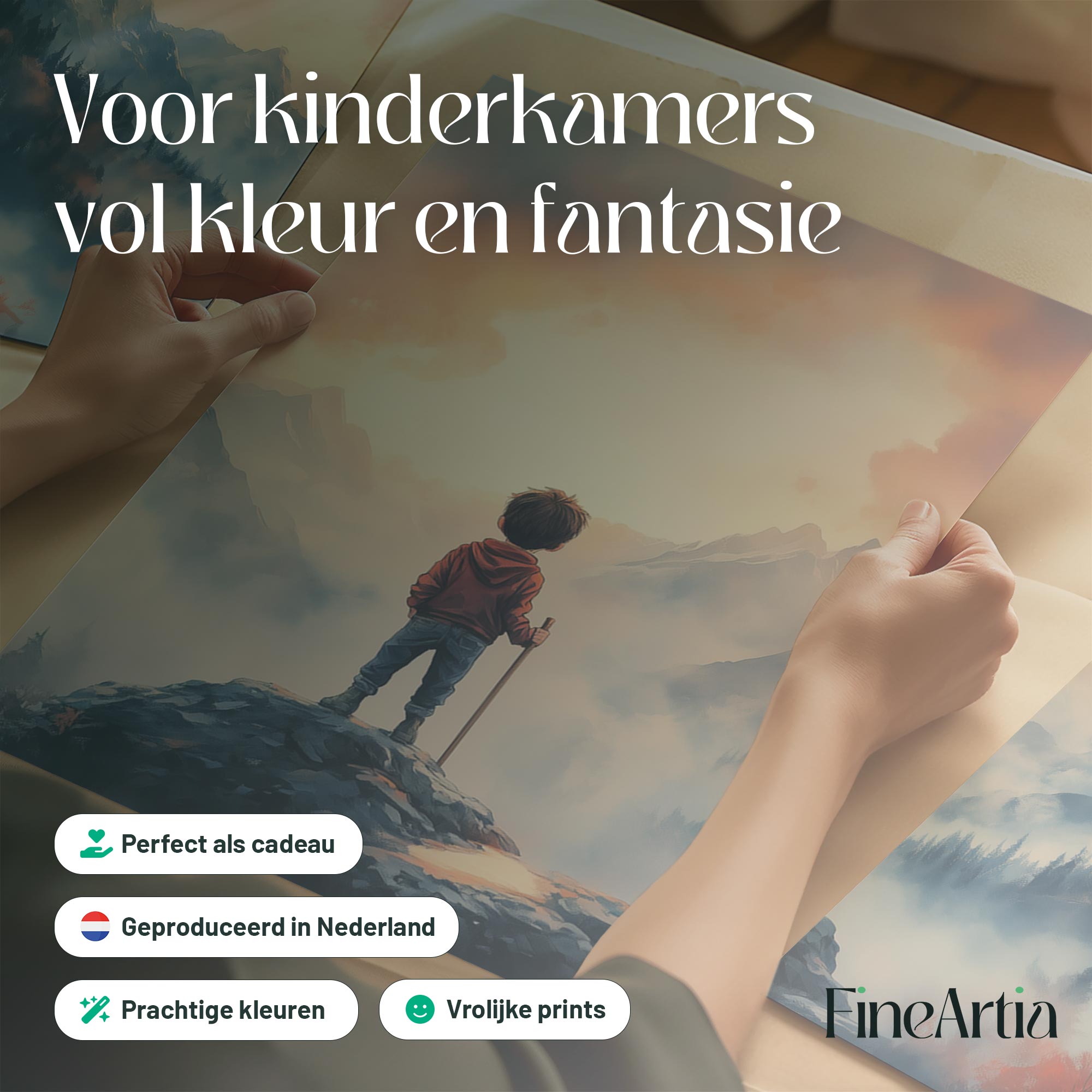 Terug naar collectie / Kinderkamer posters / Avontuurlijk posters / Jongen op ontdekking: berglandschap vol verwondering