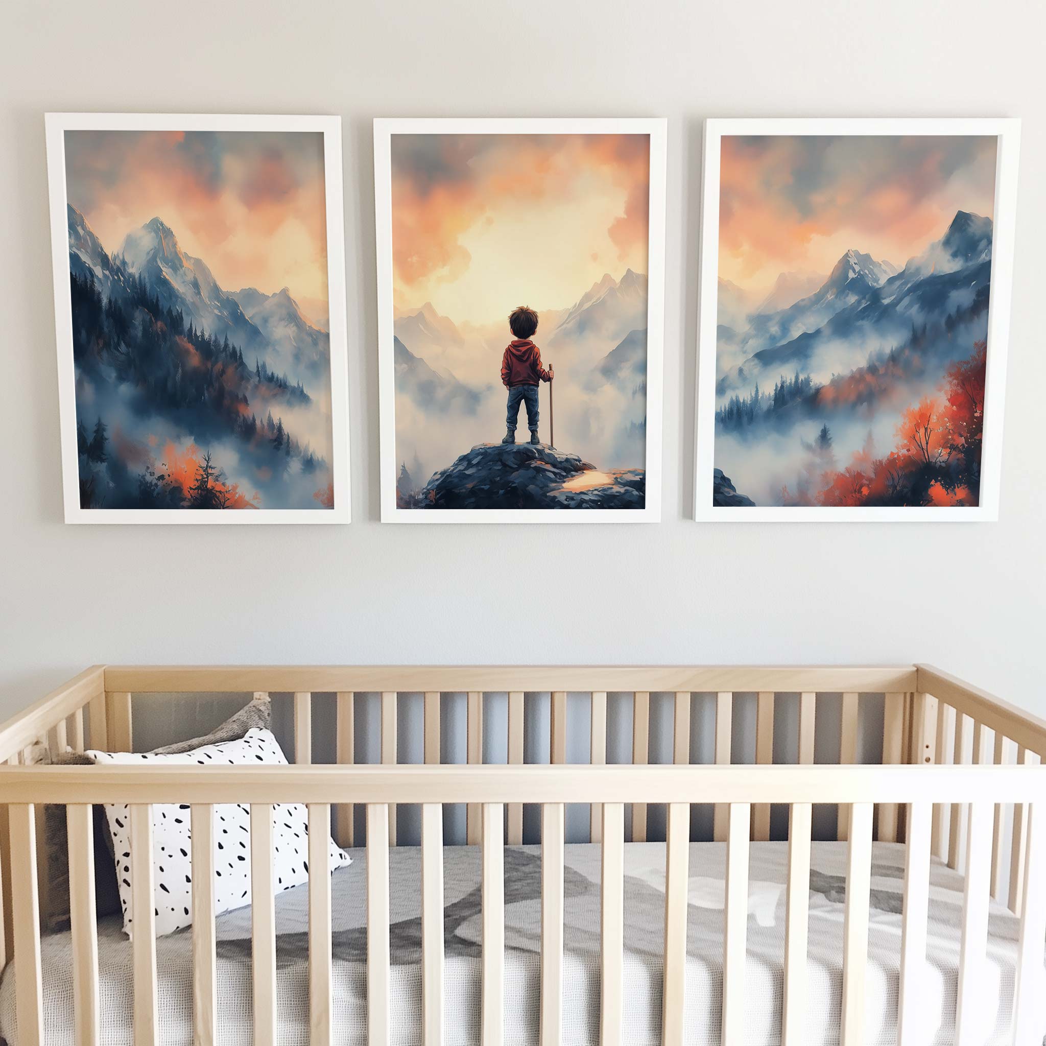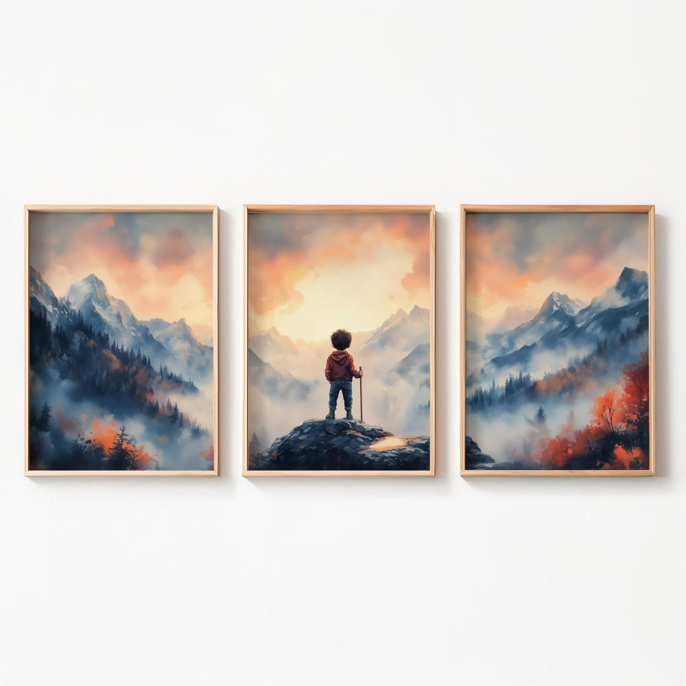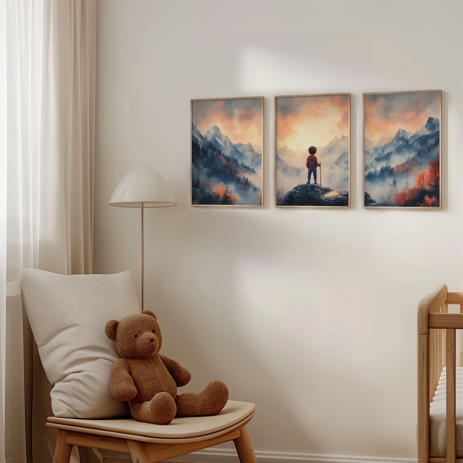 Terug naar collectie / Kinderkamer posters / Avontuurlijk posters / Jongen op ontdekking: berglandschap vol verwondering