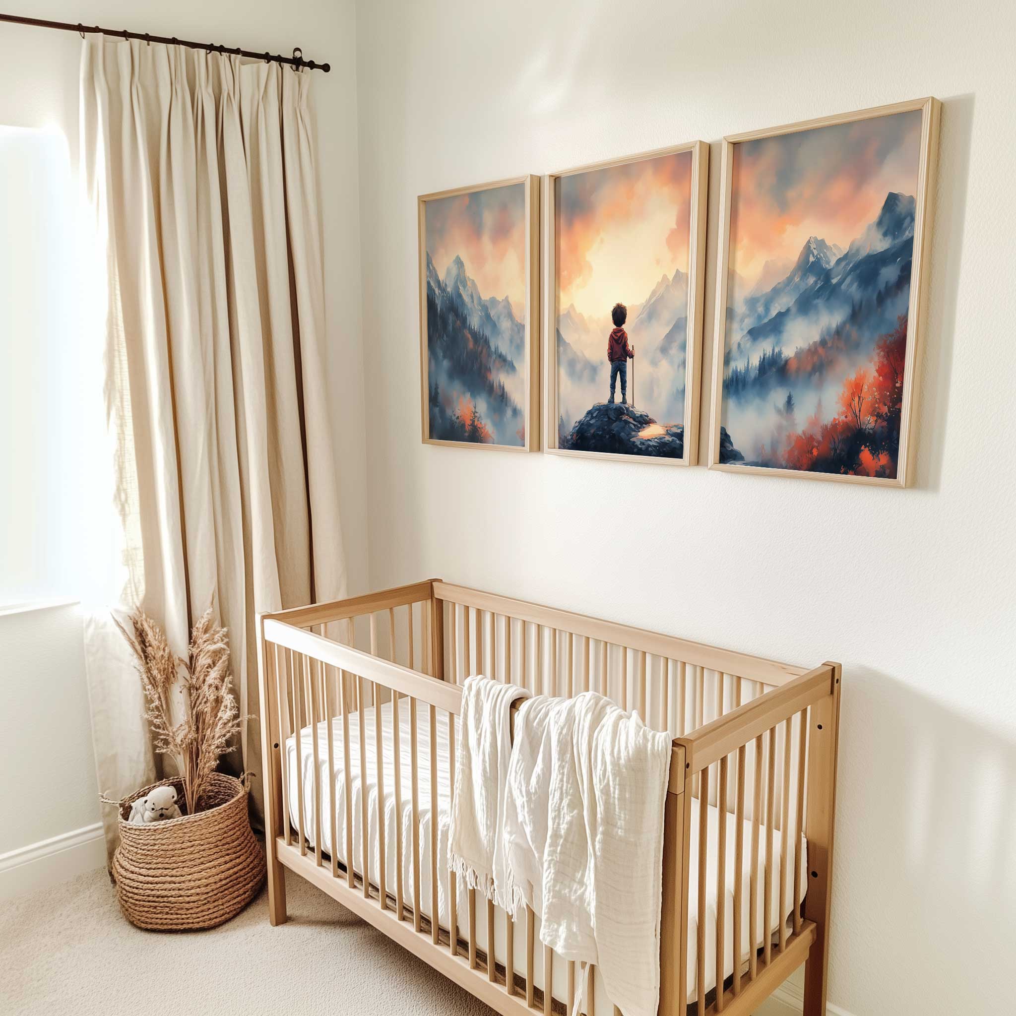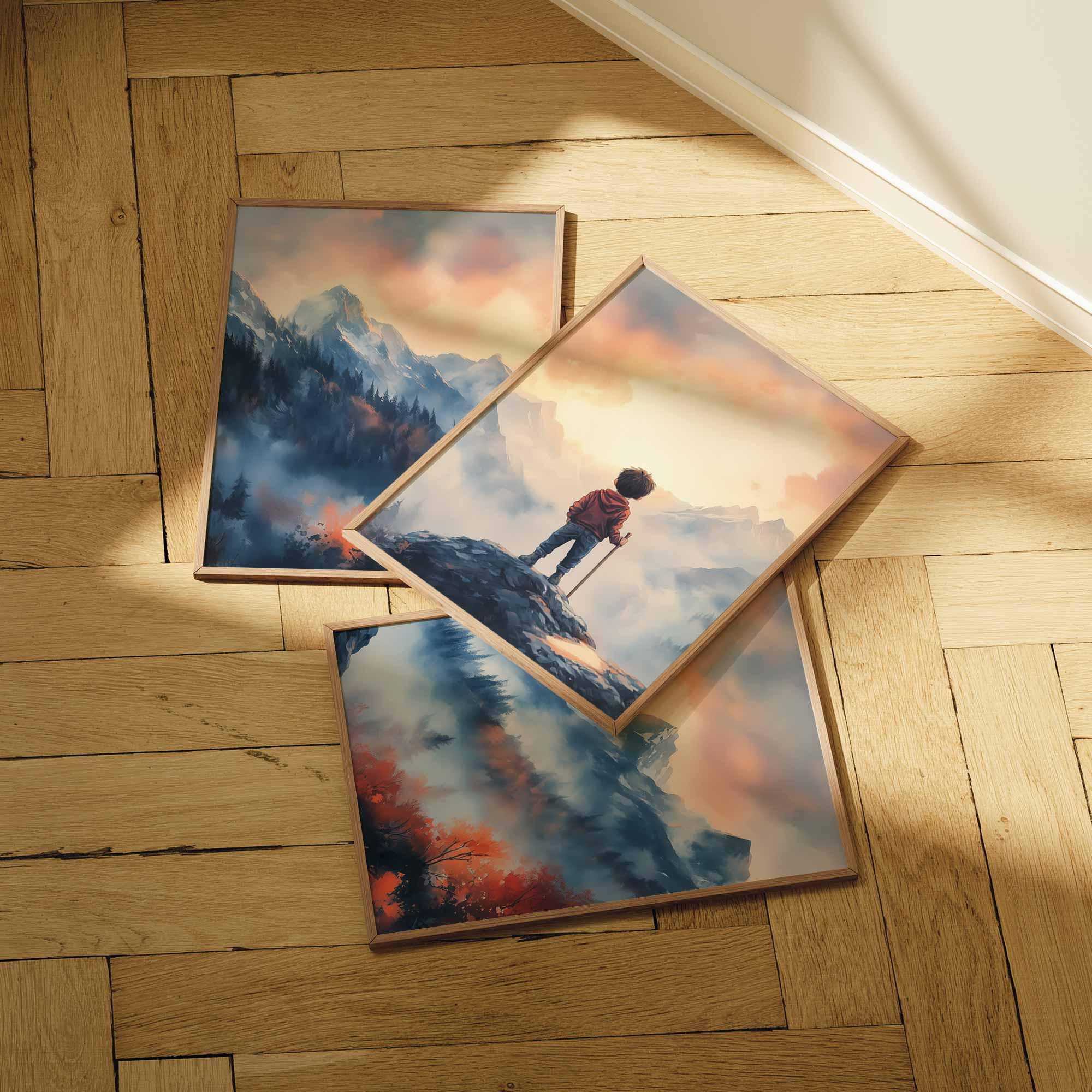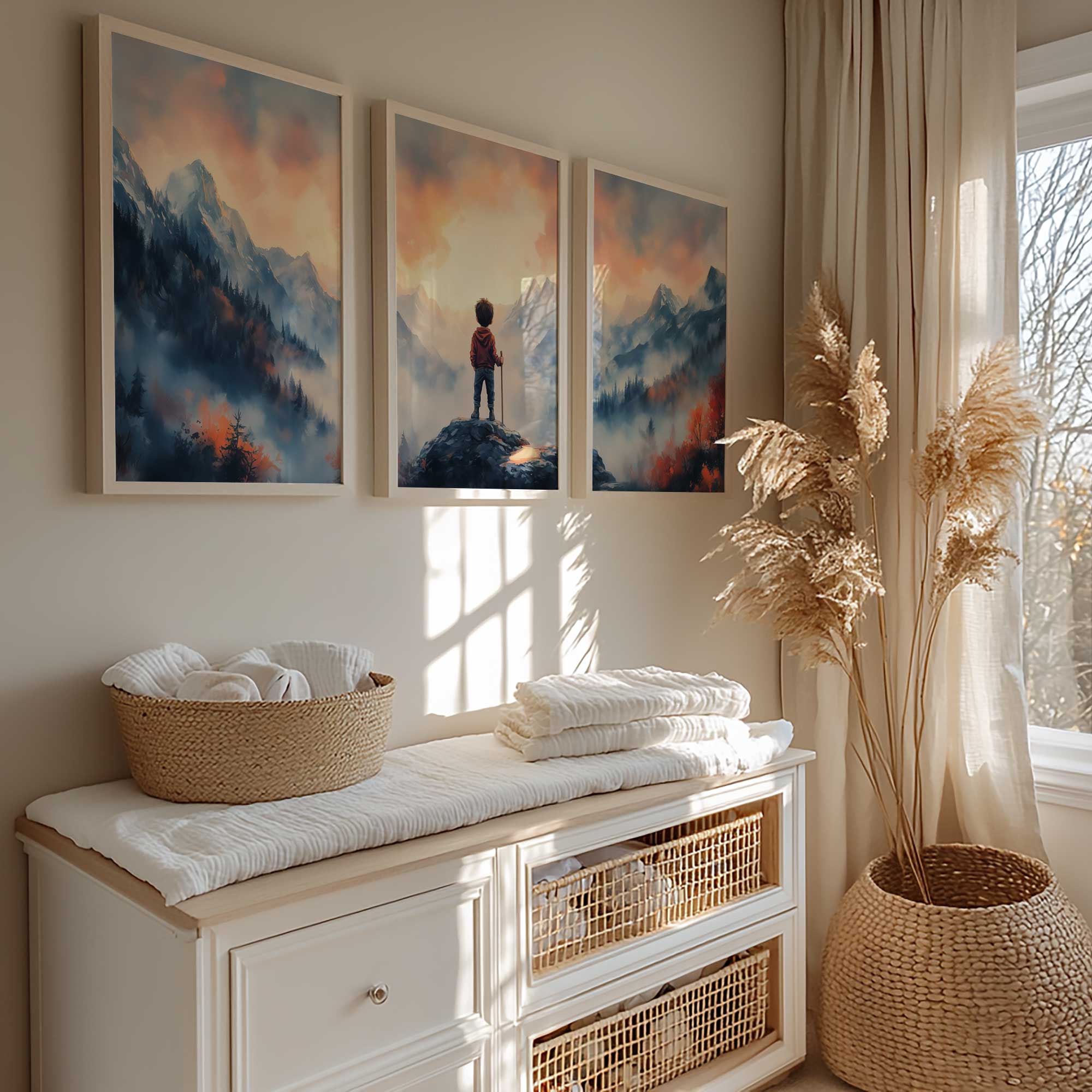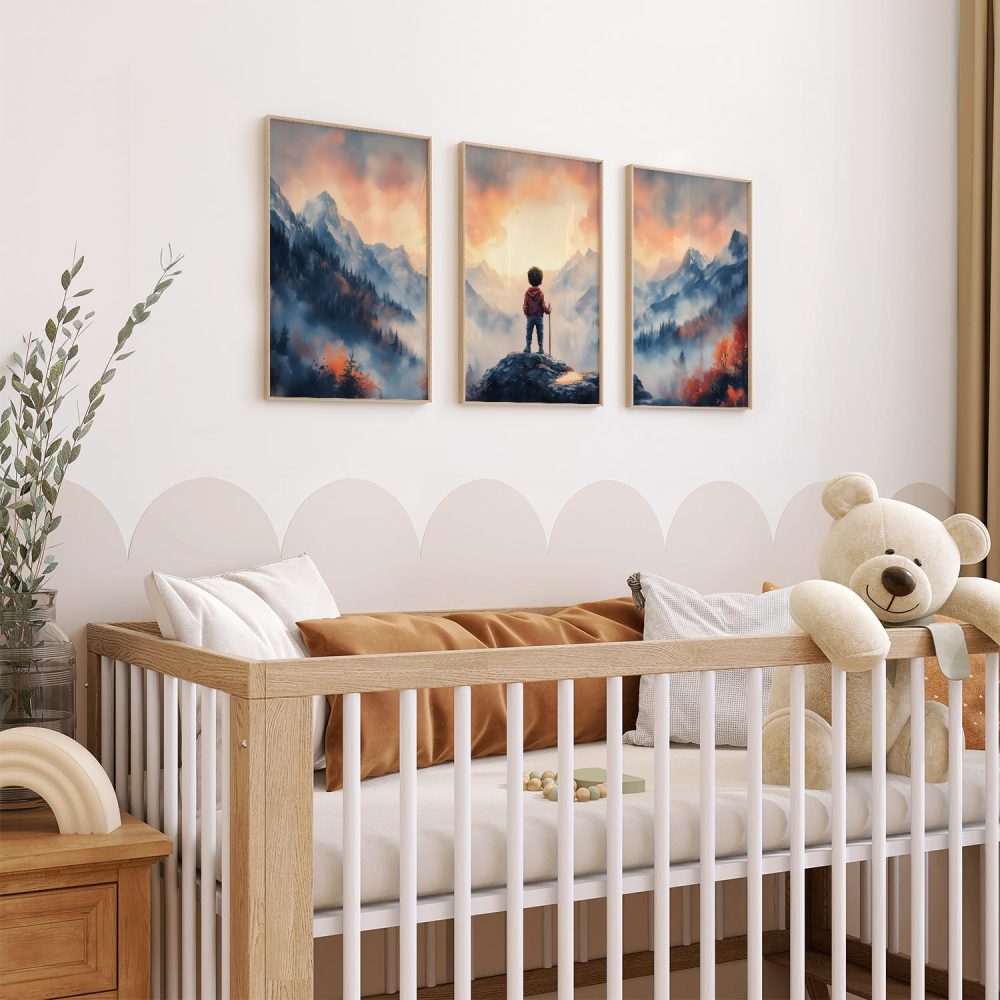 Terug naar collectie / Kinderkamer posters / Avontuurlijk posters / Jongen op ontdekking: berglandschap vol verwondering