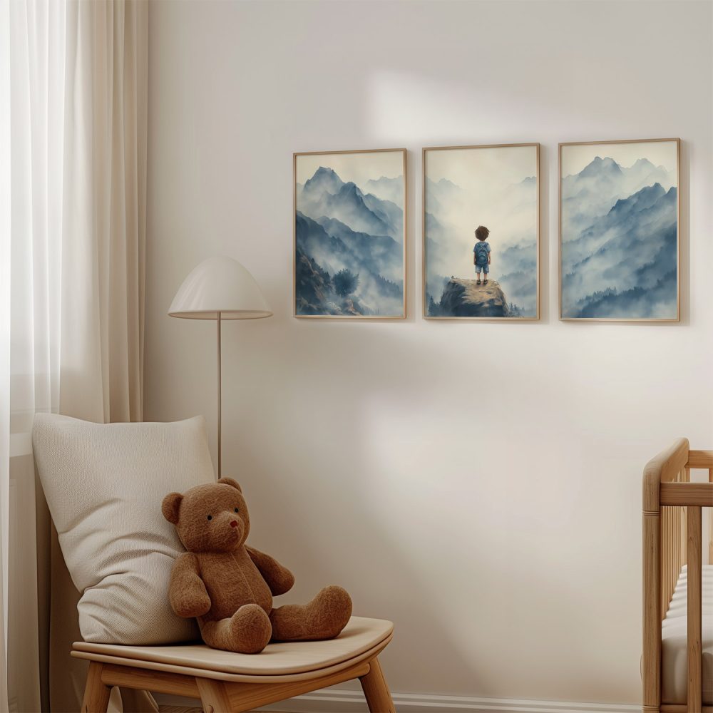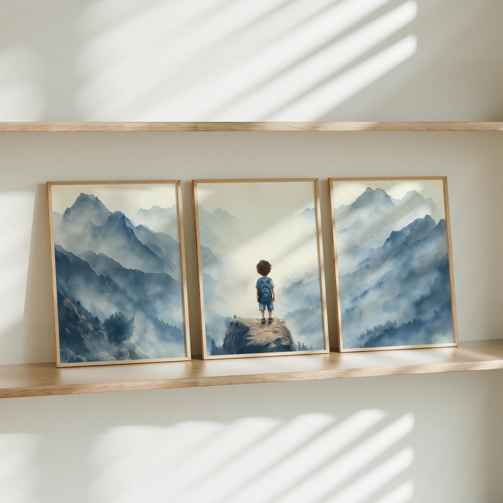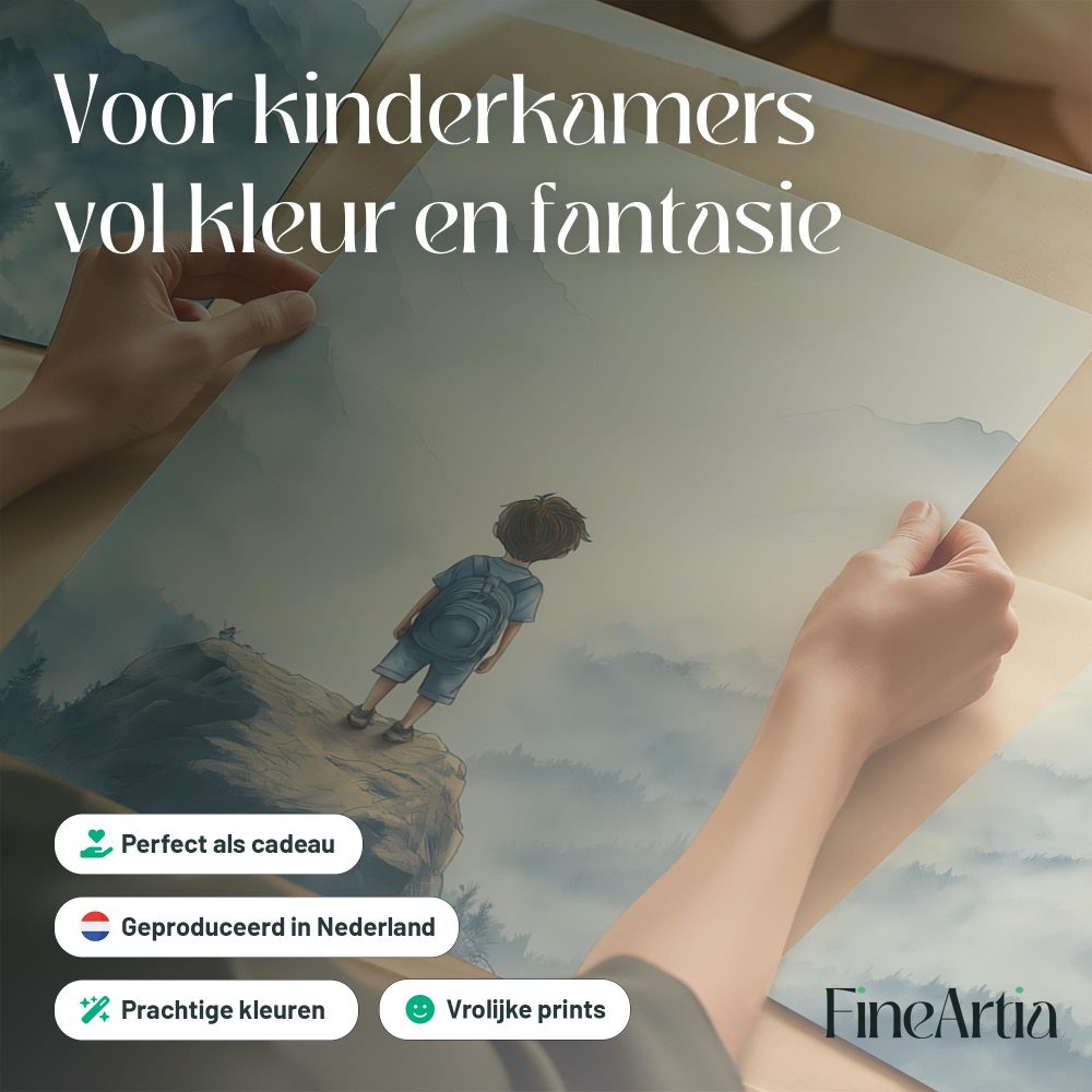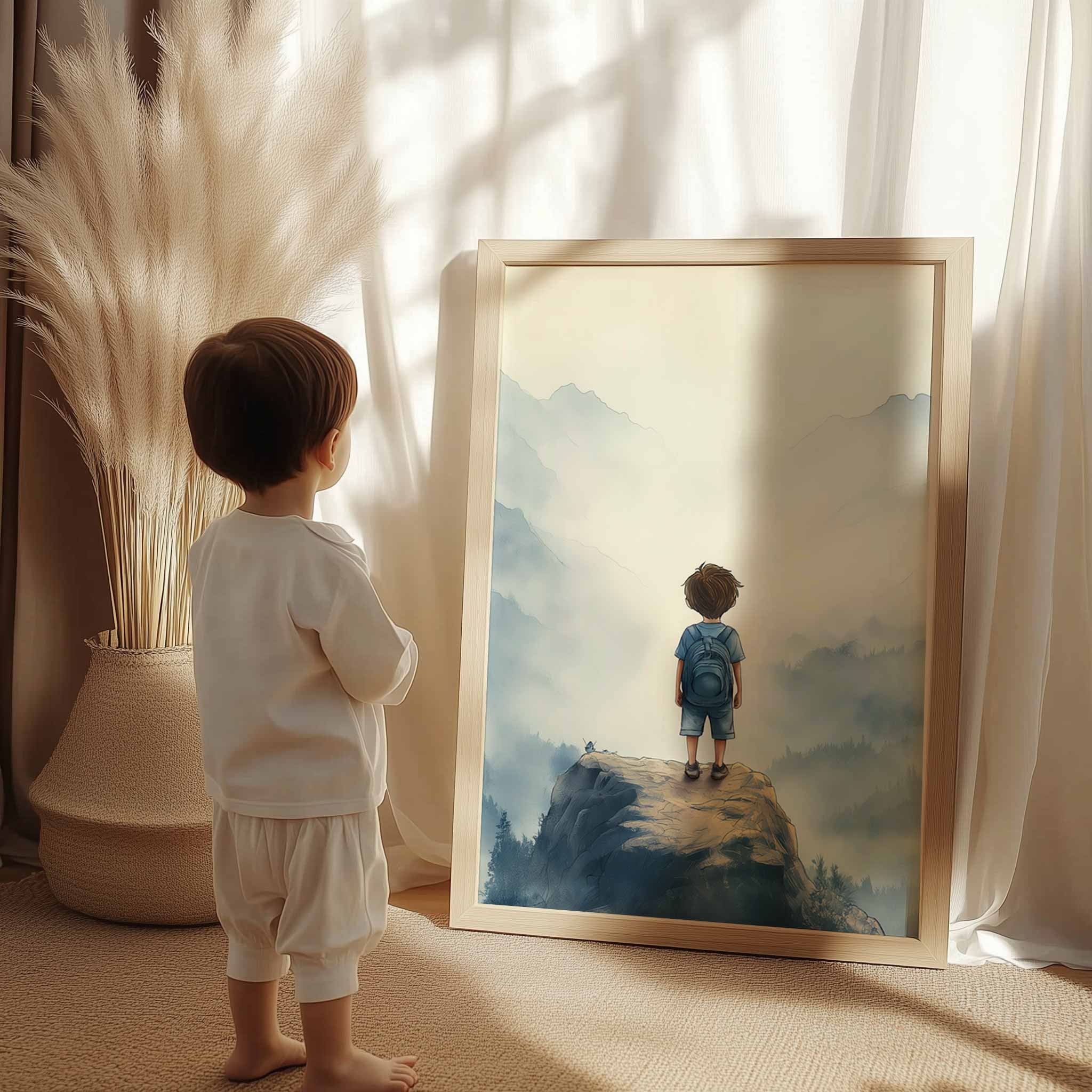 Terug naar collectie / Kinderkamer posters / Avontuurlijk posters / Jongen op rots – Avontuurlijk berglandschap met rugzak