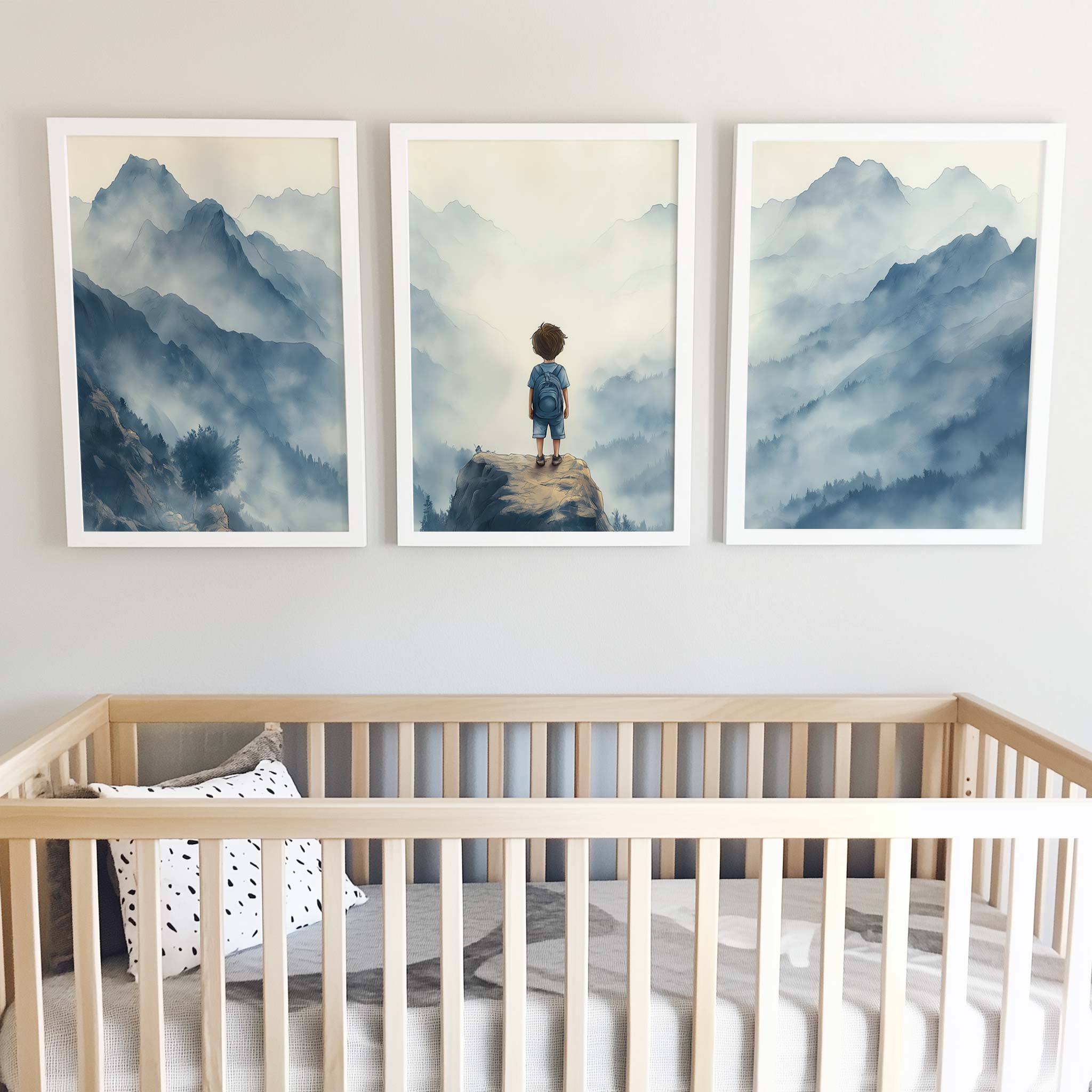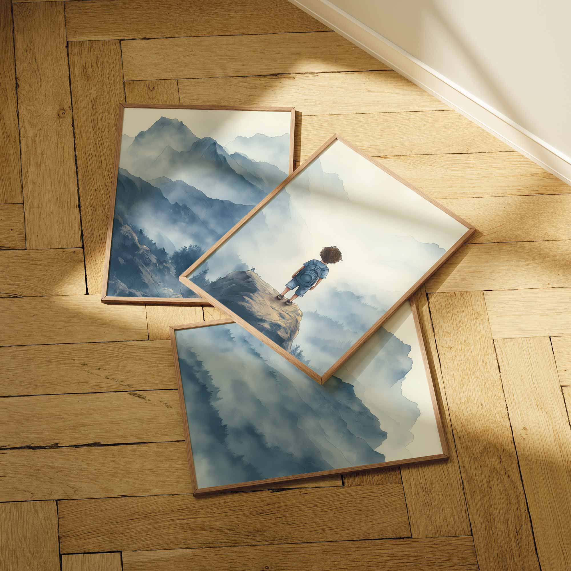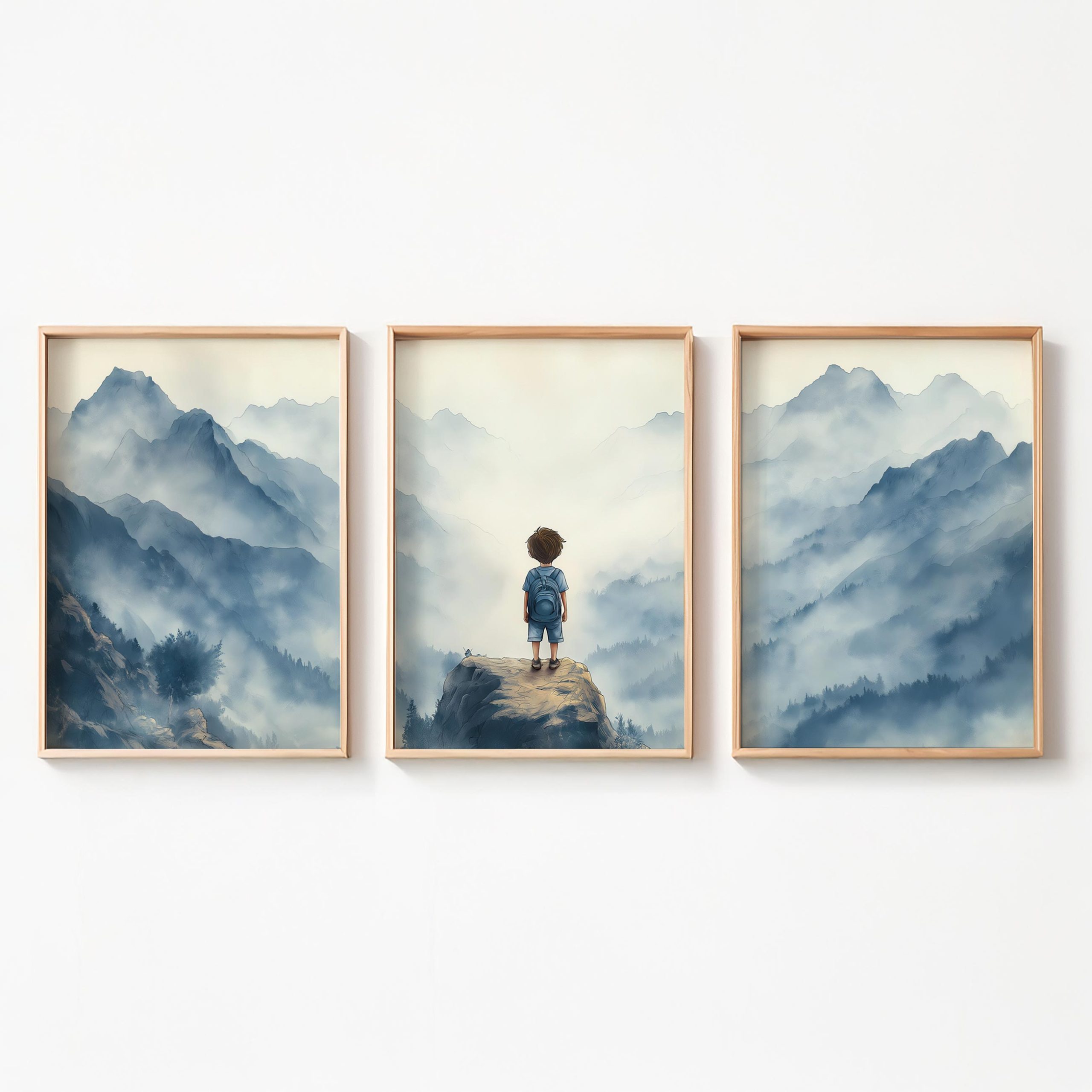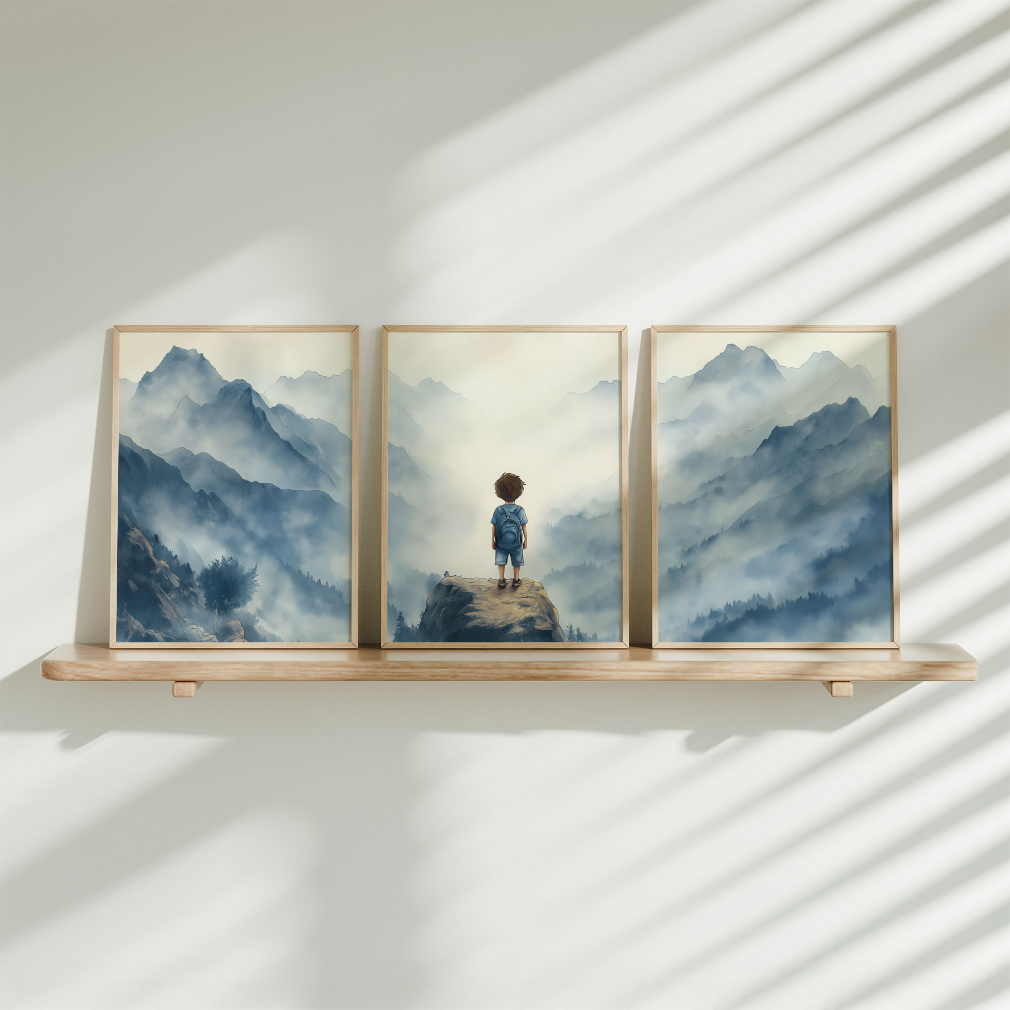 Terug naar collectie / Kinderkamer posters / Avontuurlijk posters / Jongen op rots – Avontuurlijk berglandschap met rugzak