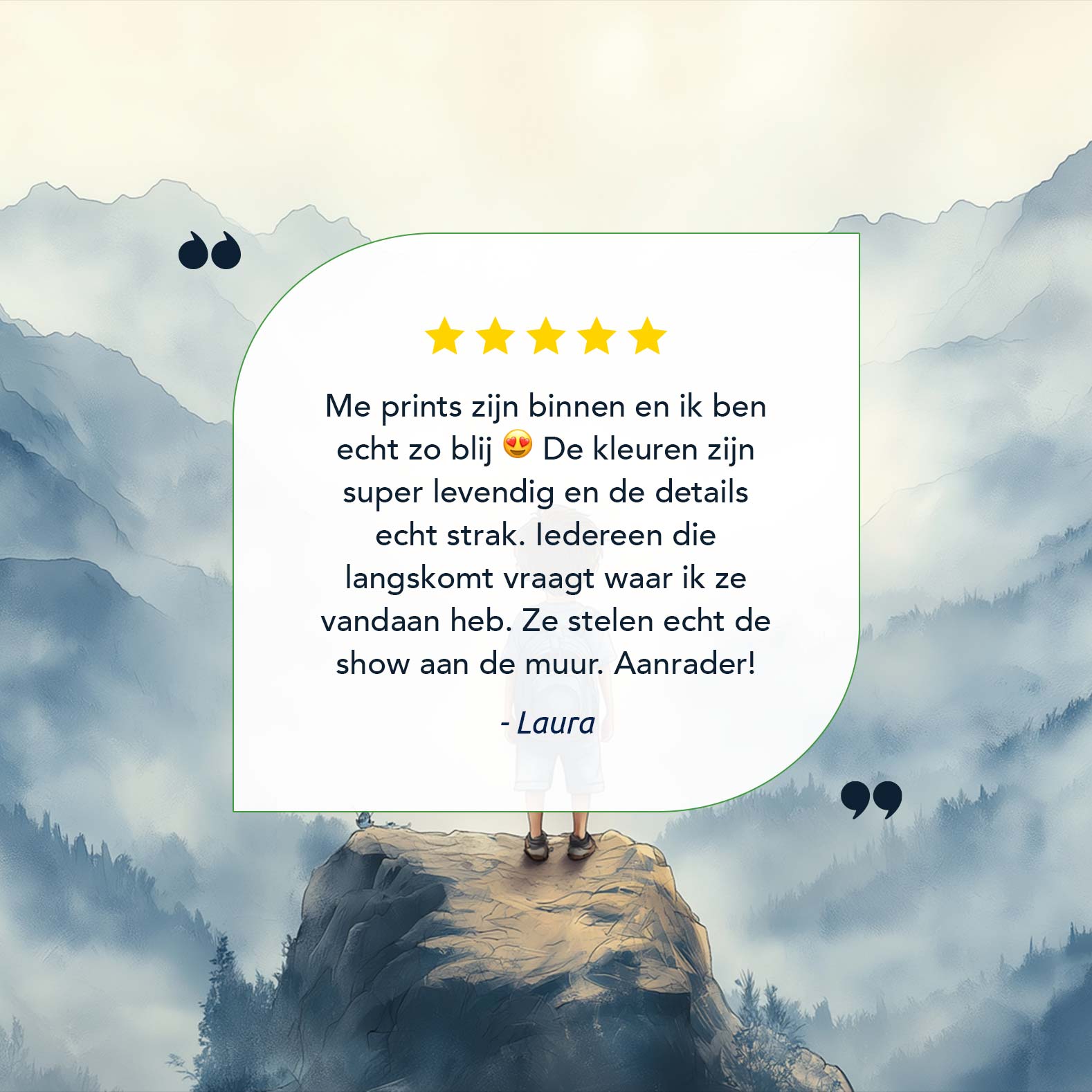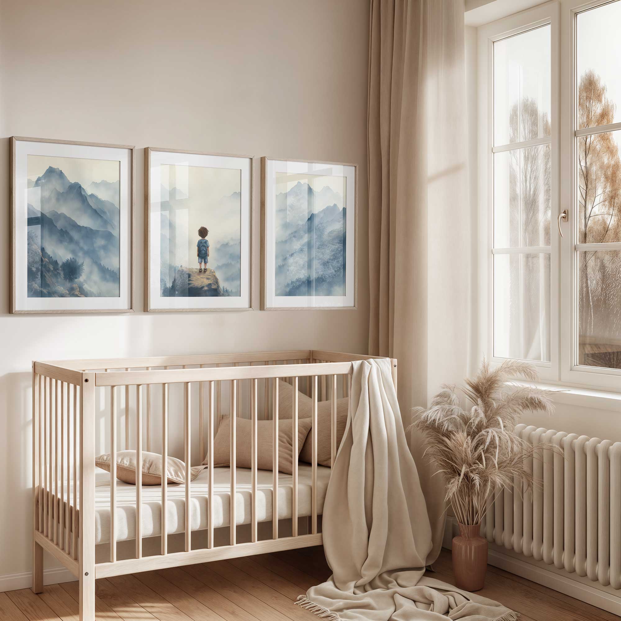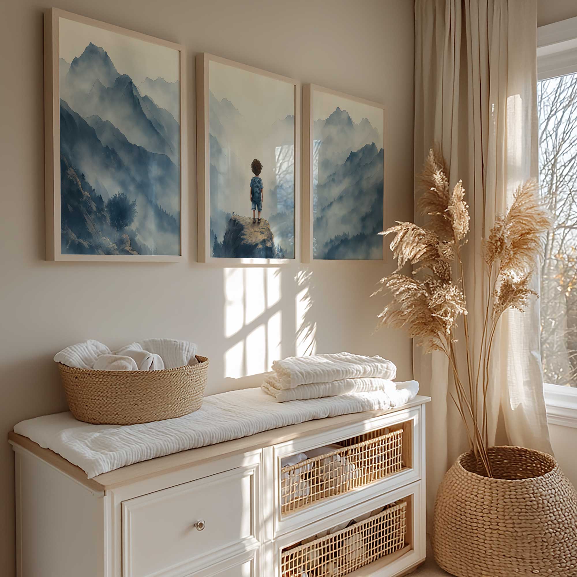 Terug naar collectie / Kinderkamer posters / Avontuurlijk posters / Jongen op rots – Avontuurlijk berglandschap met rugzak