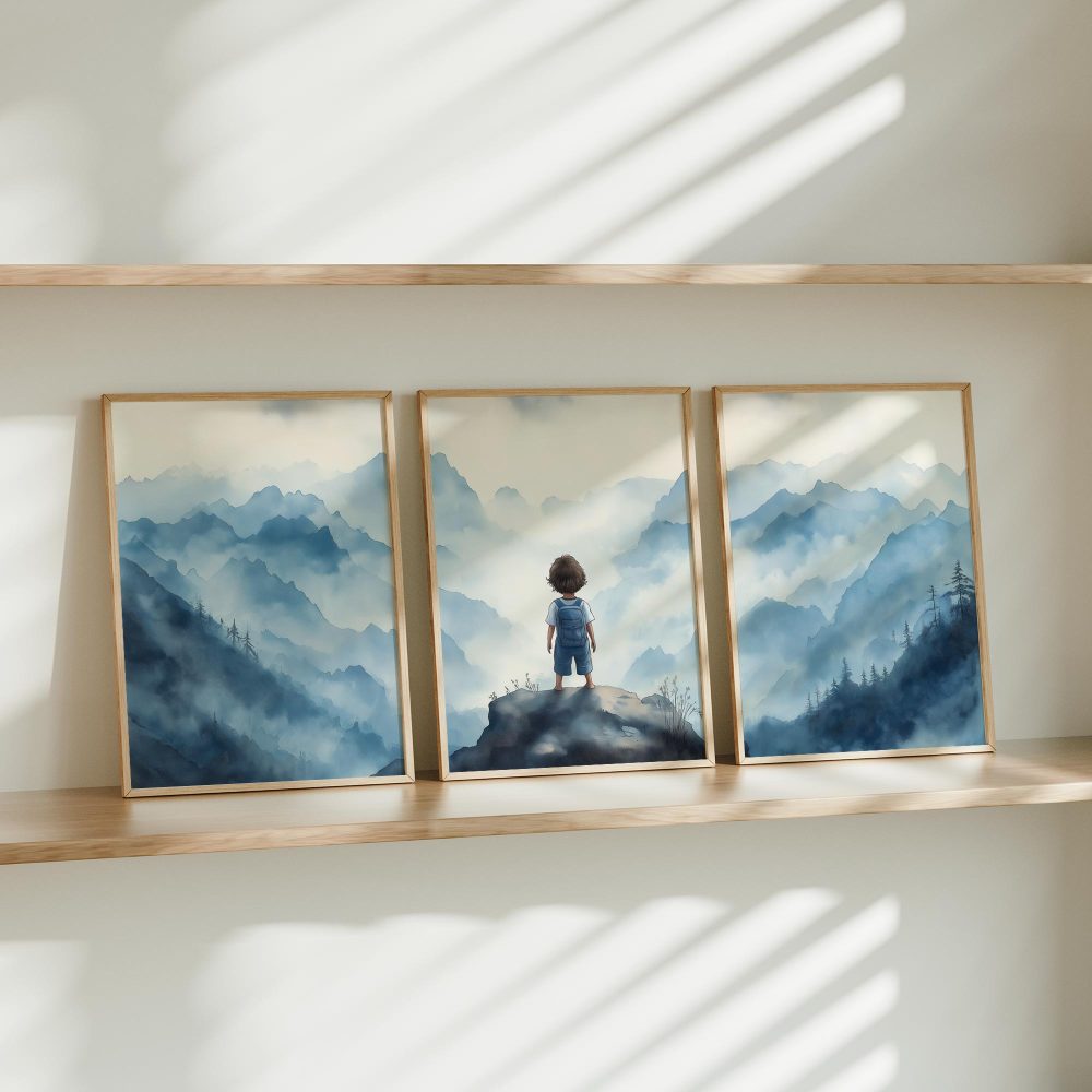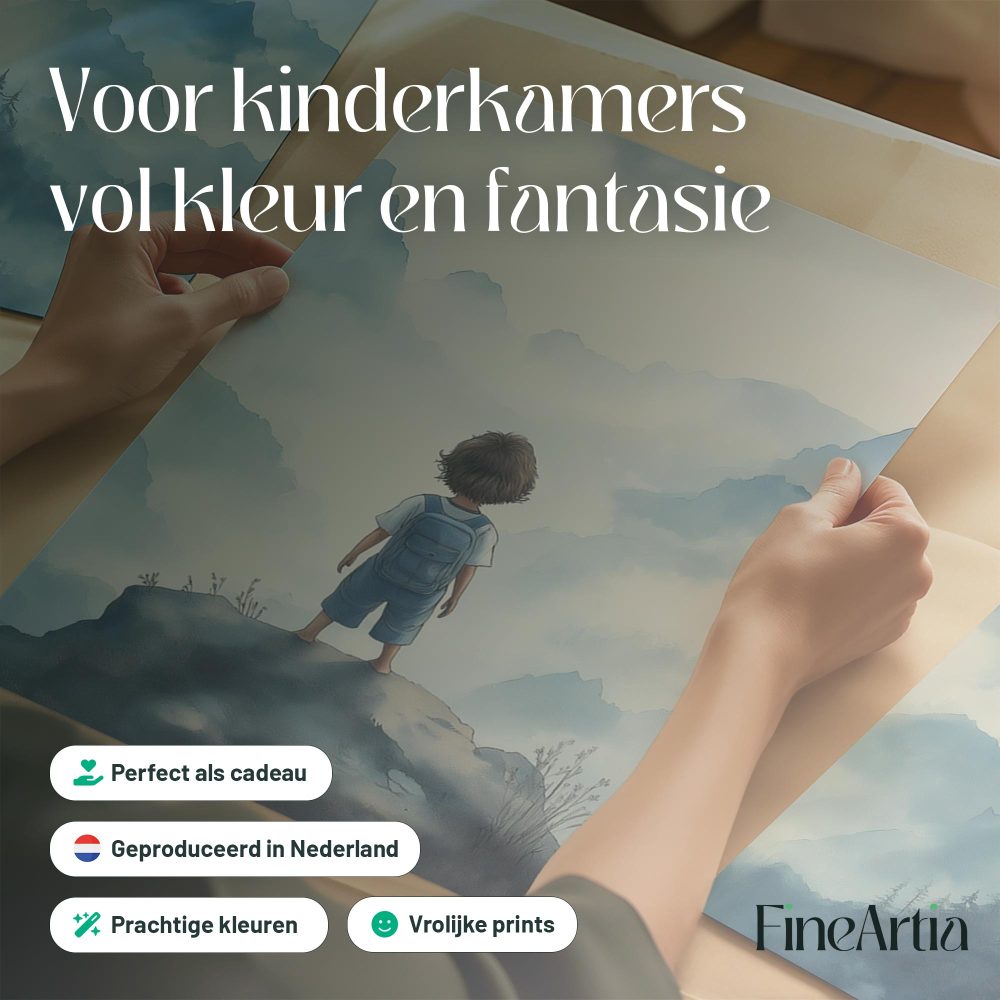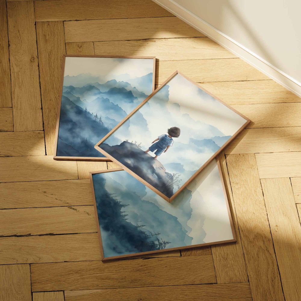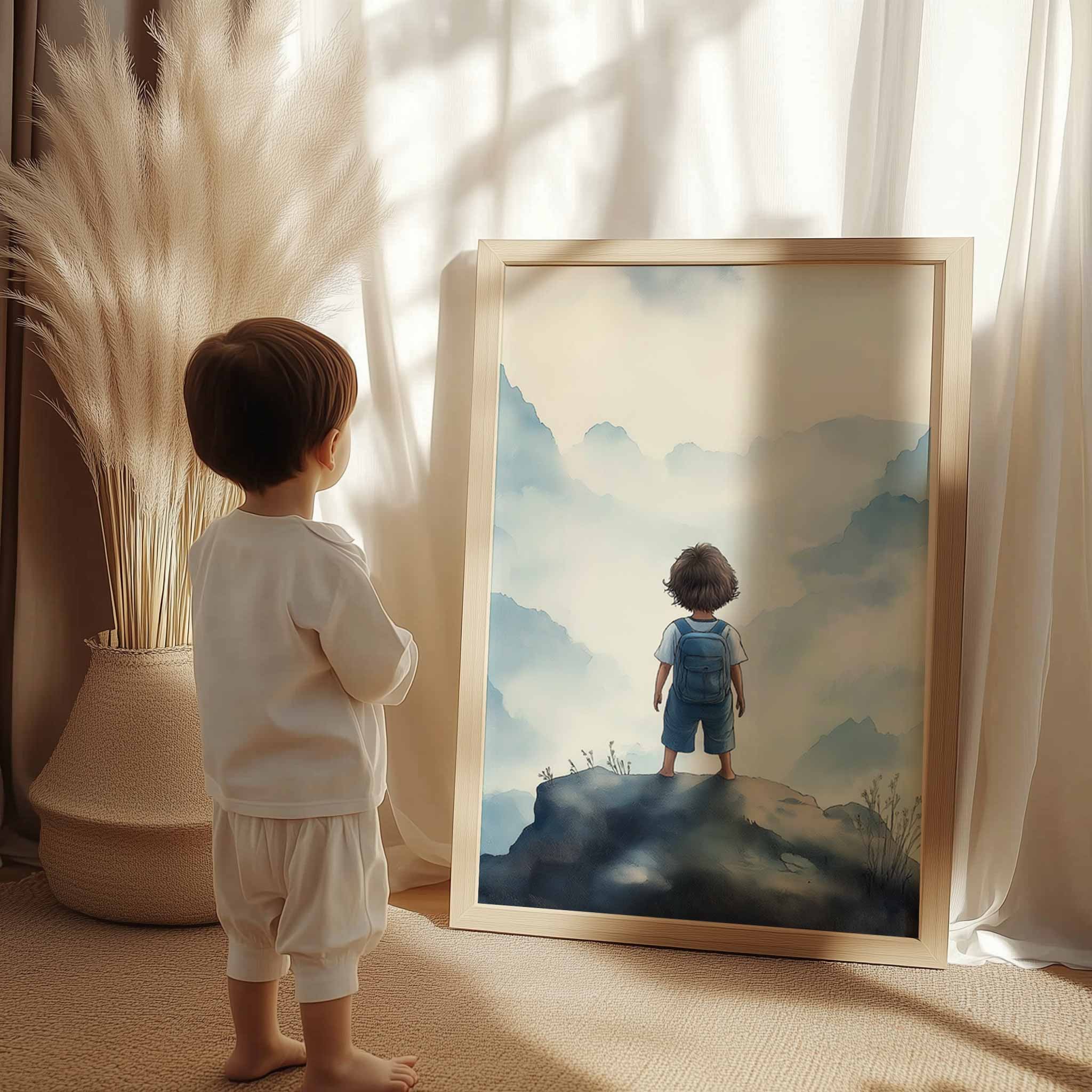 Terug naar collectie / Kinderkamer posters / Avontuurlijk posters / Jongen op rots – Dromerig berglandschap in waterverf