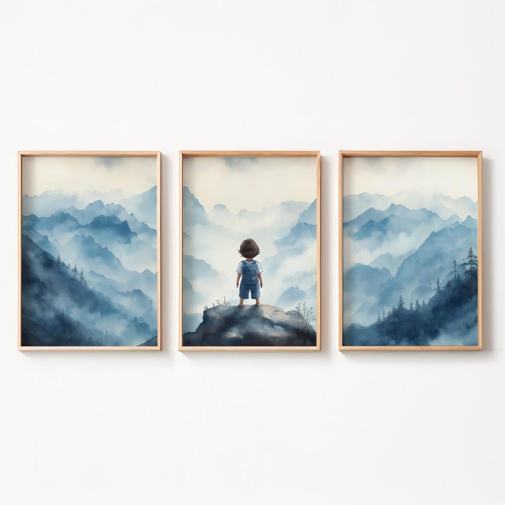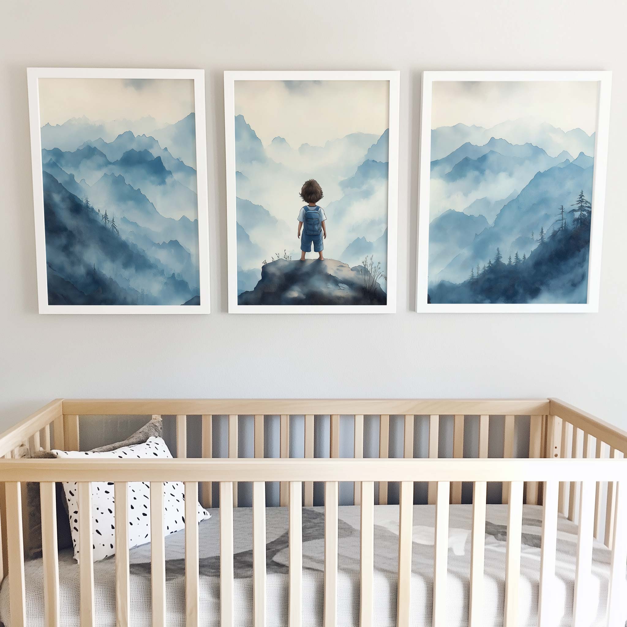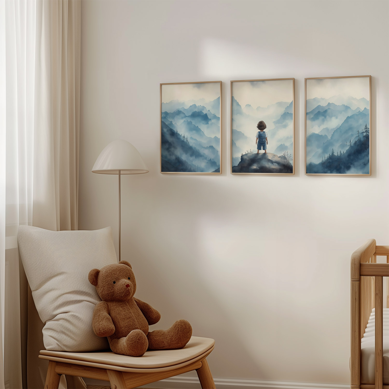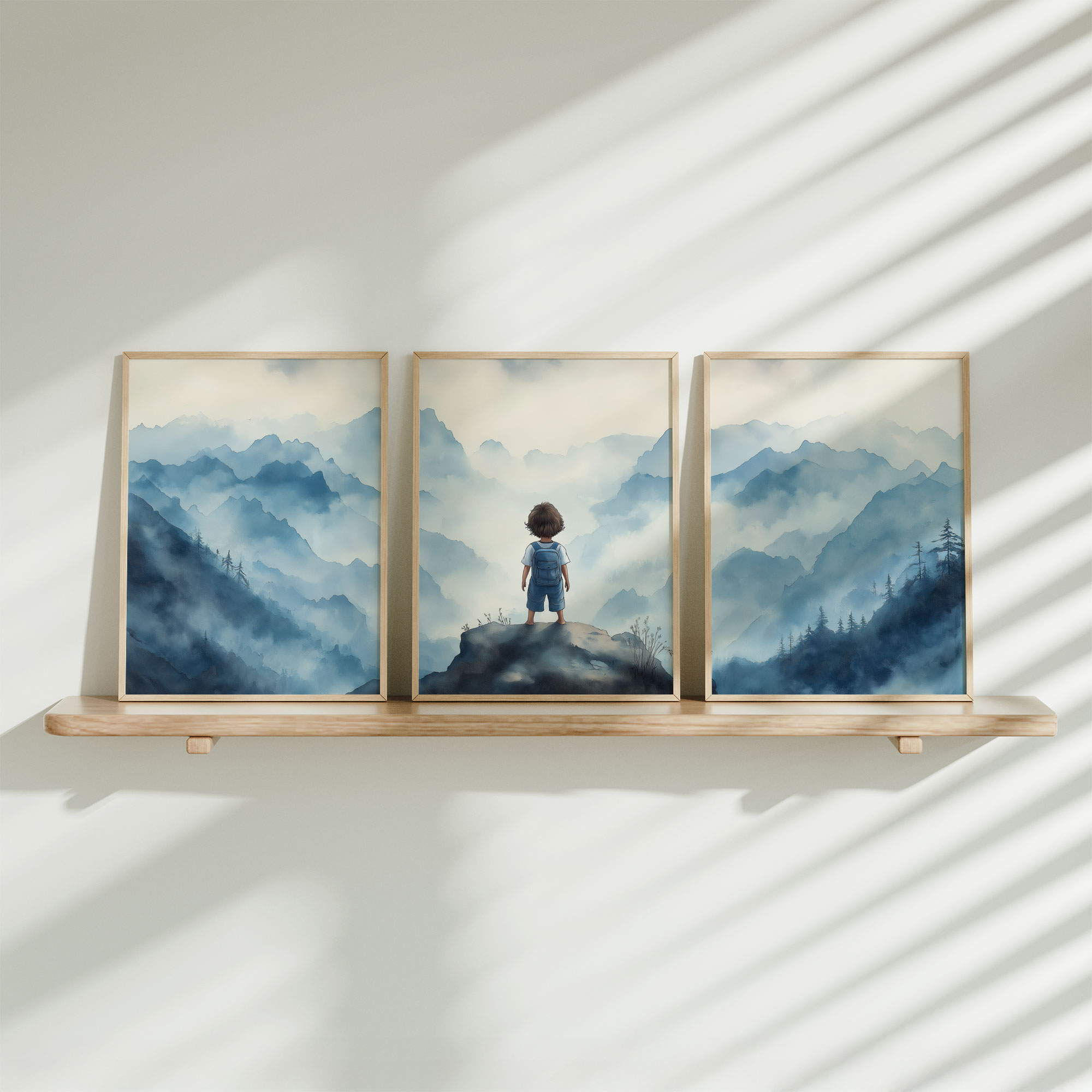 Terug naar collectie / Kinderkamer posters / Avontuurlijk posters / Jongen op rots – Dromerig berglandschap in waterverf
