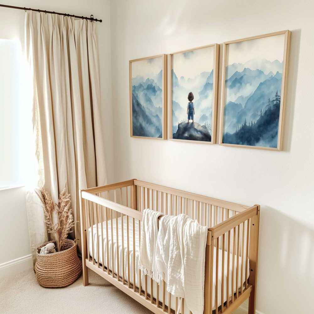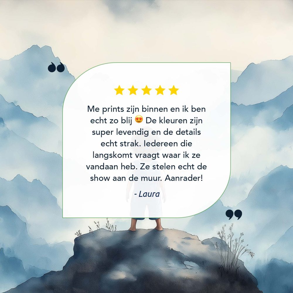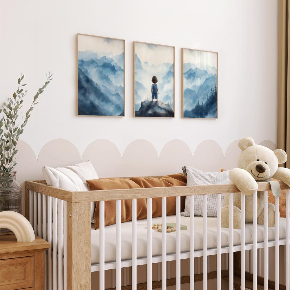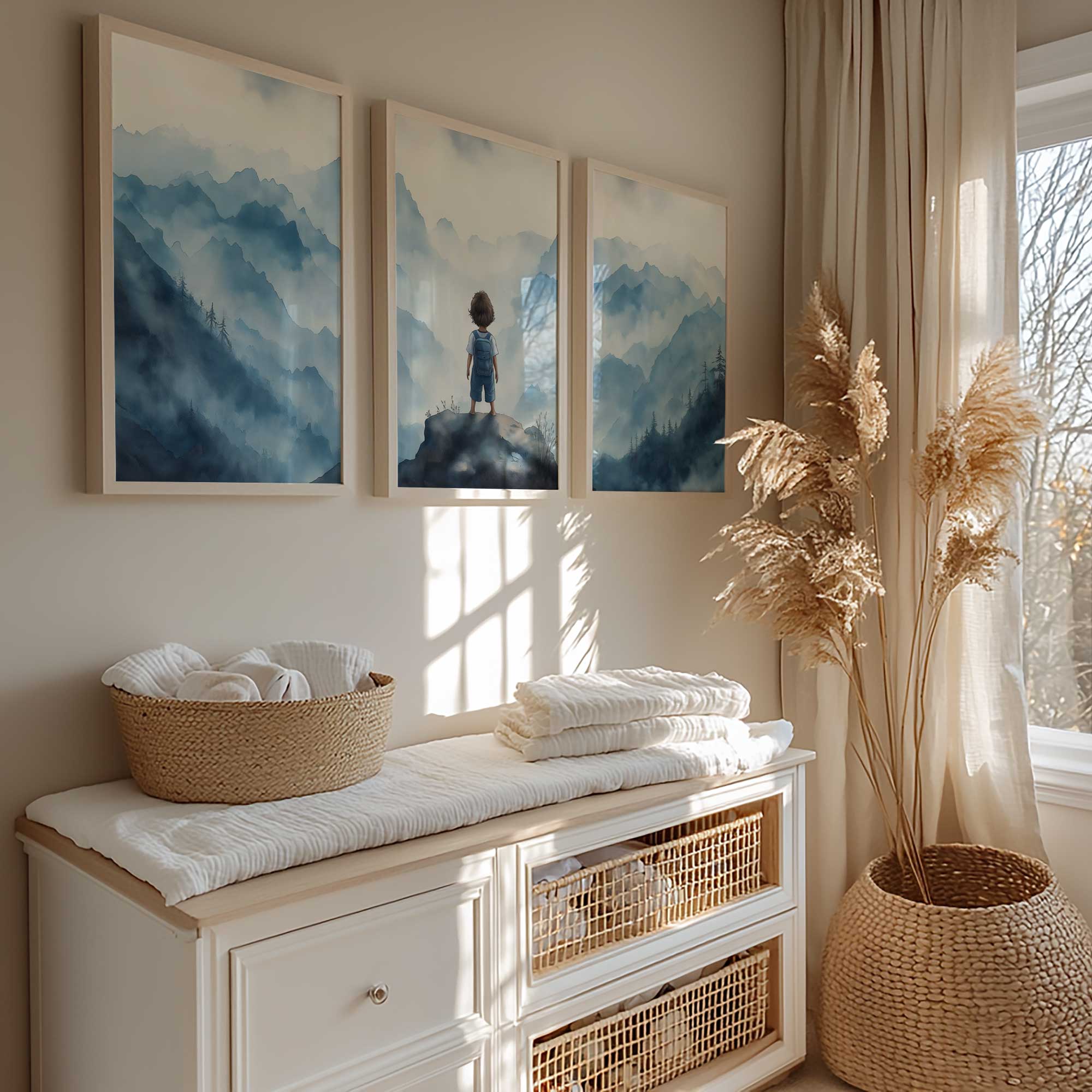 Terug naar collectie / Kinderkamer posters / Avontuurlijk posters / Jongen op rots – Dromerig berglandschap in waterverf