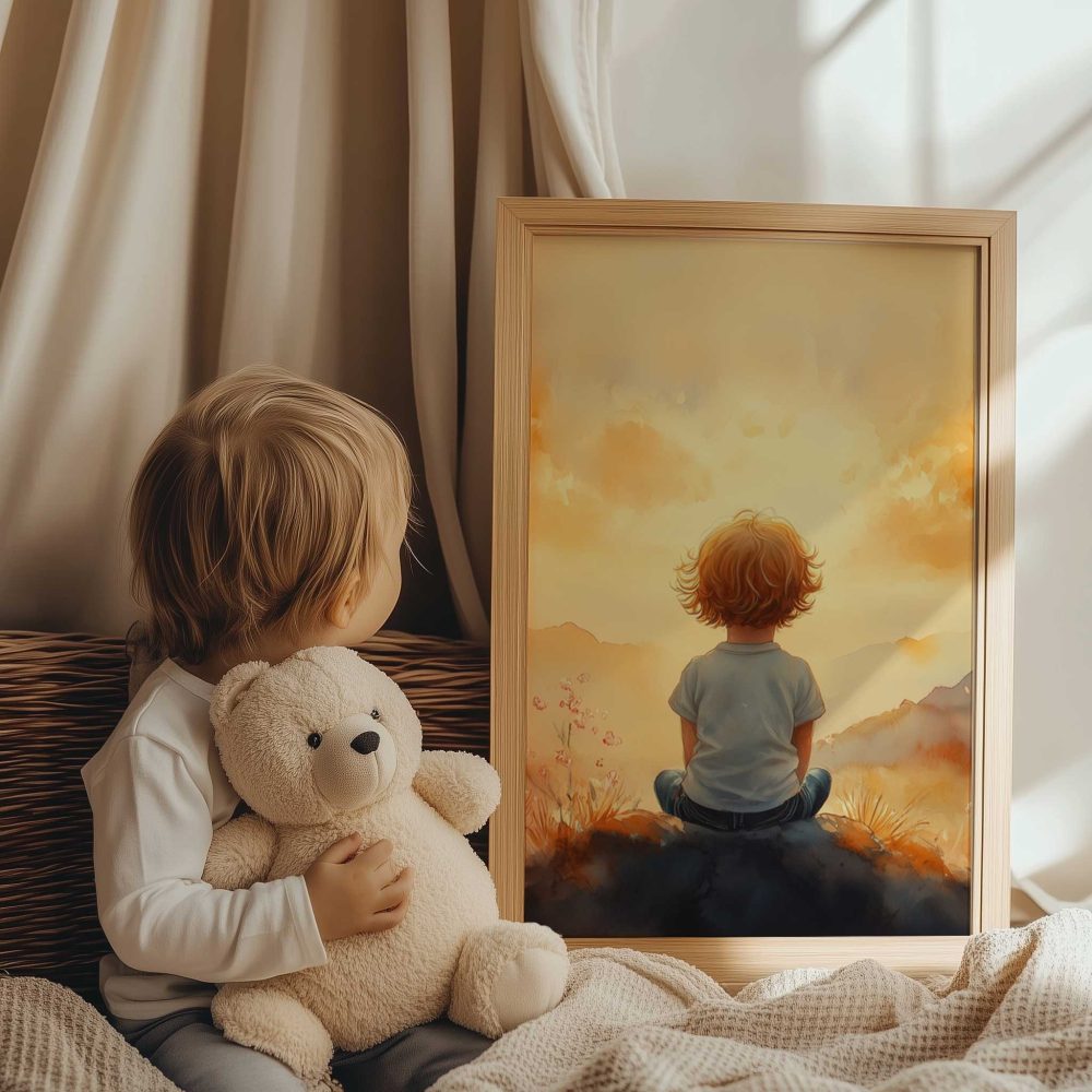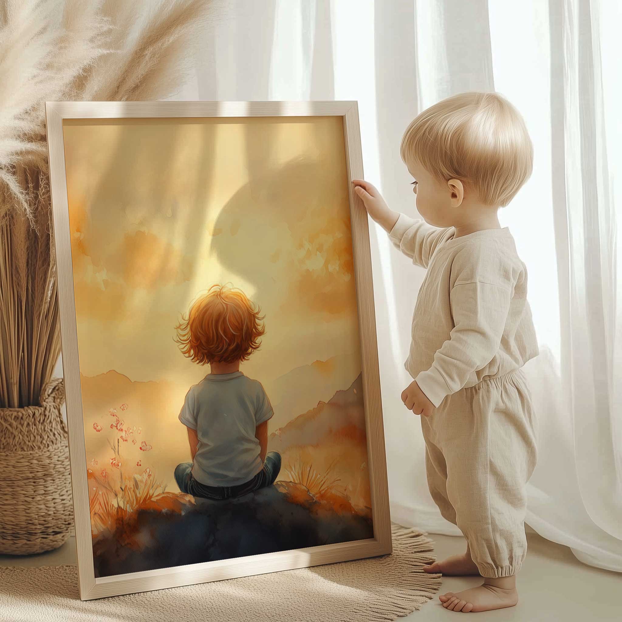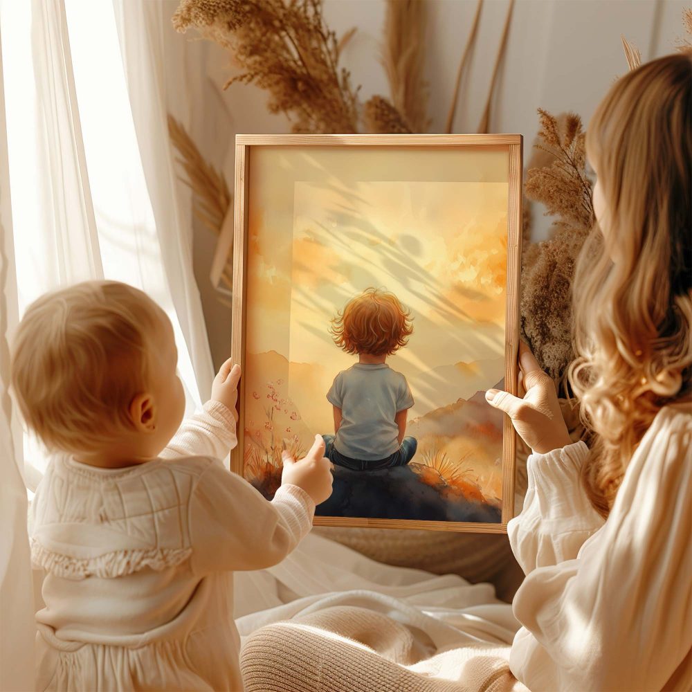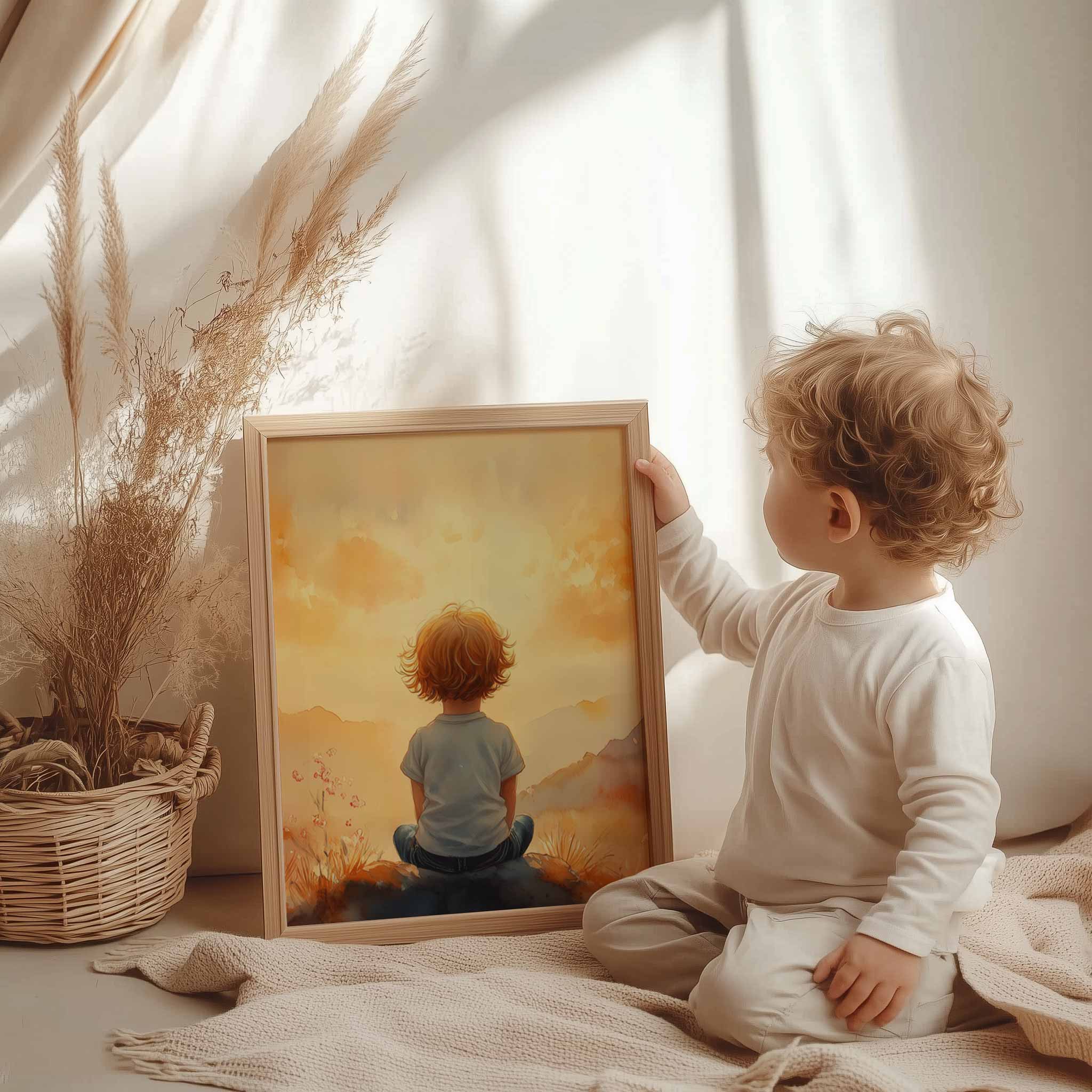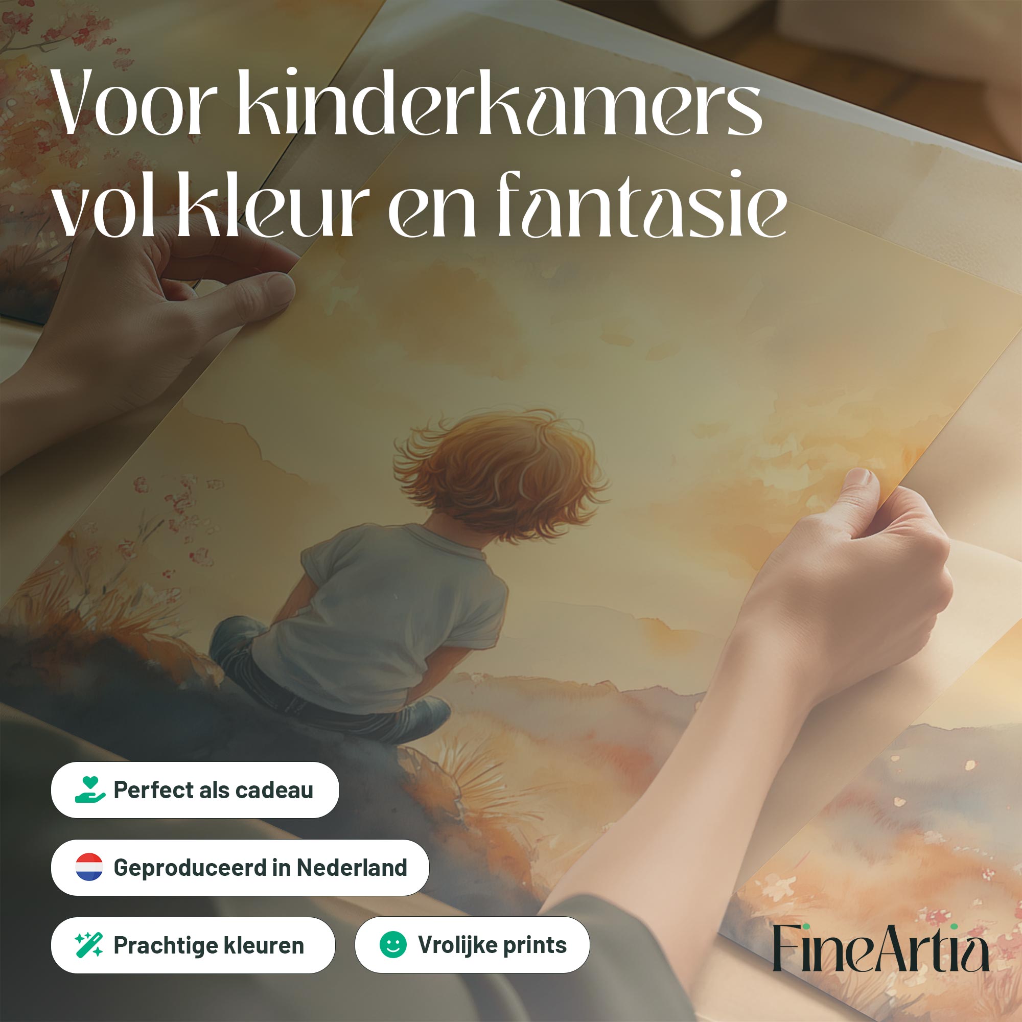 Terug naar collectie / Kinderkamer posters / Jongen op rots in warm landschap
