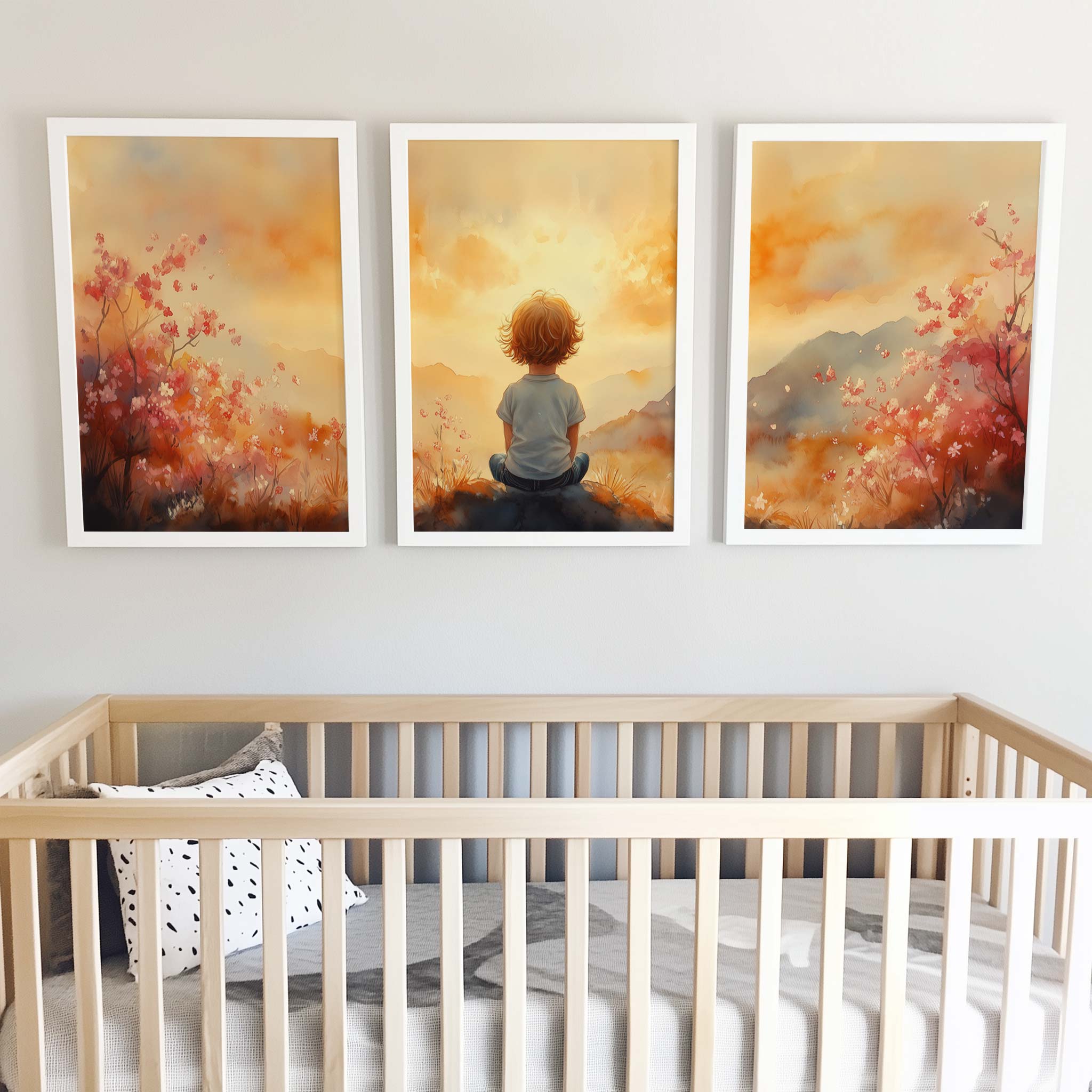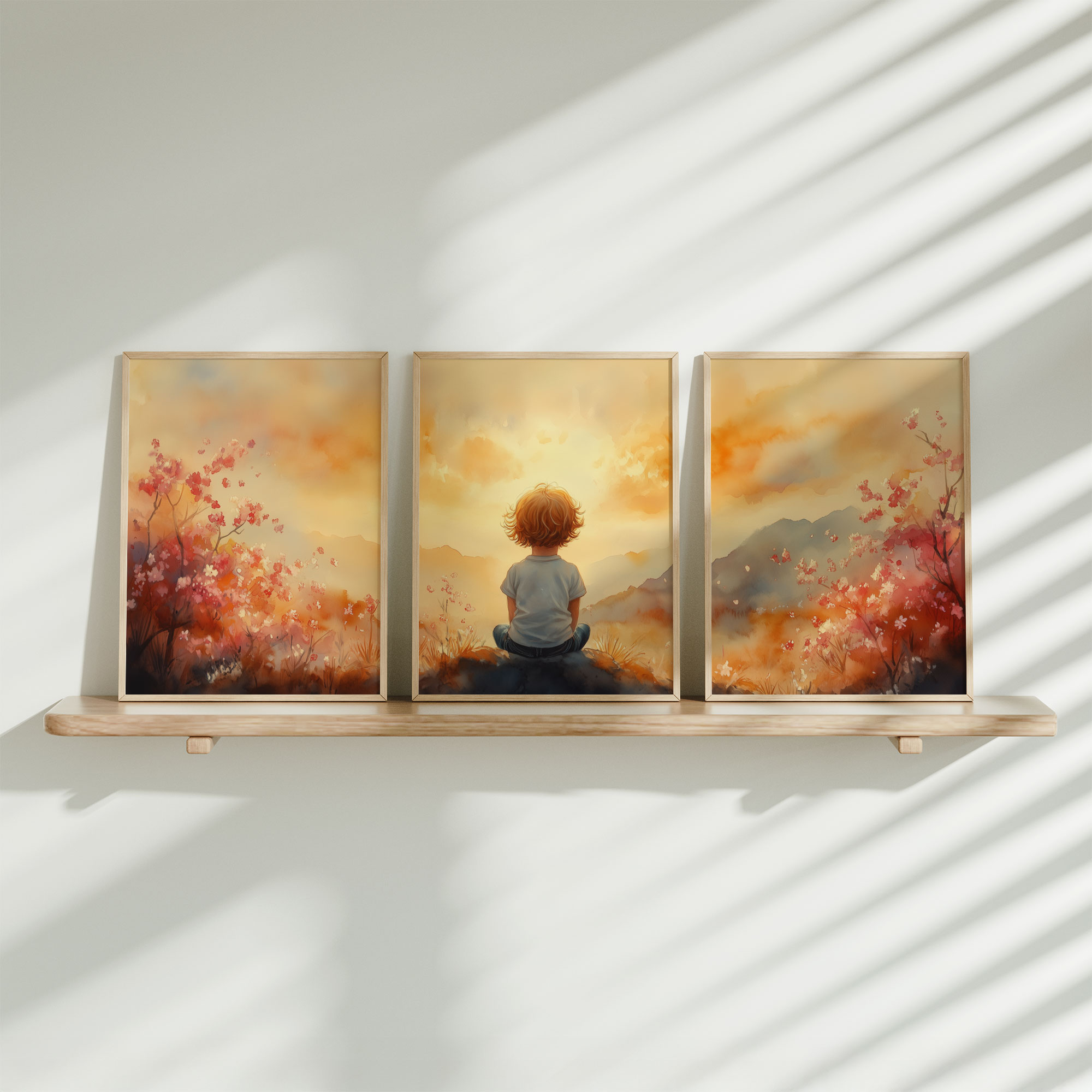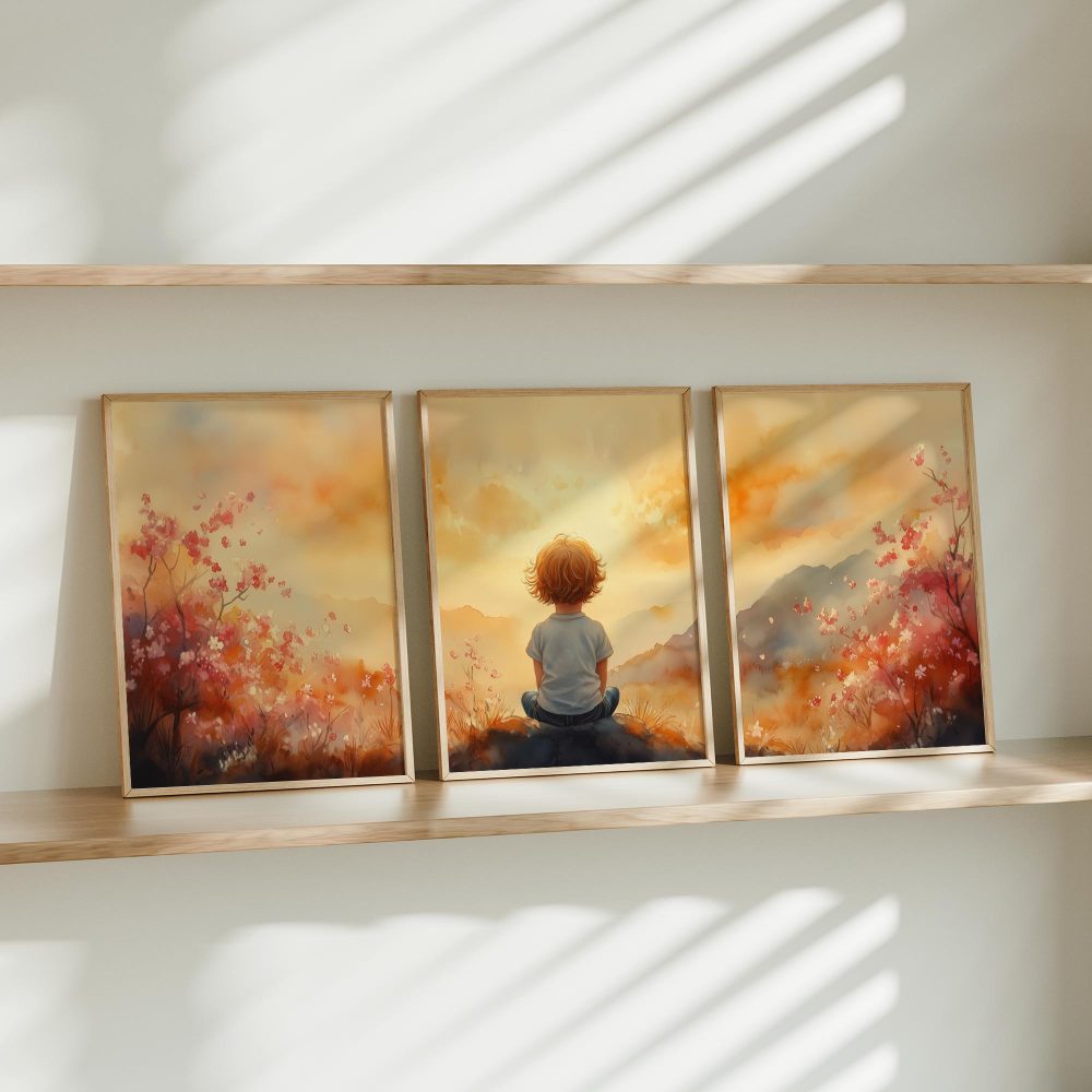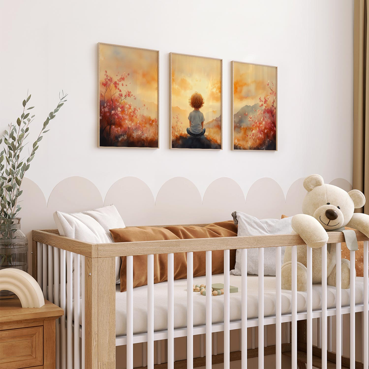 Terug naar collectie / Kinderkamer posters / Jongen op rots in warm landschap