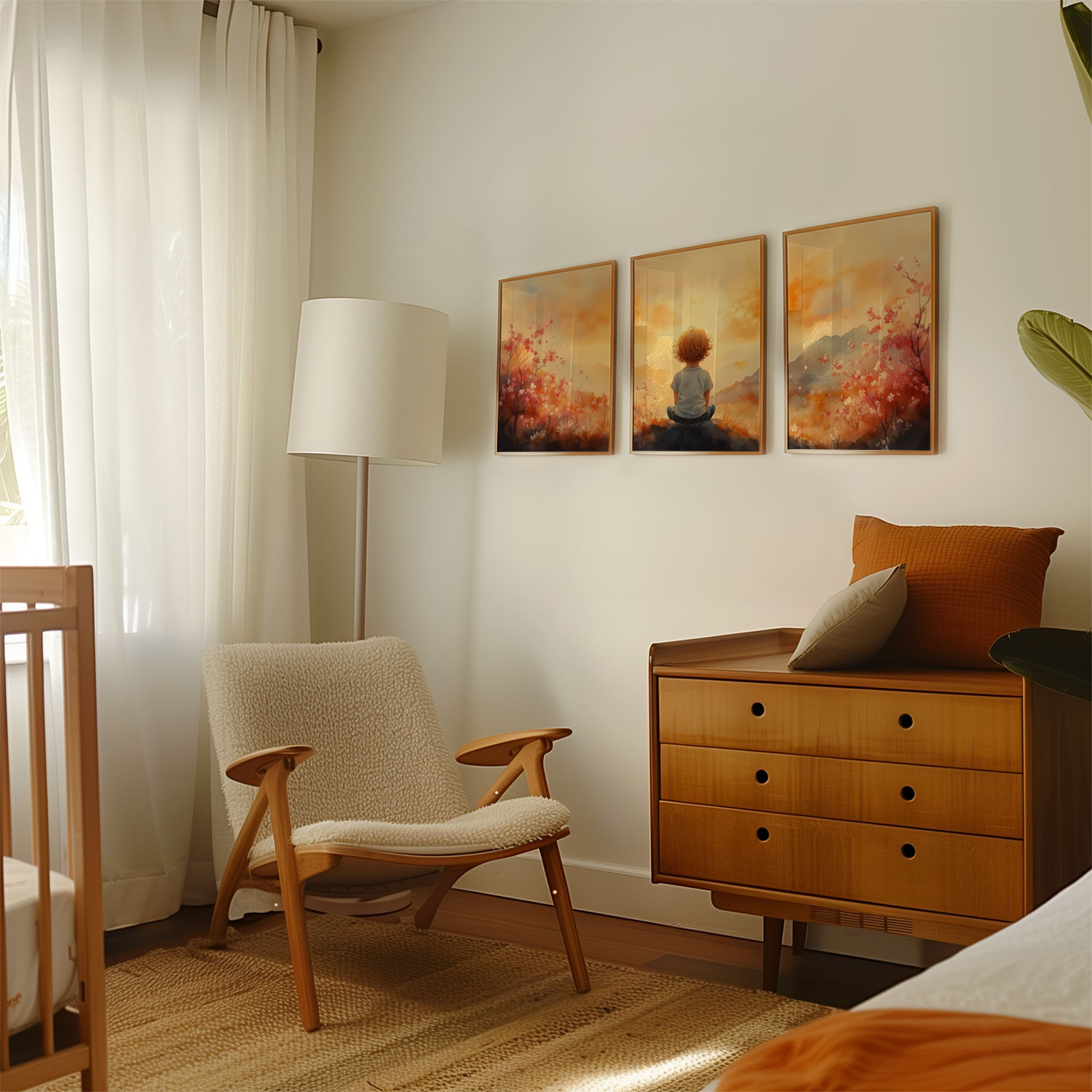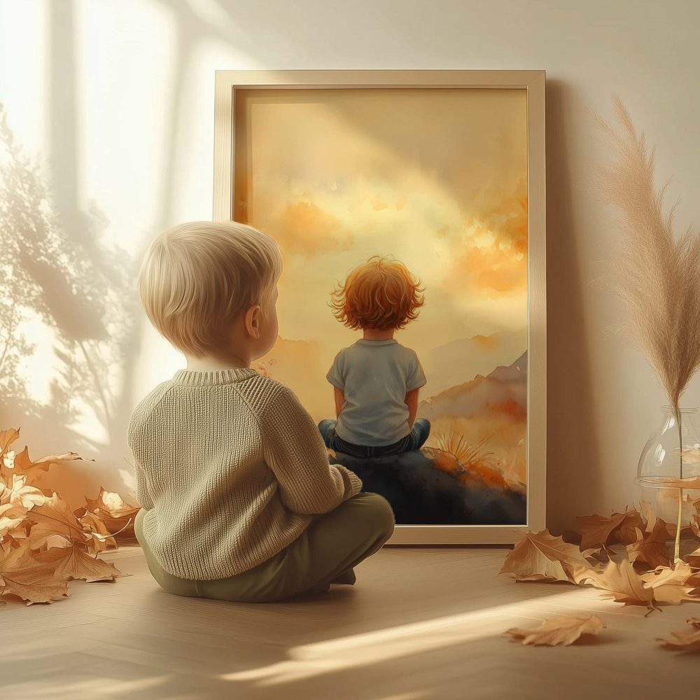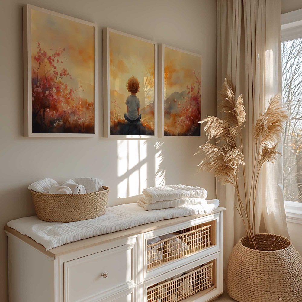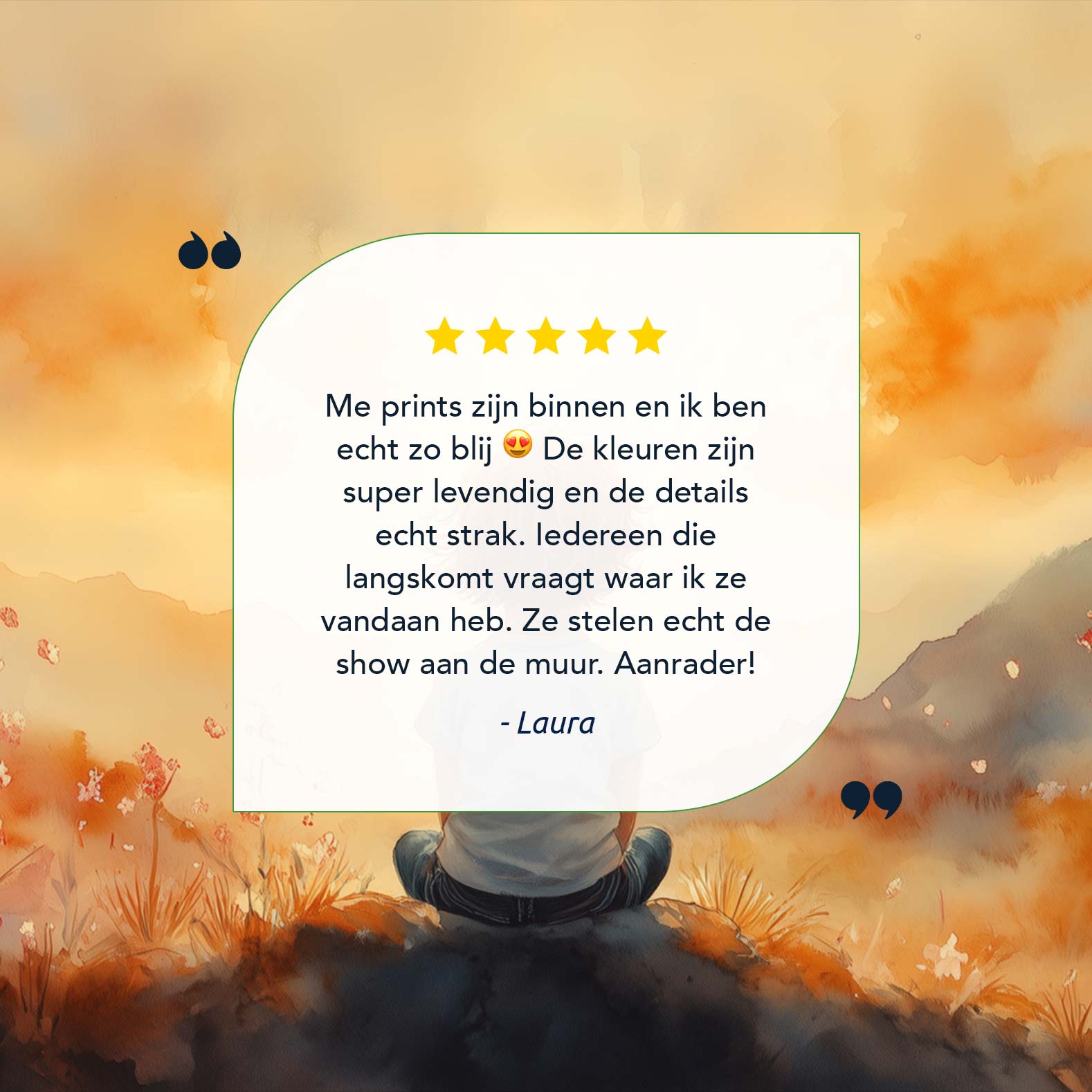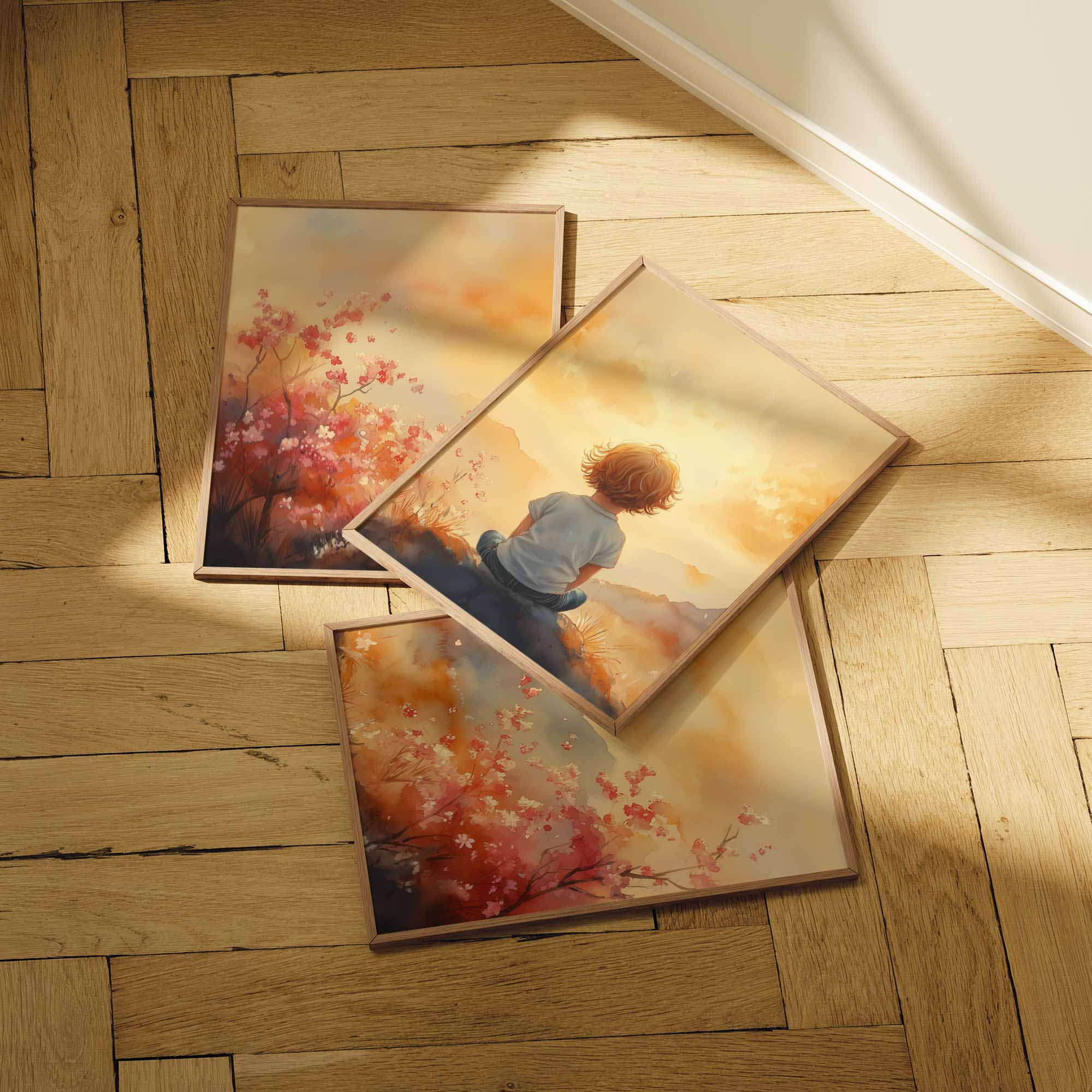 Terug naar collectie / Kinderkamer posters / Jongen op rots in warm landschap