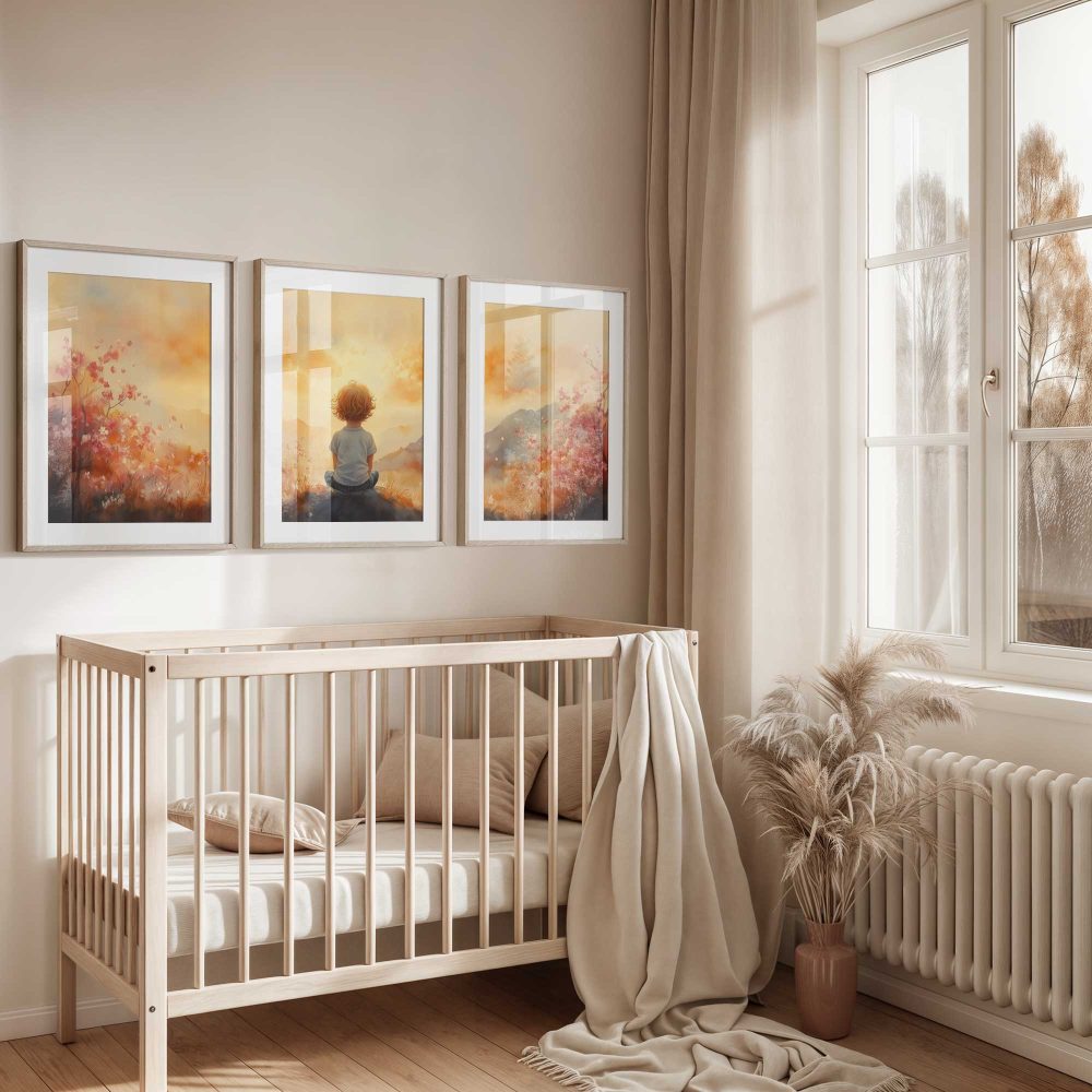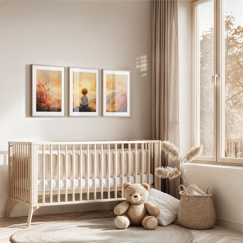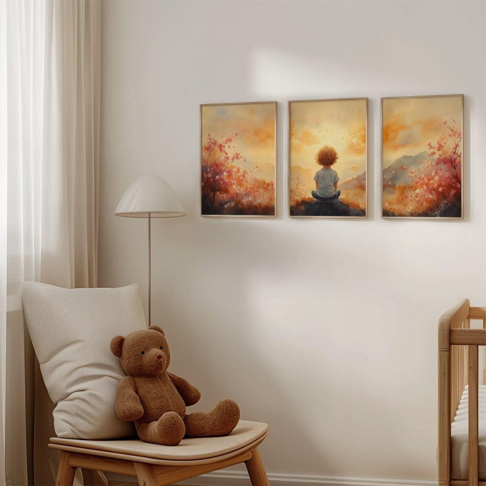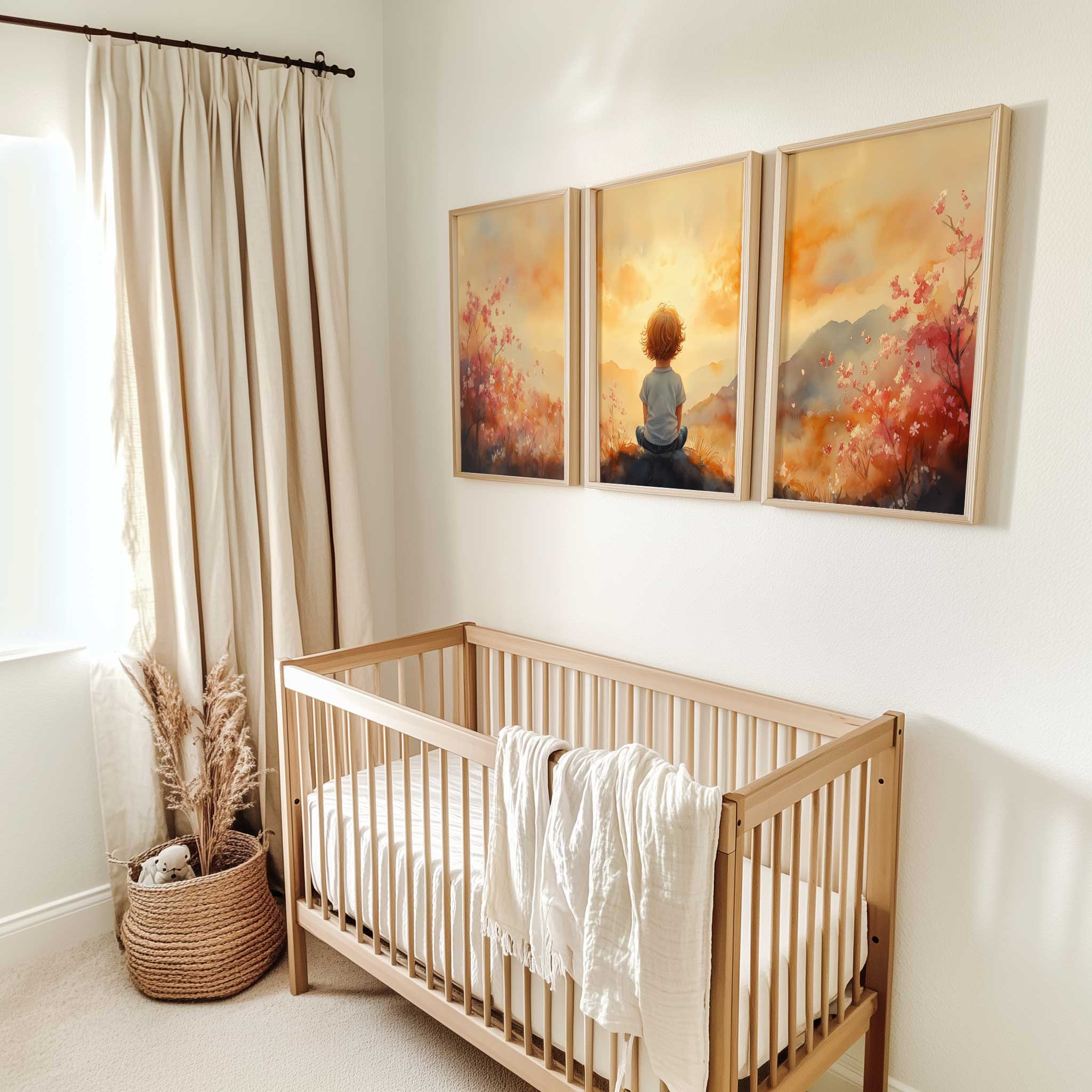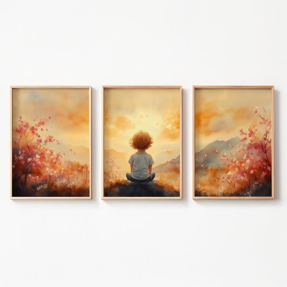 Terug naar collectie / Kinderkamer posters / Jongen op rots in warm landschap