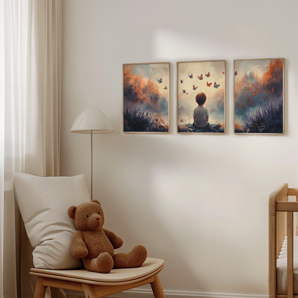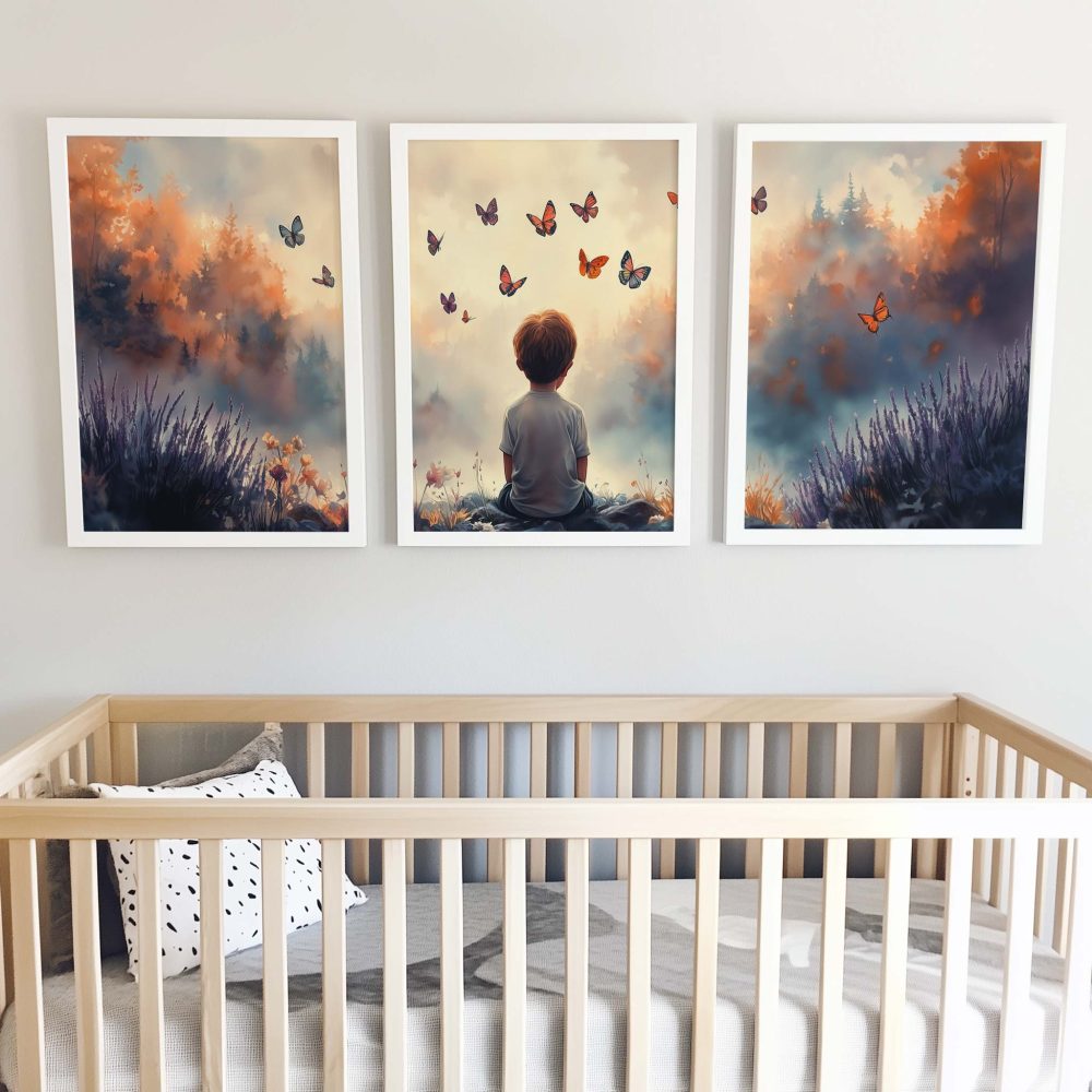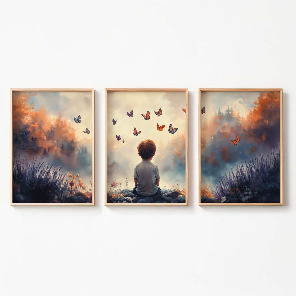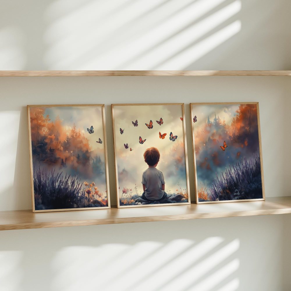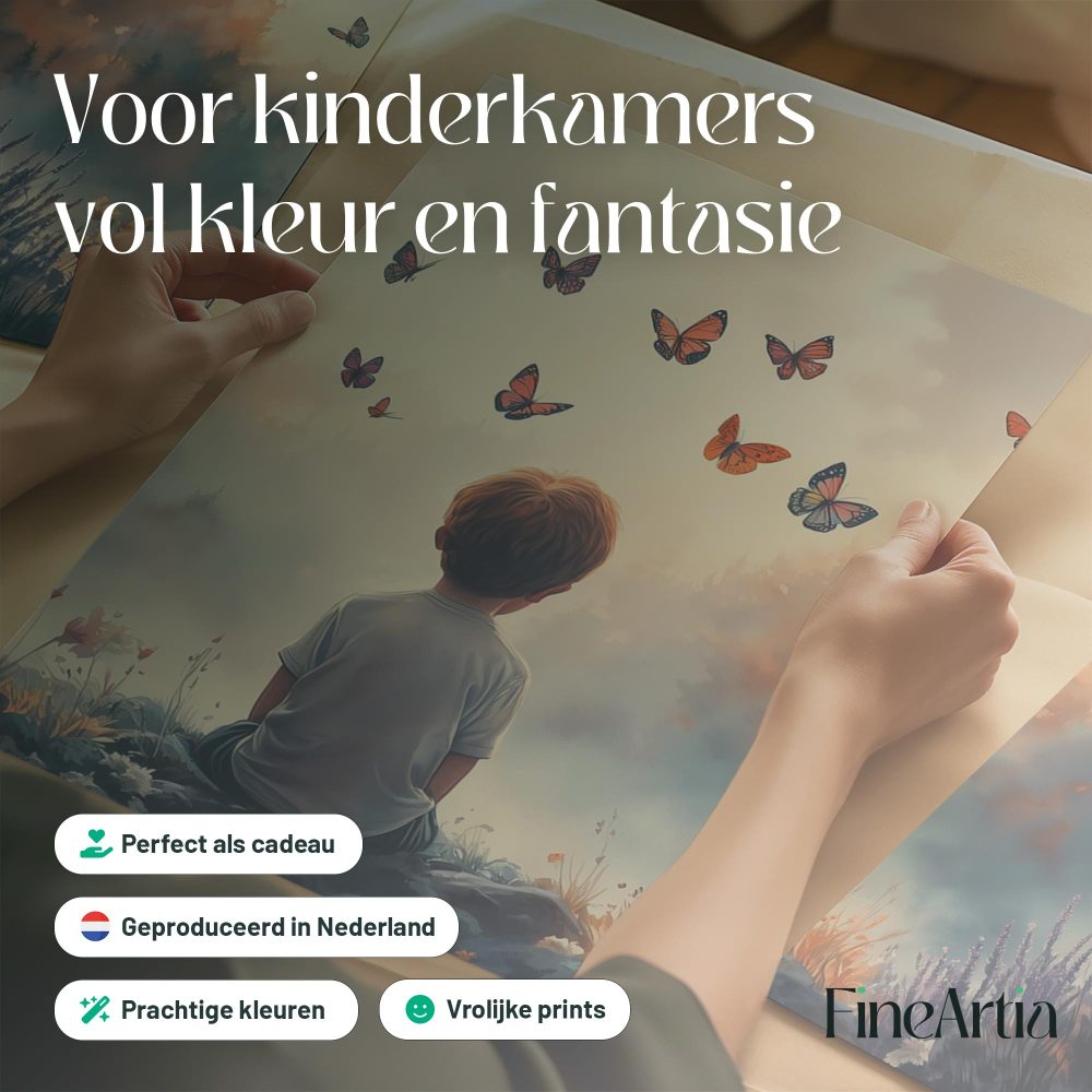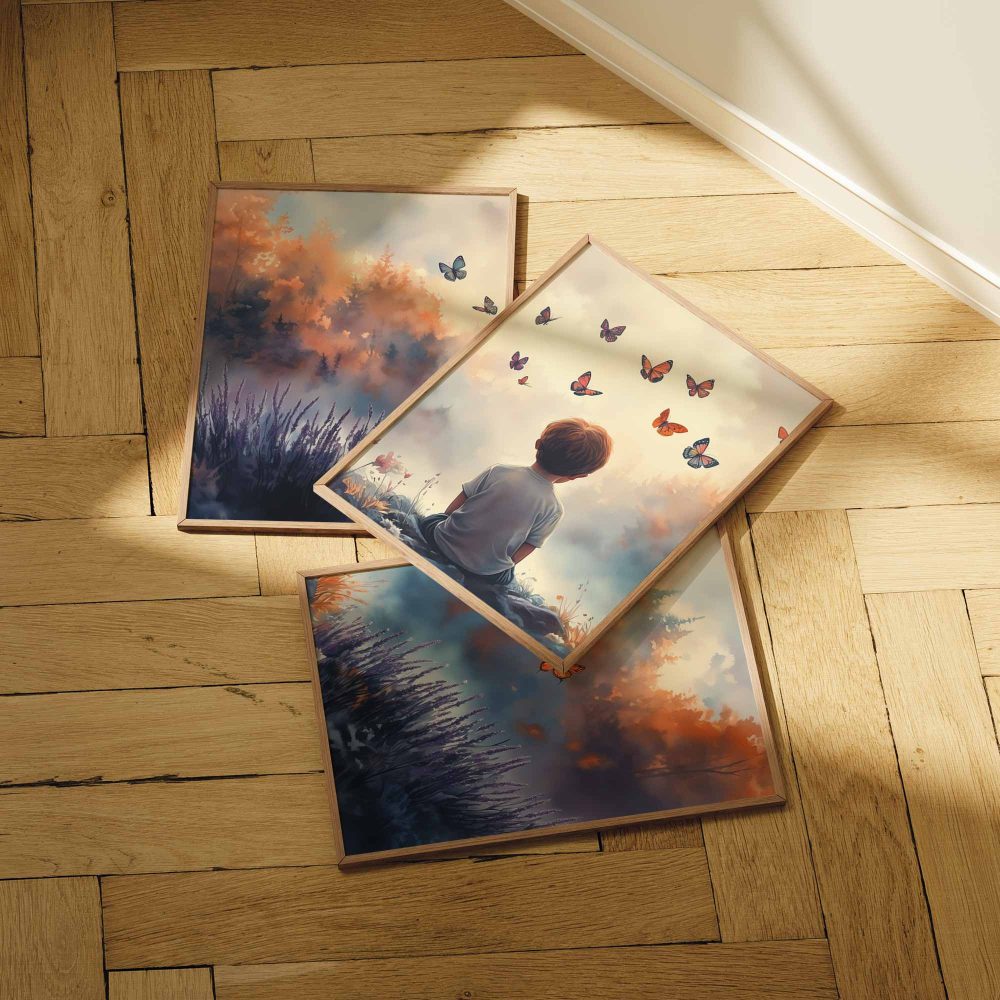 Jongen tussen bloemen en vlinders – Dromerig landschap