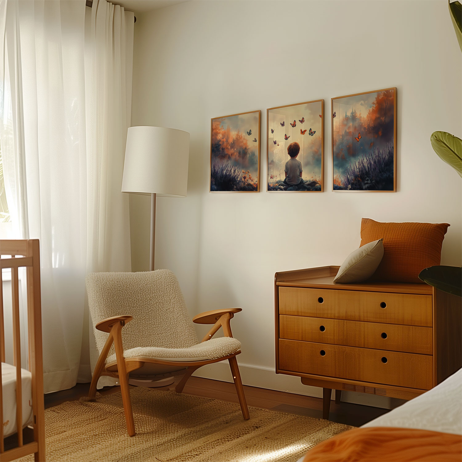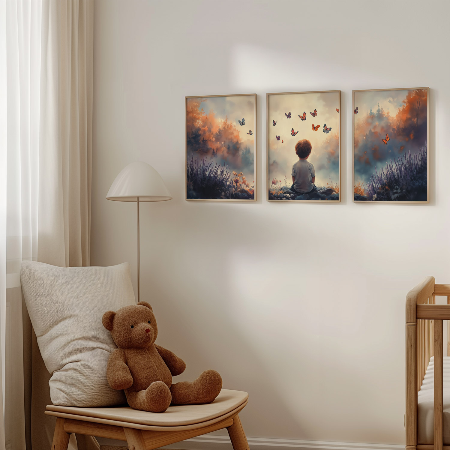 Terug naar collectie / Kinderkamer posters / Bloemen posters / Jongen tussen bloemen en vlinders – Dromerig landschap