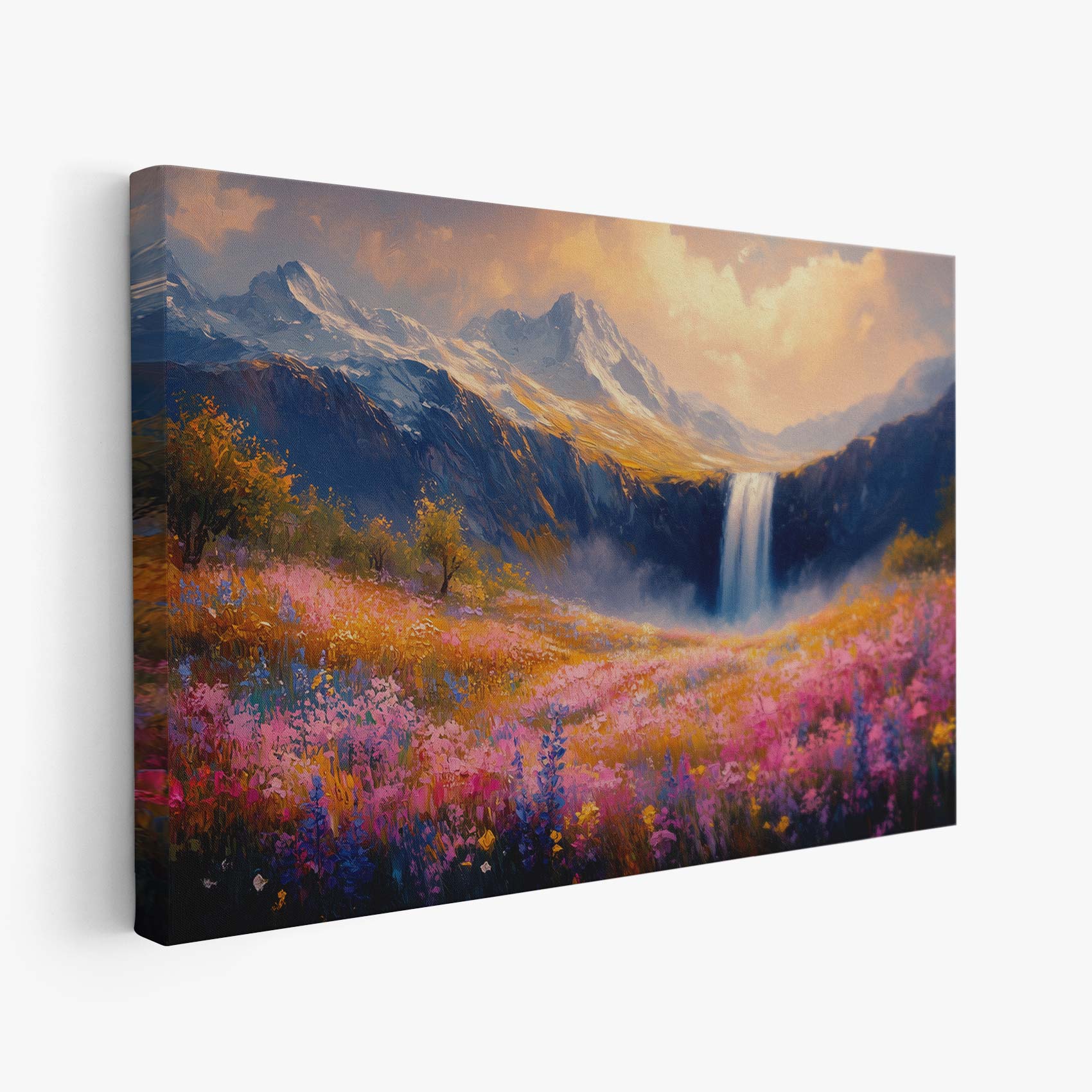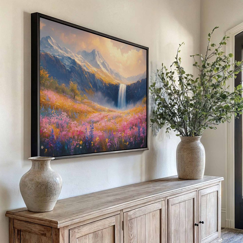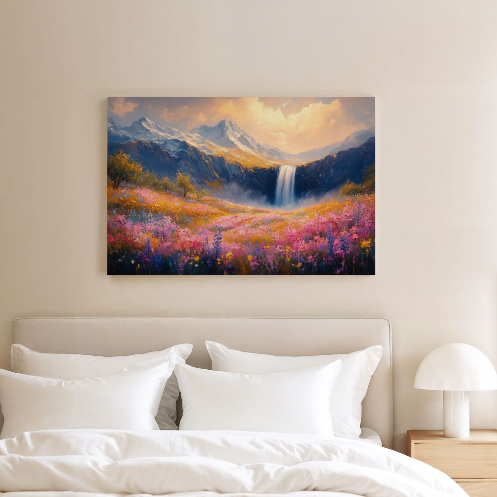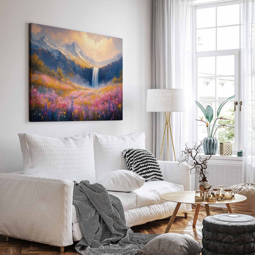 Terug naar collectie / Schilderijen / Bergen Schilderij / Kleurrijk Berglandschap met Waterval