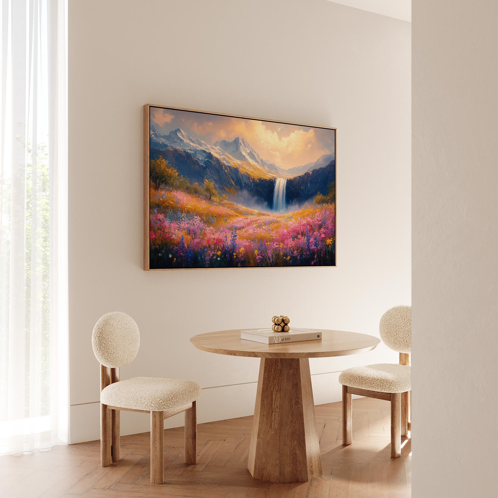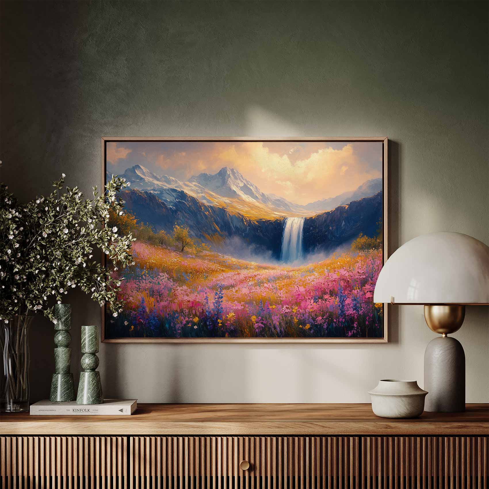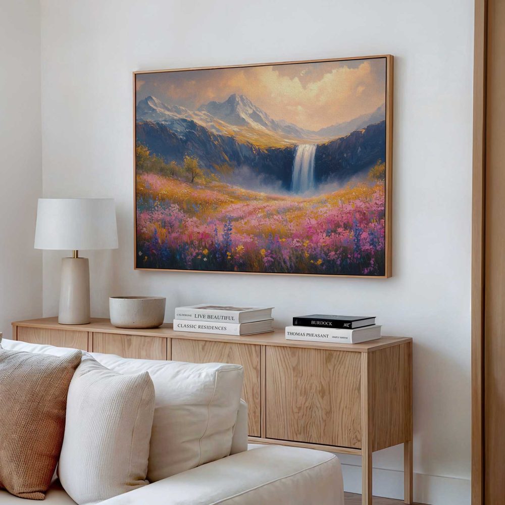 Terug naar collectie / Schilderijen / Bergen Schilderij / Kleurrijk Berglandschap met Waterval