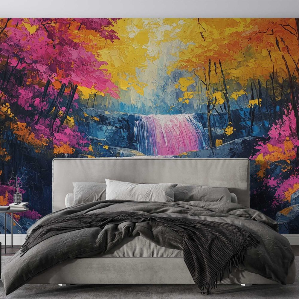 Kleurrijk waterval boslandschap behang