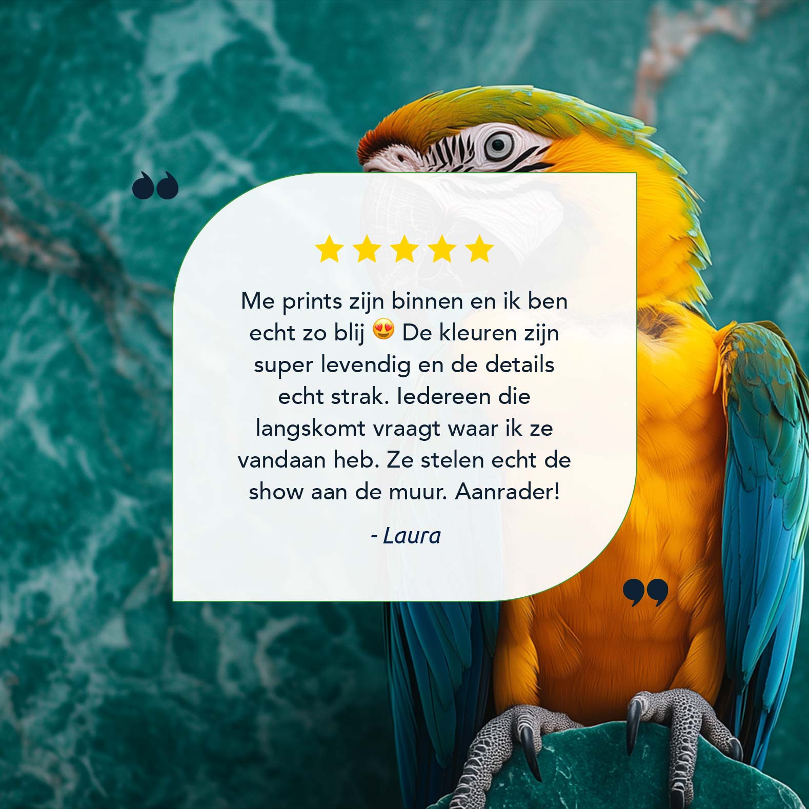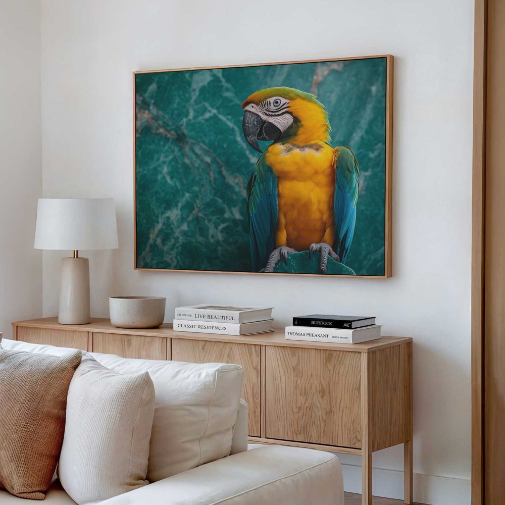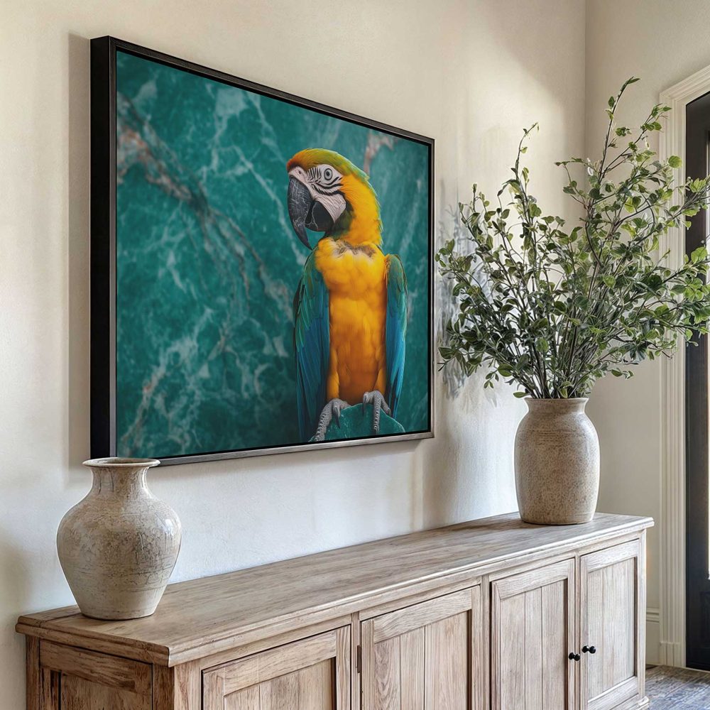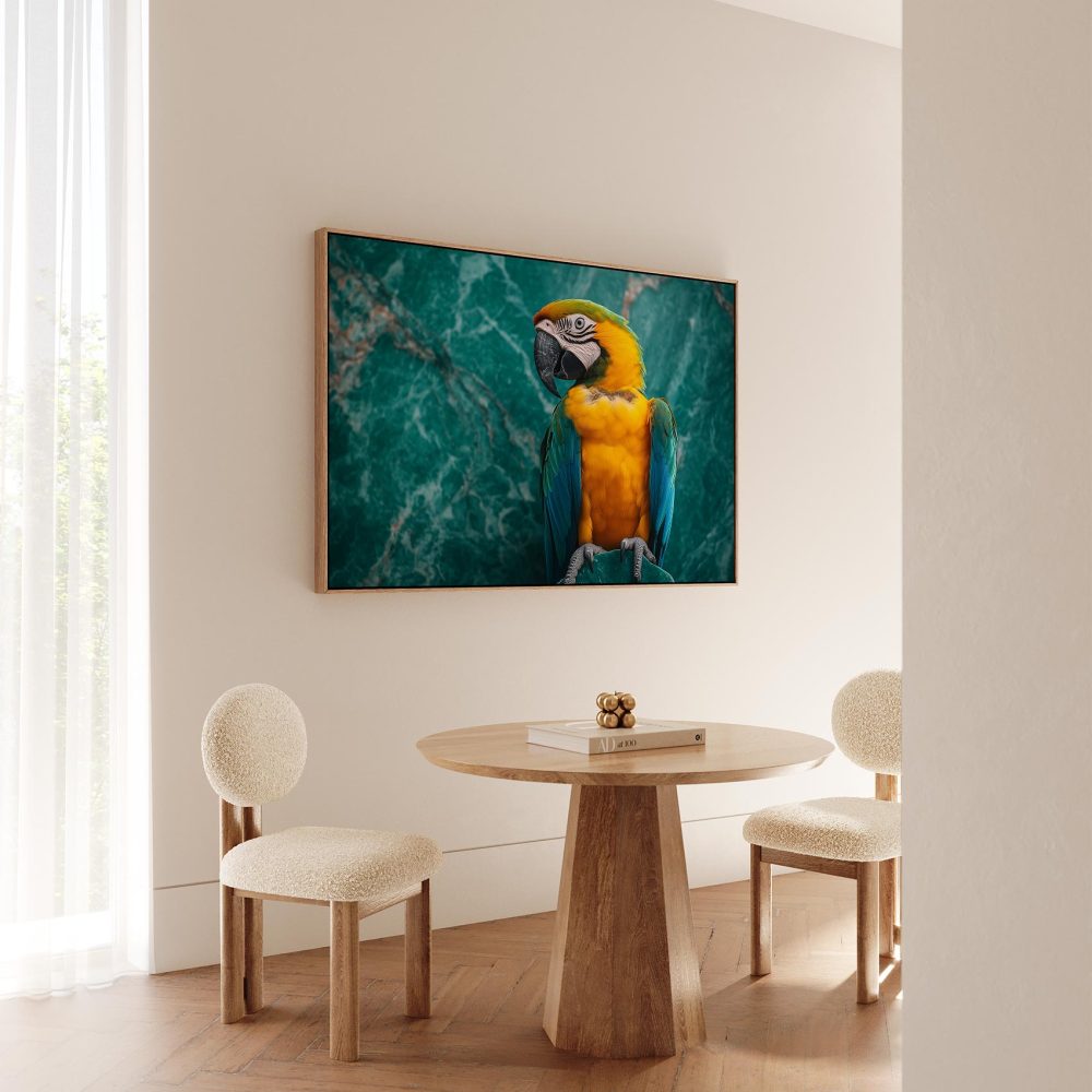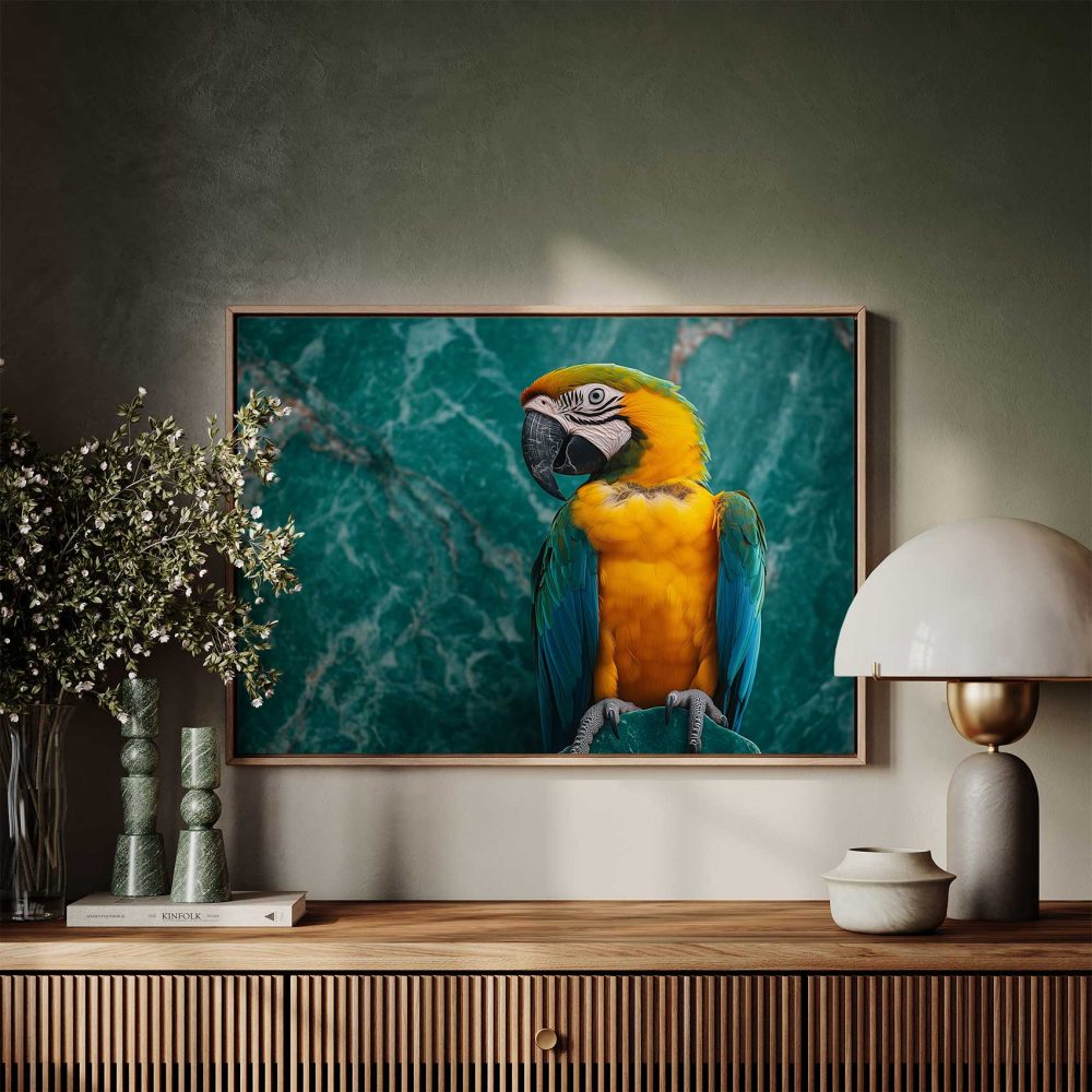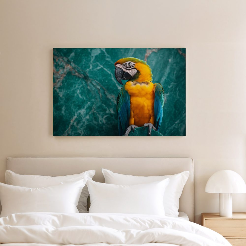 Terug naar collectie / Schilderijen / Dieren Schilderij / Kleurrijke papegaai op marmer