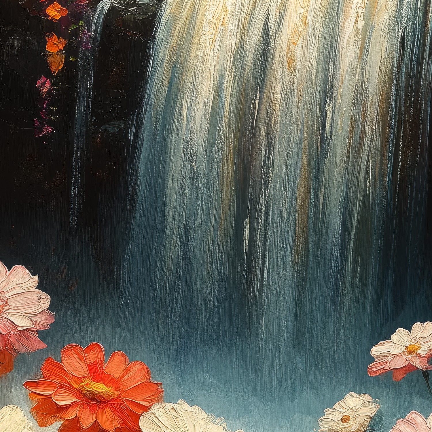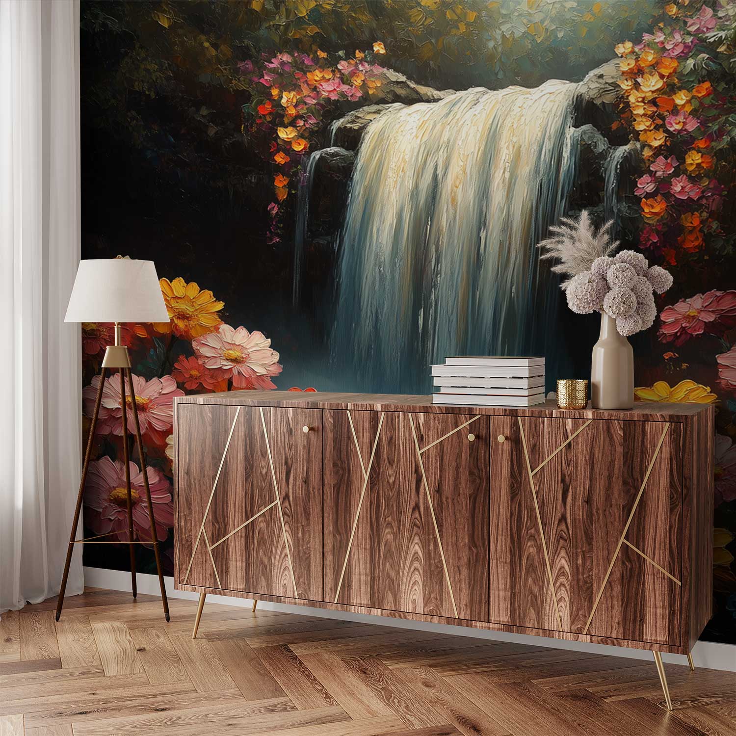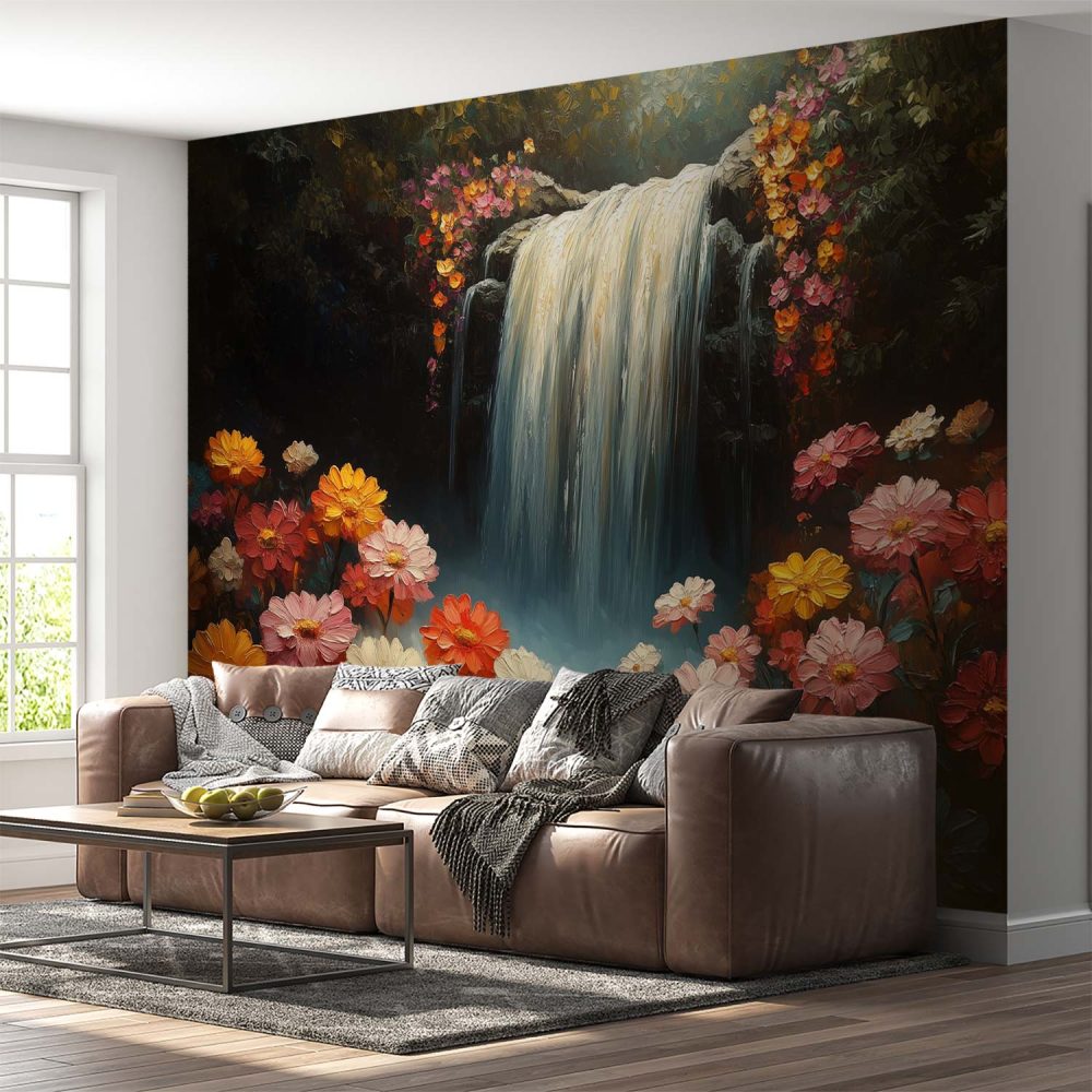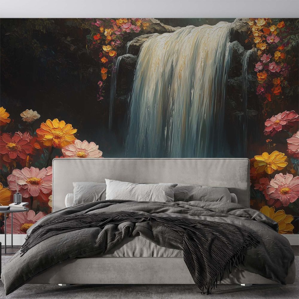 Kleurrijke waterval bloementuin behang