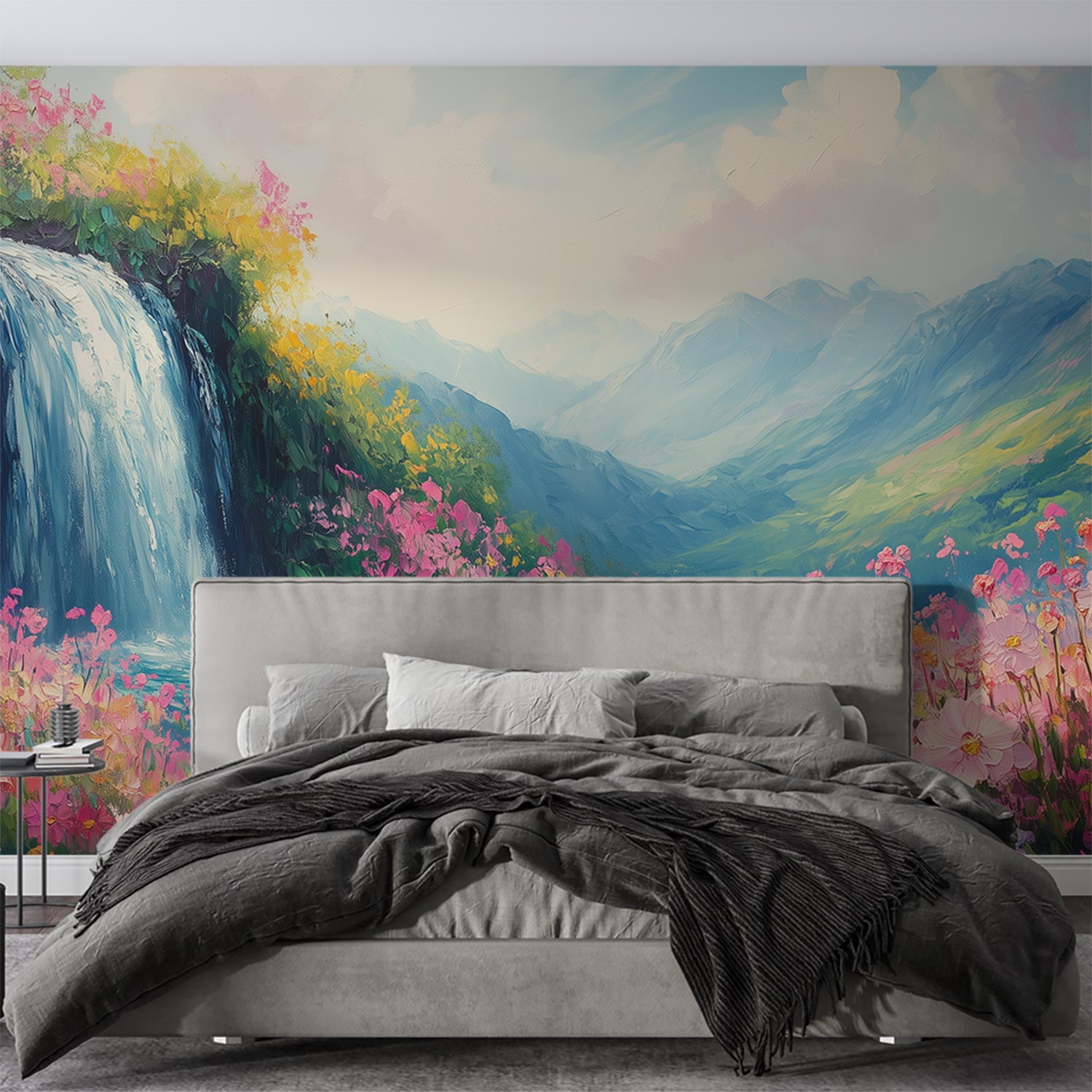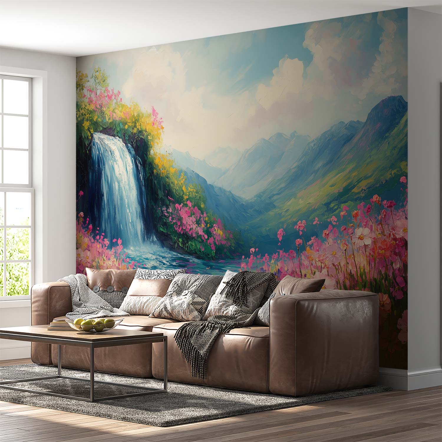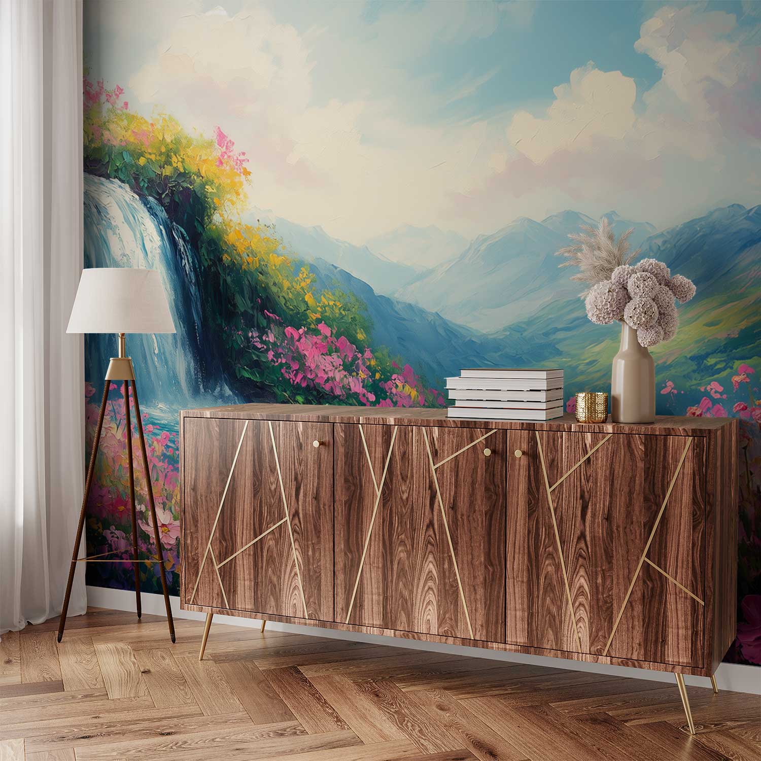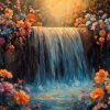Kleurrijke waterval en bloemen behang