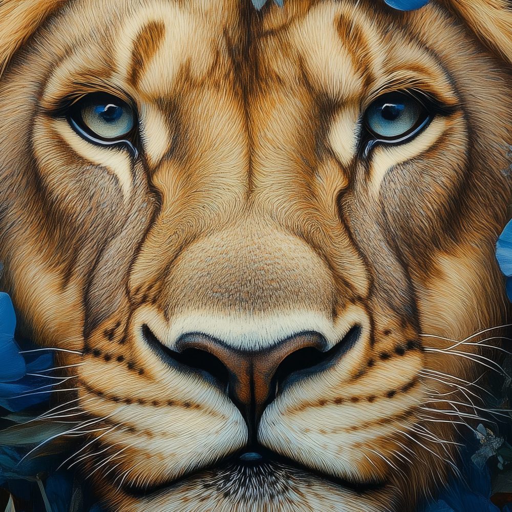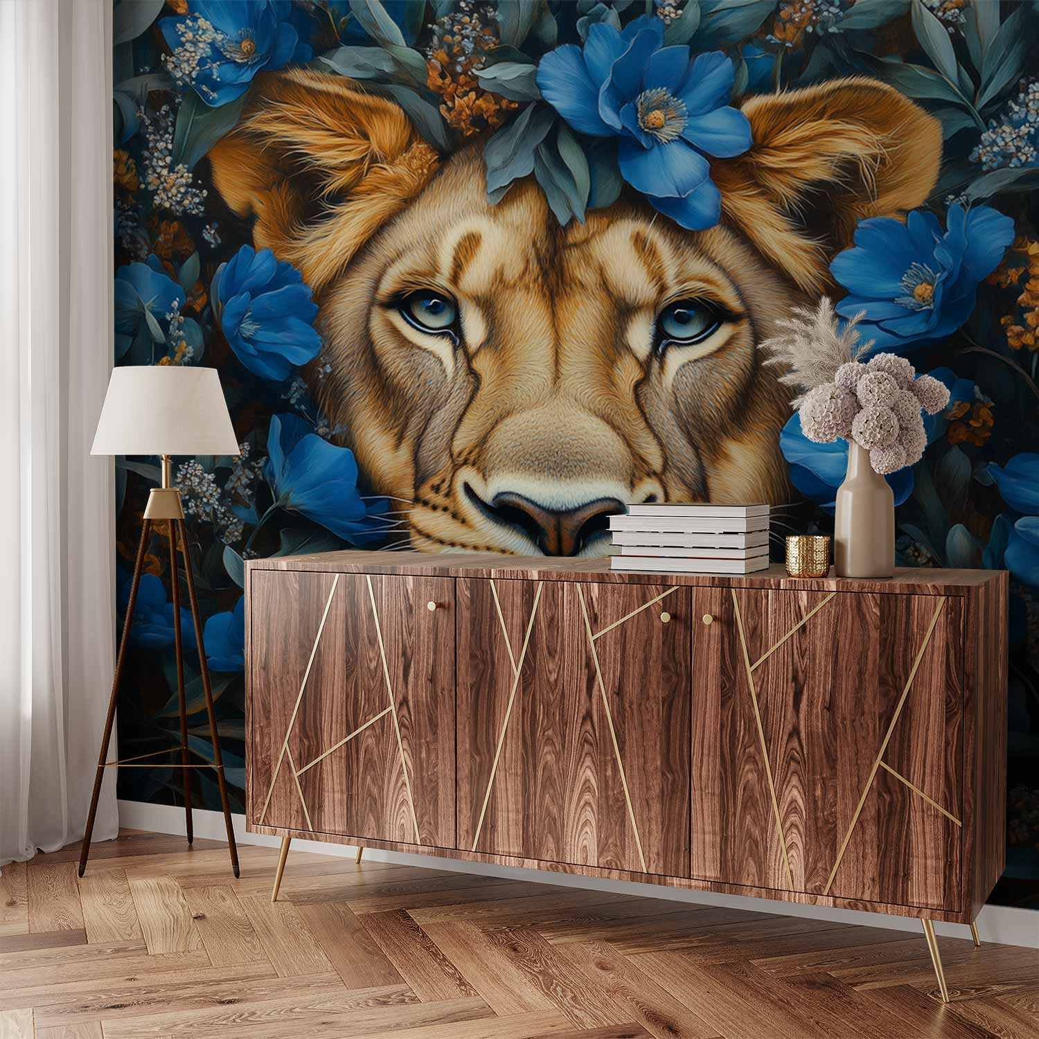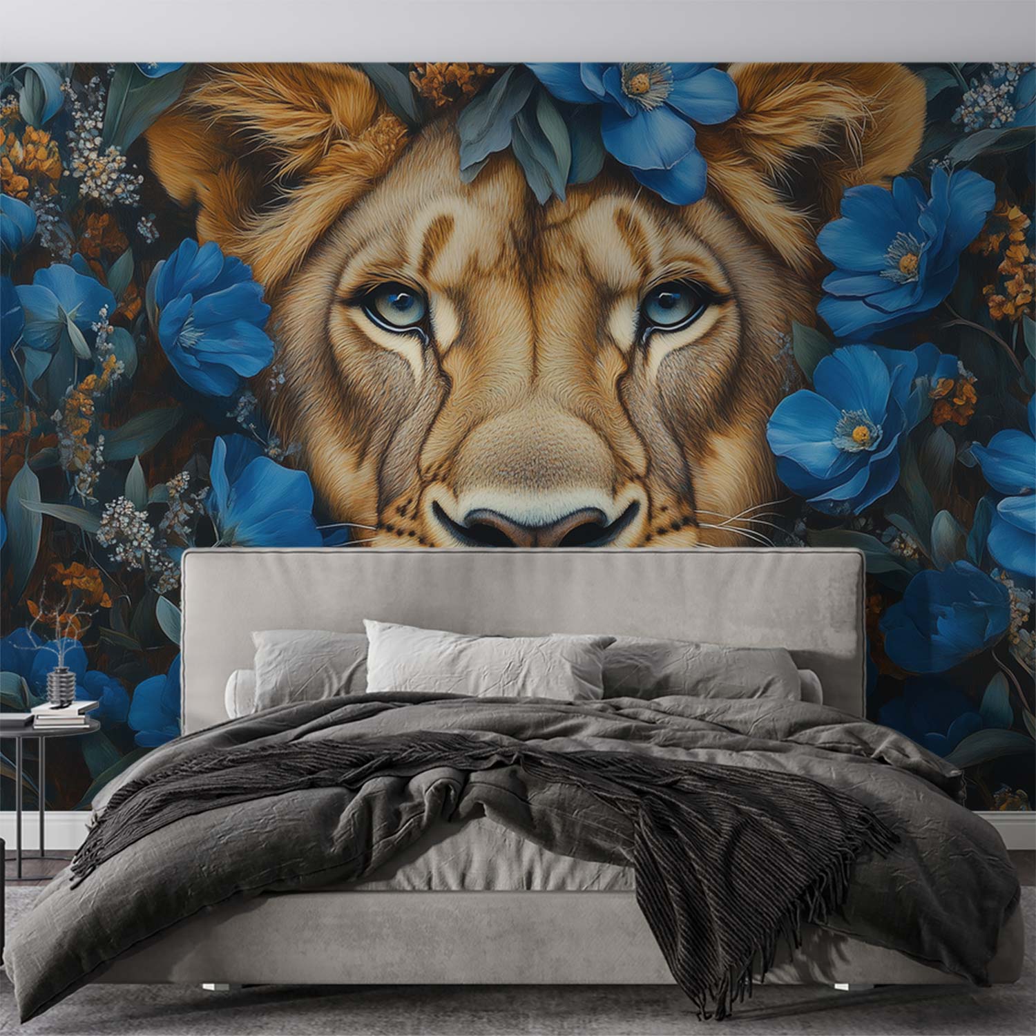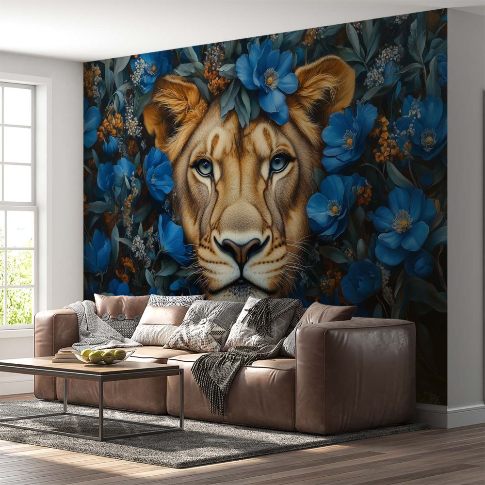 Terug naar collectie / Behang / Koningsleeuw tussen blauwe bloemen behang