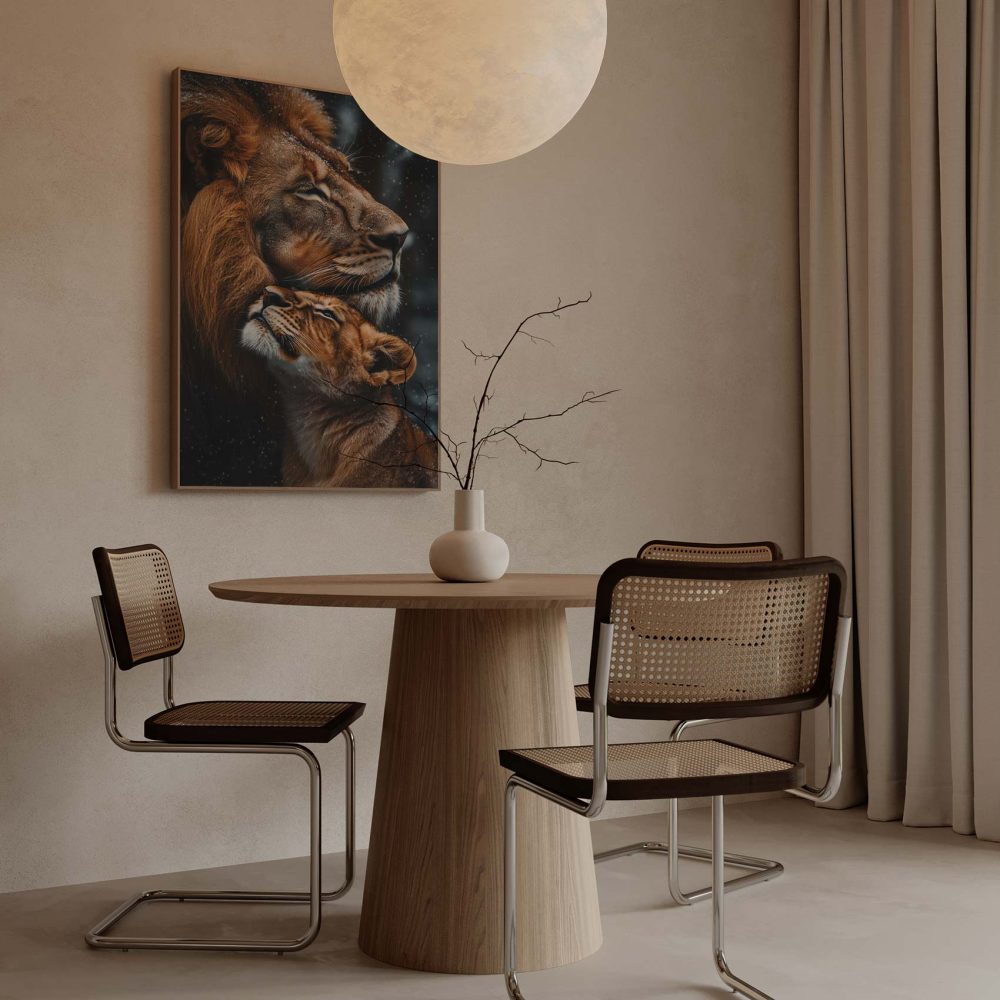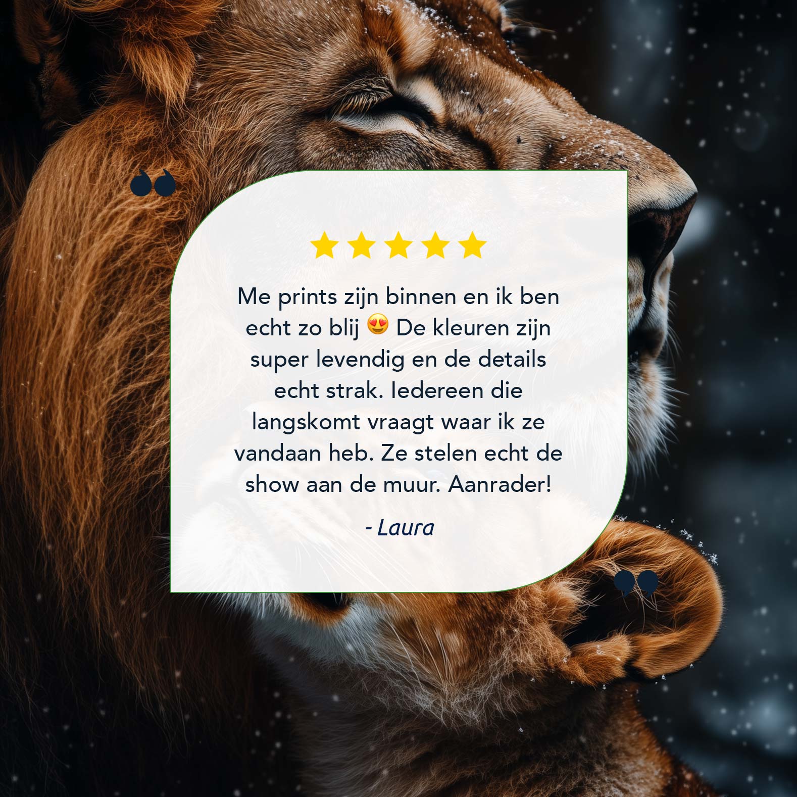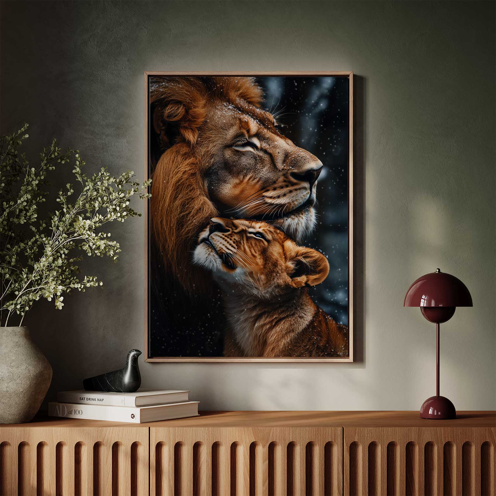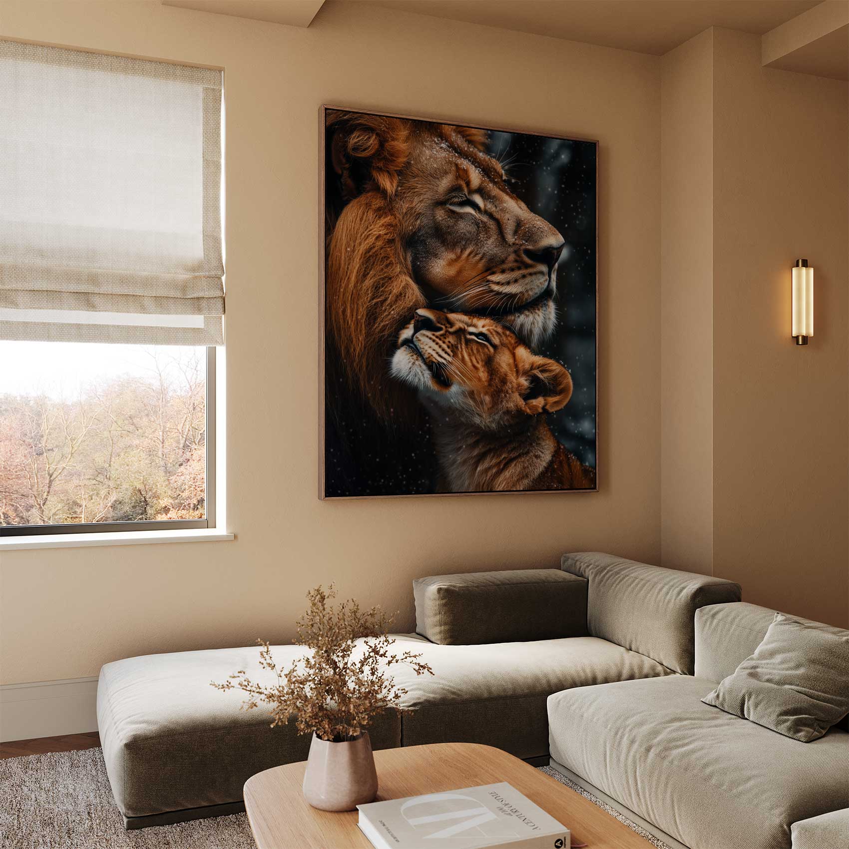 Terug naar collectie / Schilderijen / Bossen Schilderij / Leeuw en welp in besneeuwd bos