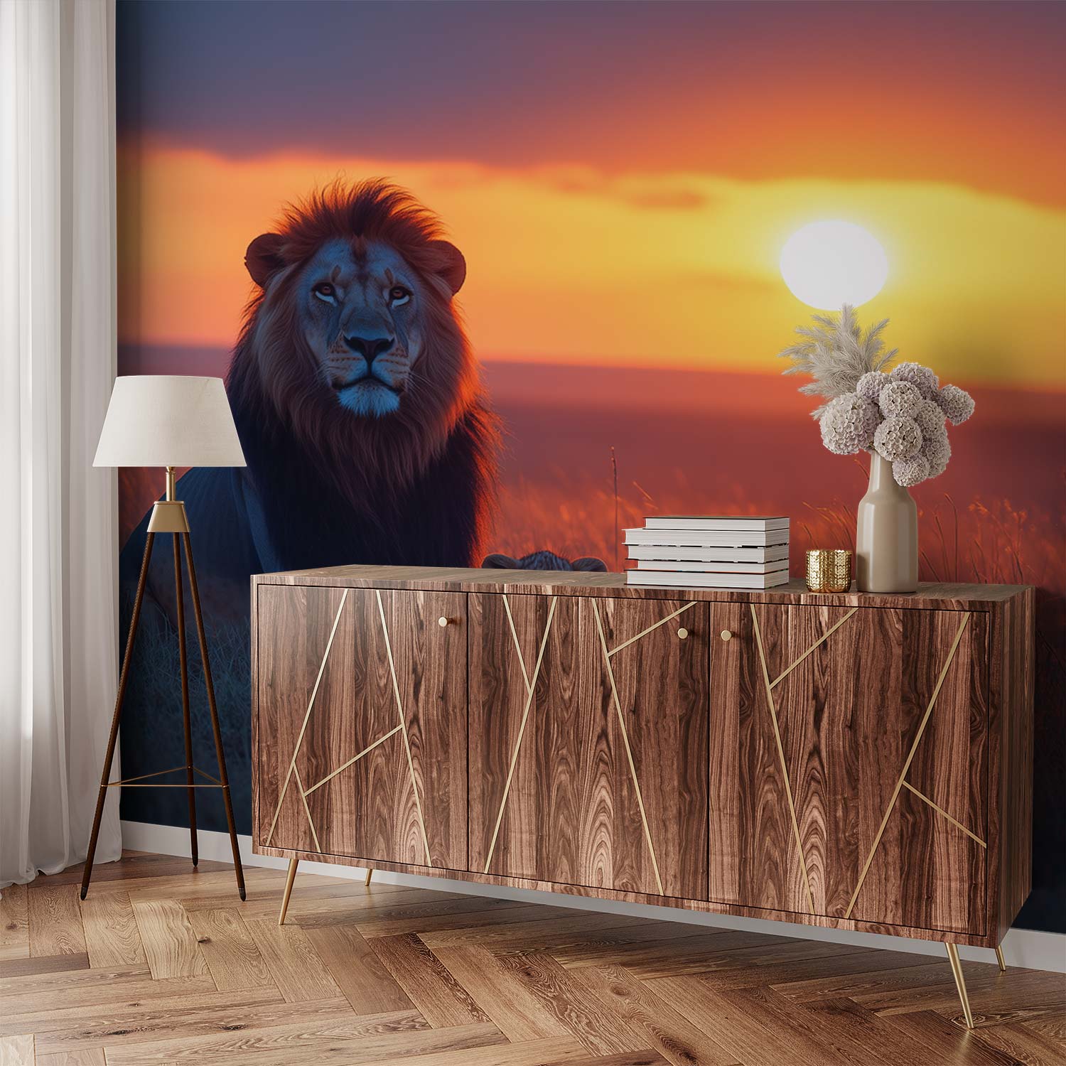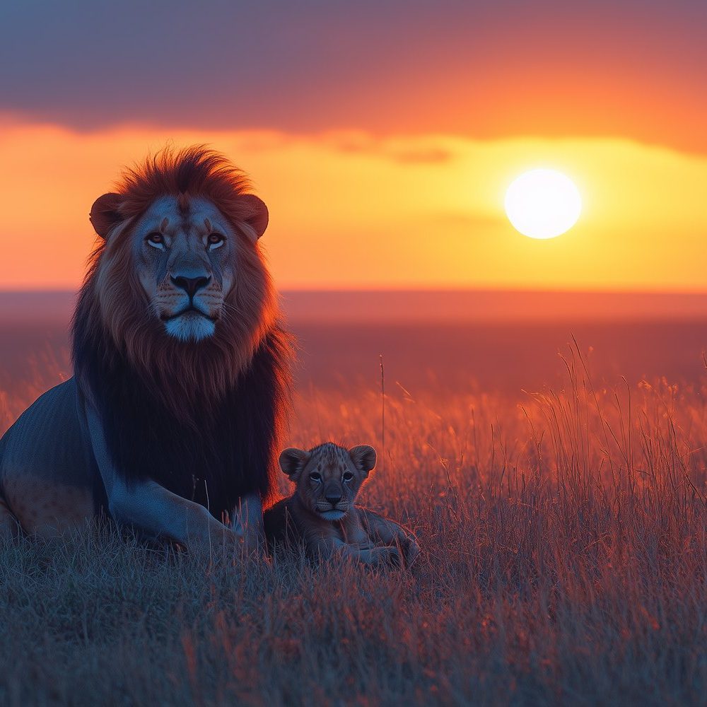 Leeuw en welp zonsondergang behang