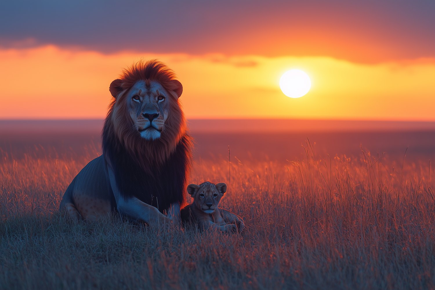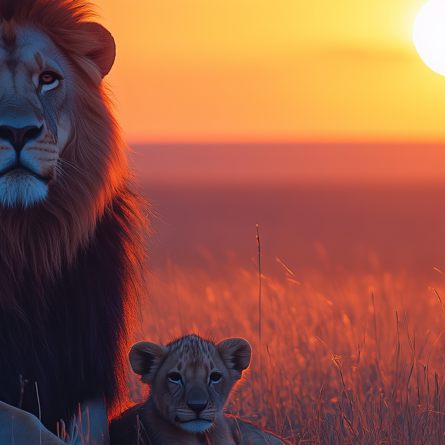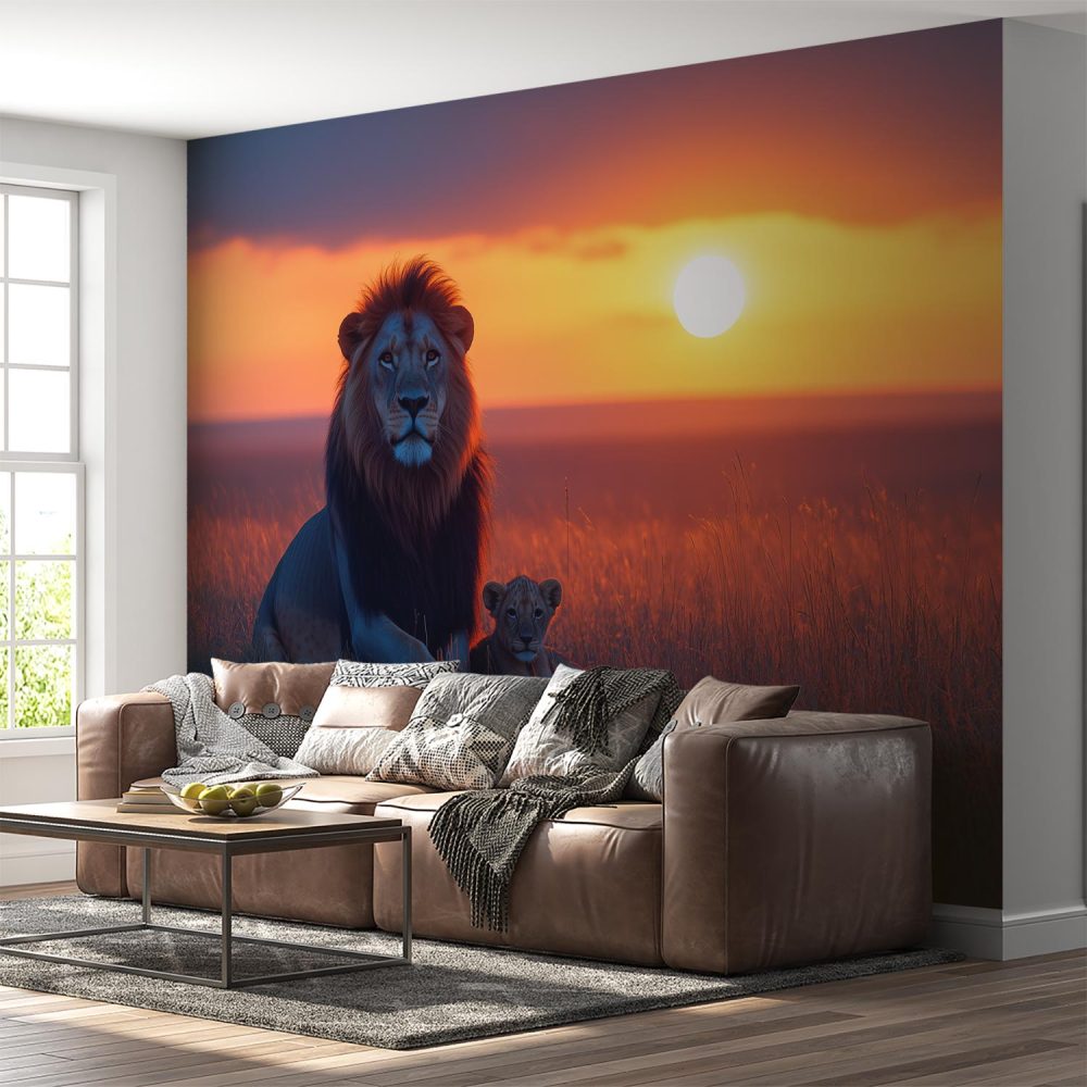 Terug naar collectie / Behang / Leeuw en welp zonsondergang behang