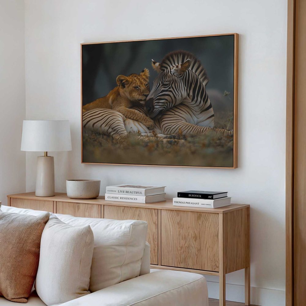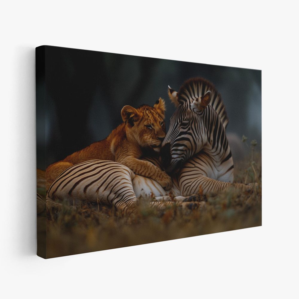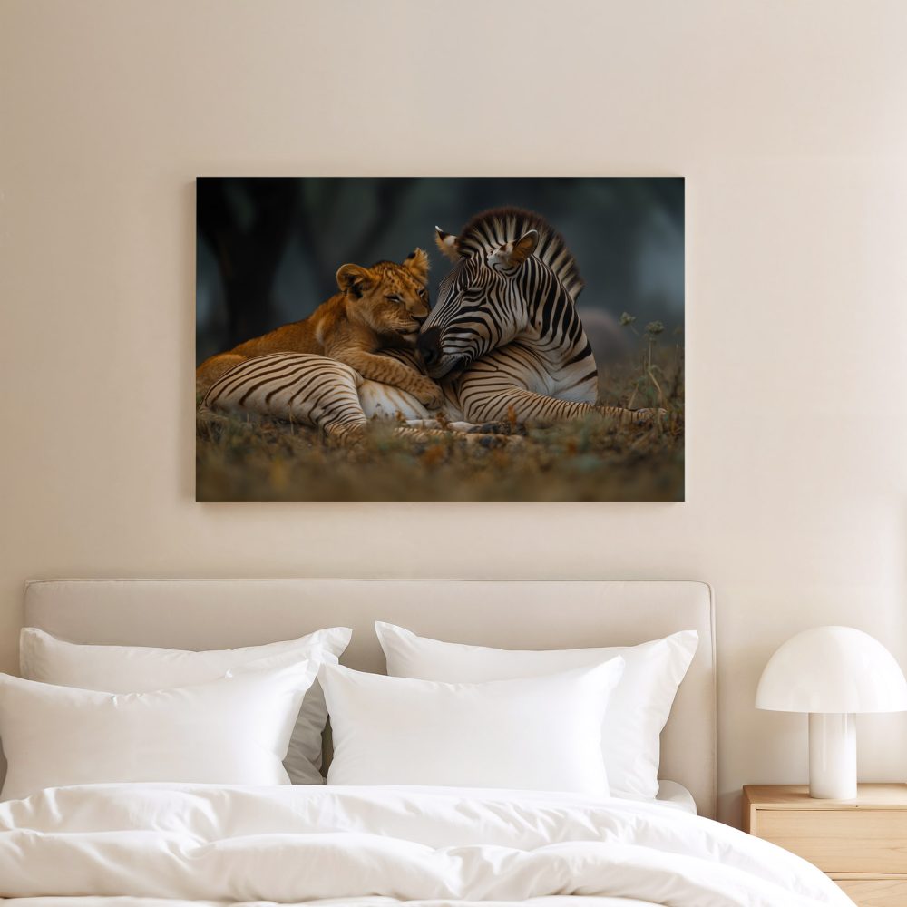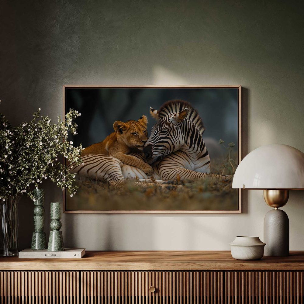 Terug naar collectie / Schilderijen / Dieren Schilderij / Leeuw en zebra in harmonie