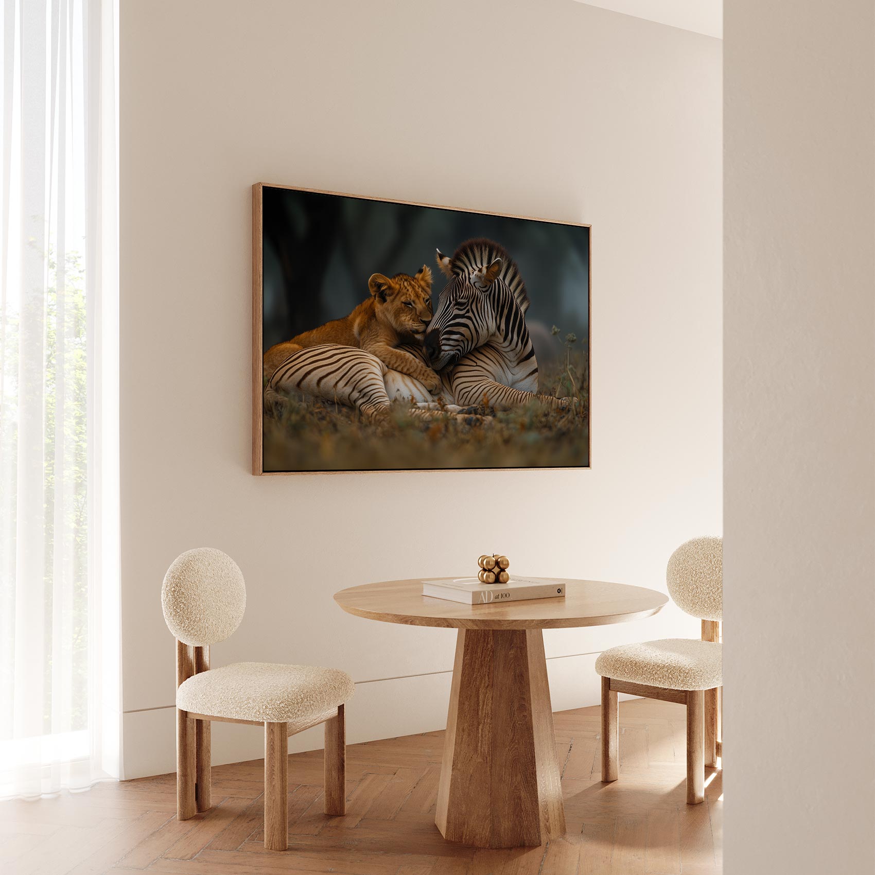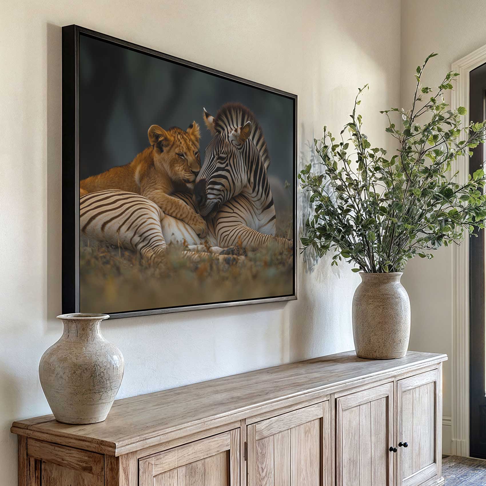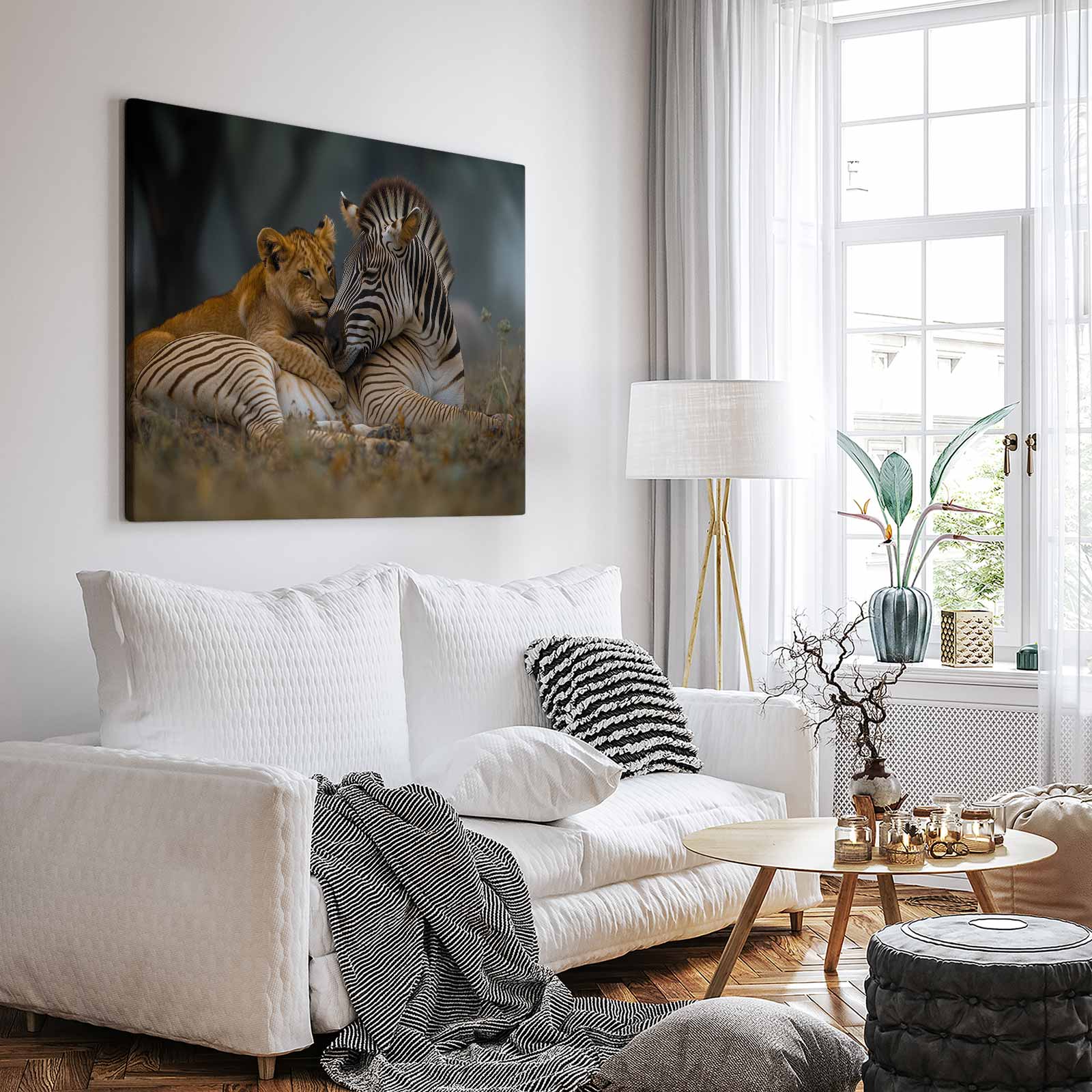 Terug naar collectie / Schilderijen / Dieren Schilderij / Leeuw en zebra in harmonie