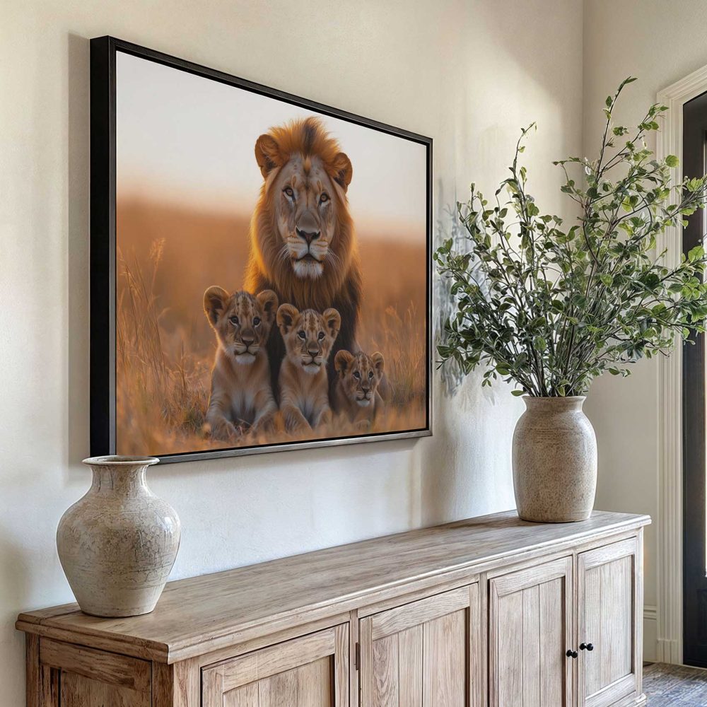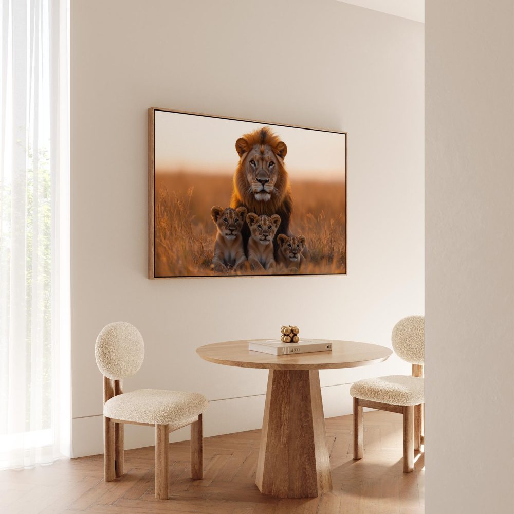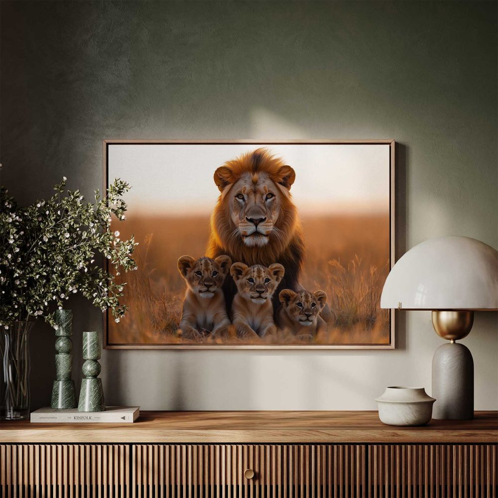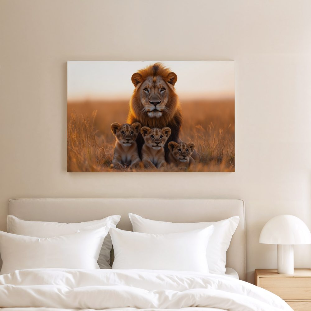 Terug naar collectie / Schilderijen / Dieren Schilderij / Leeuw met welpen in gouden veld
