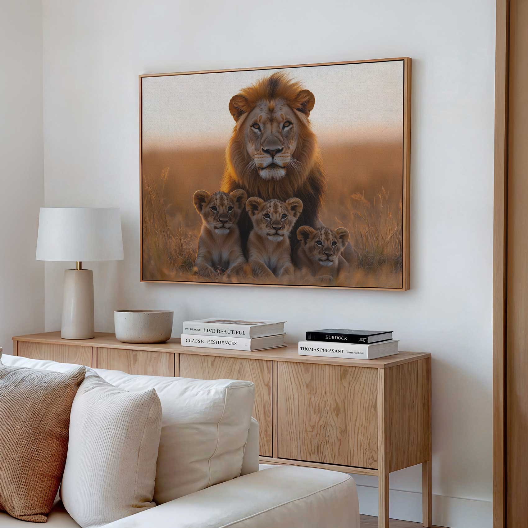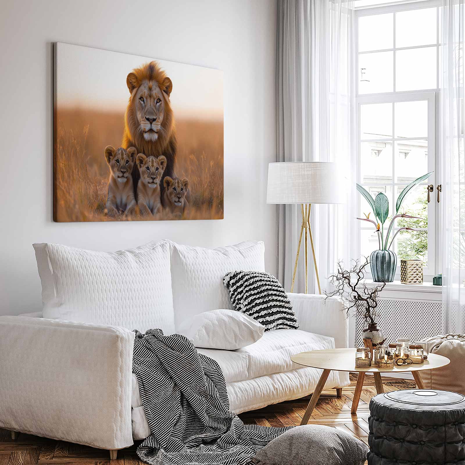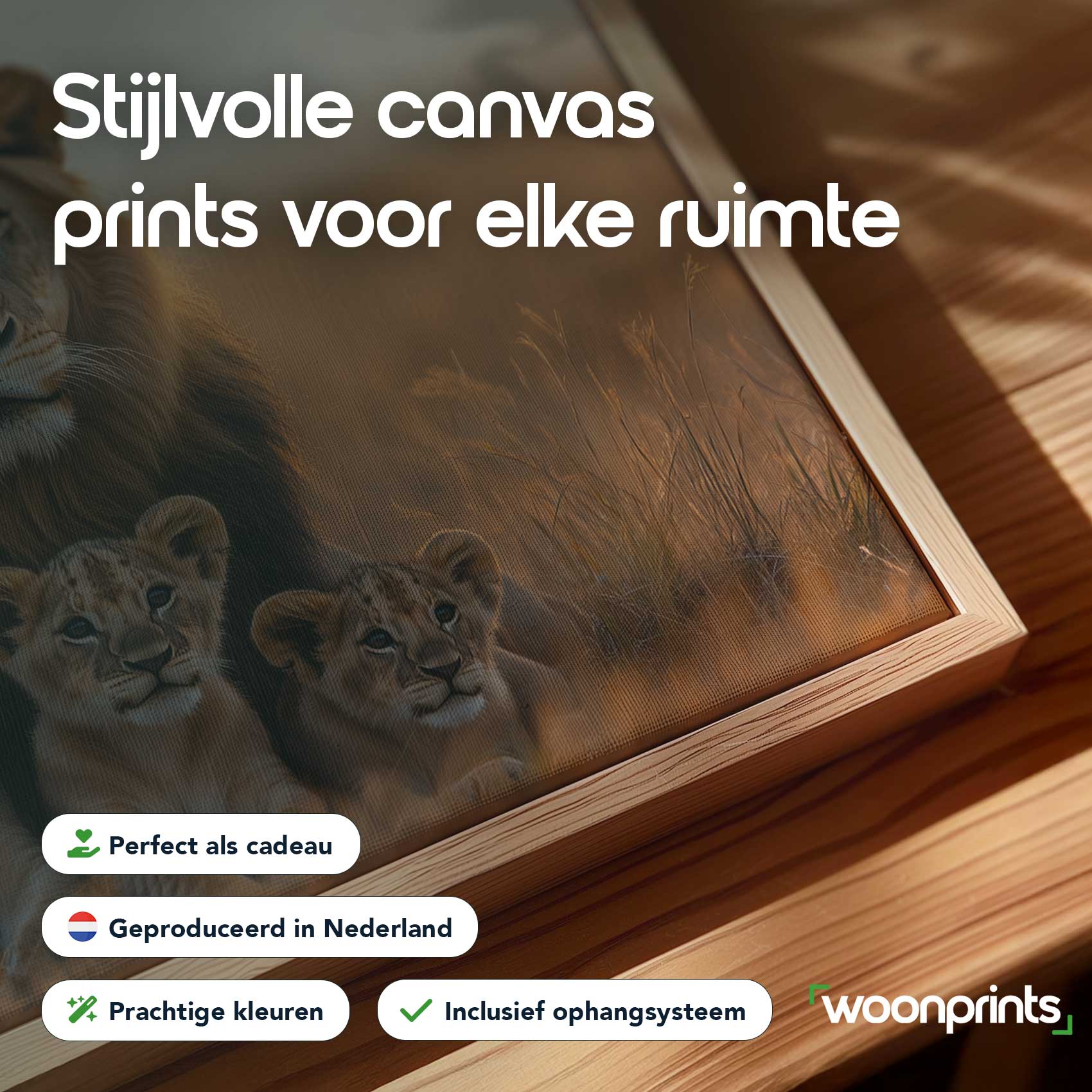 Terug naar collectie / Schilderijen / Dieren Schilderij / Leeuw met welpen in gouden veld
