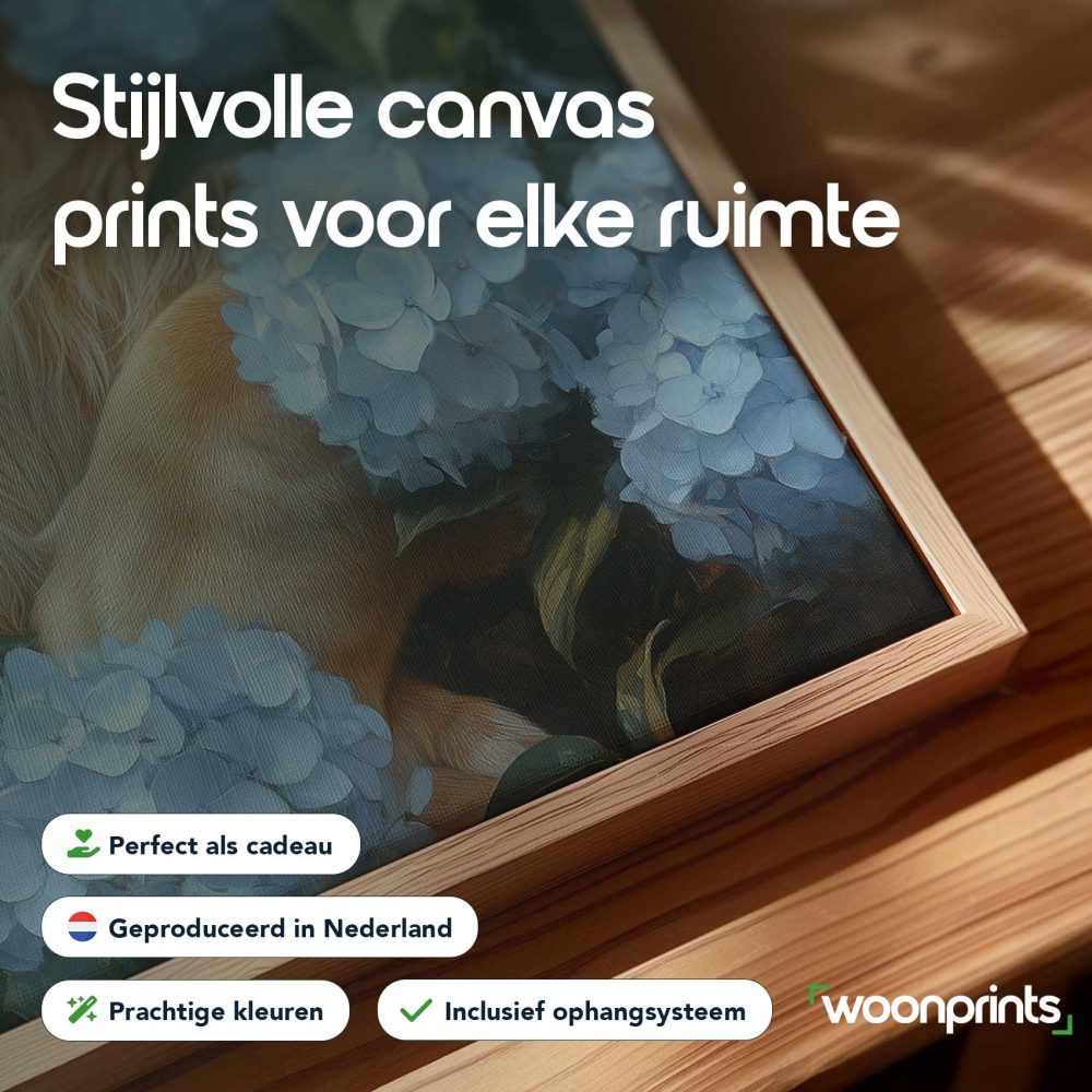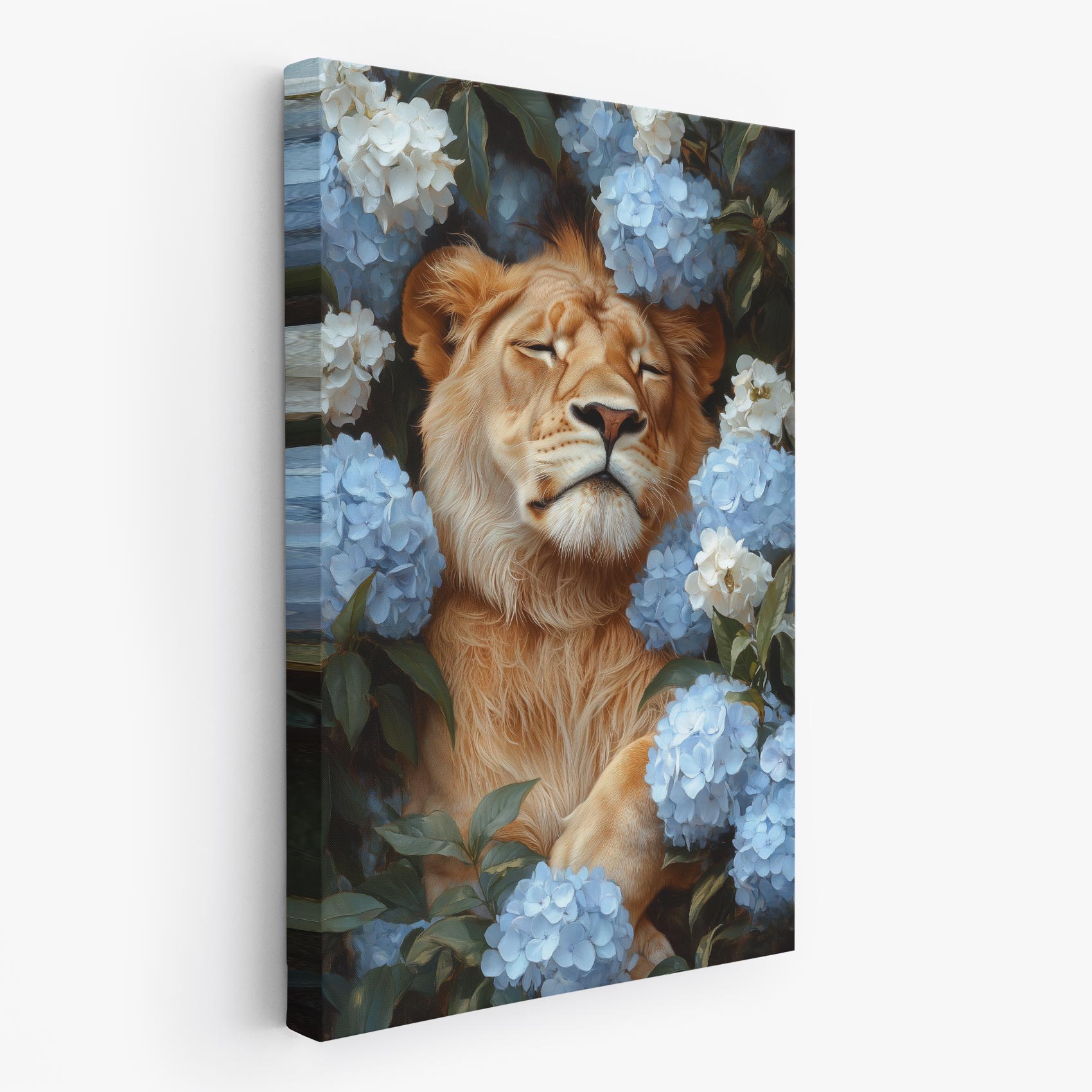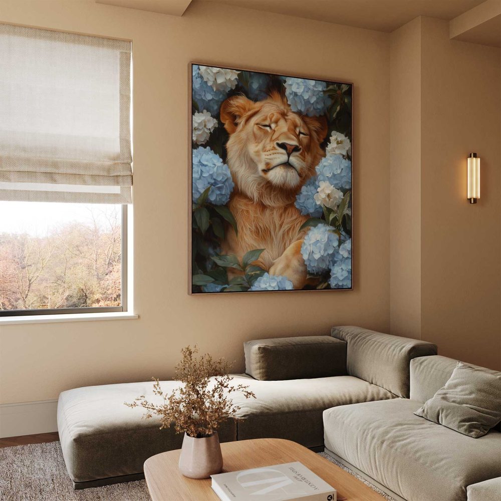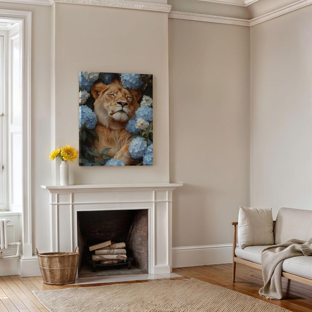 Terug naar collectie / Schilderijen / Bloemen Schilderij / Leeuw tussen blauwe hortensia’s