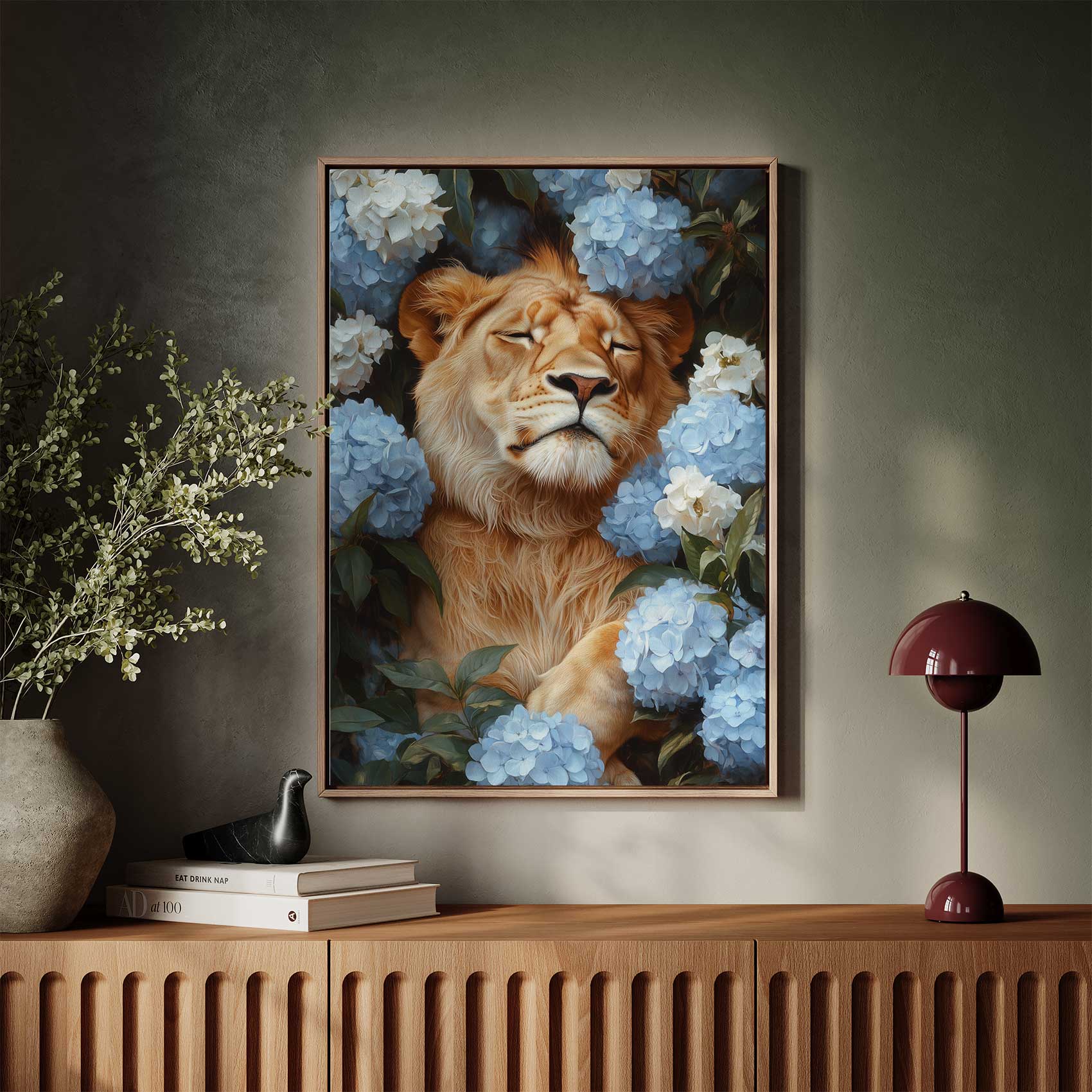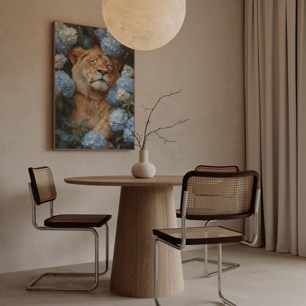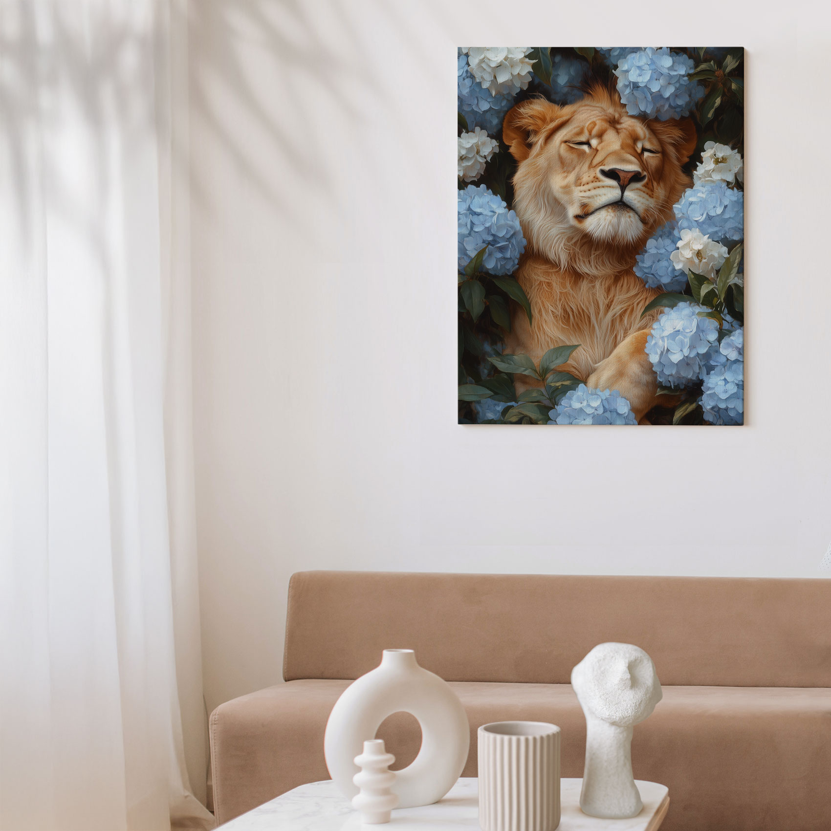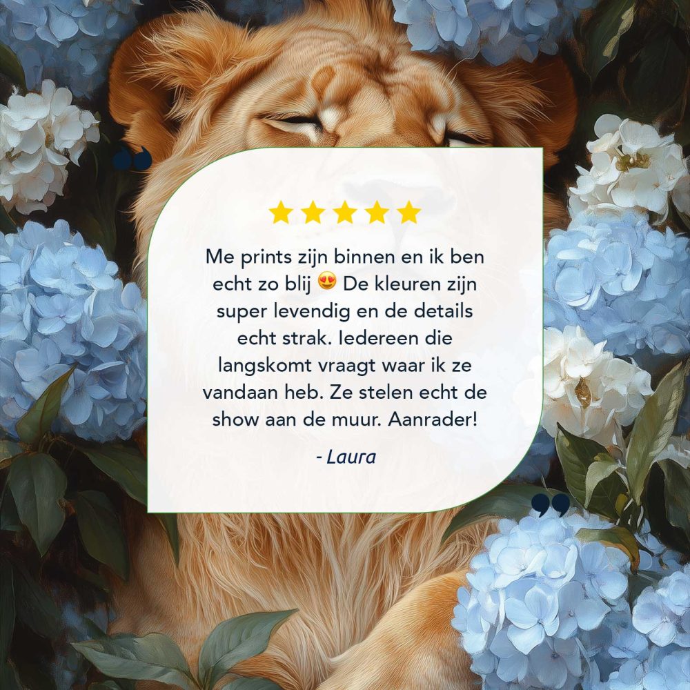 Terug naar collectie / Schilderijen / Bloemen Schilderij / Leeuw tussen blauwe hortensia’s