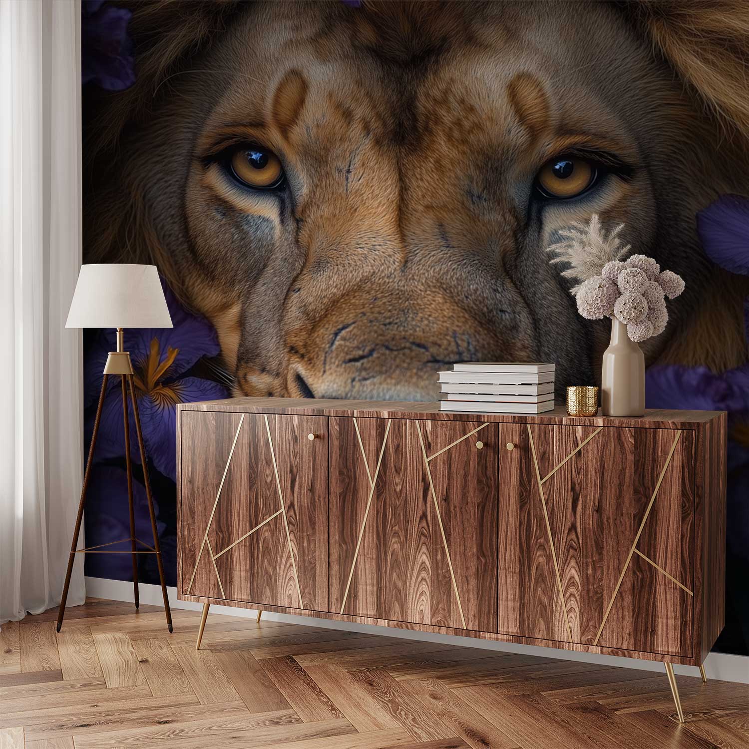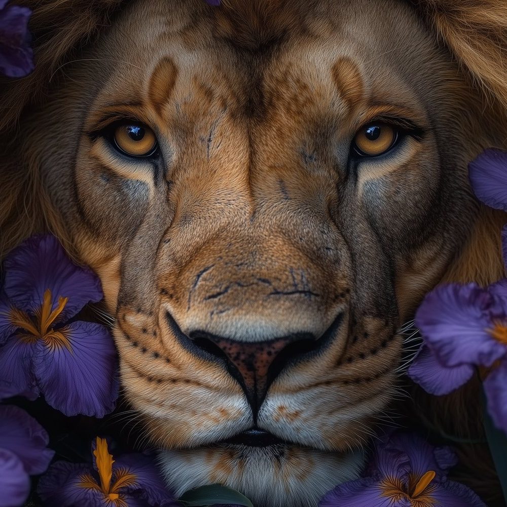 Terug naar collectie / Behang / Leeuw tussen kleurrijke bloemen behang