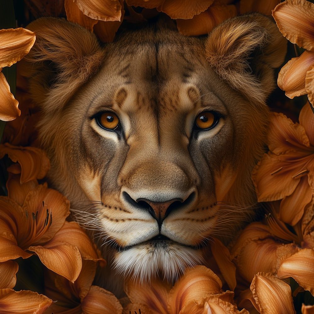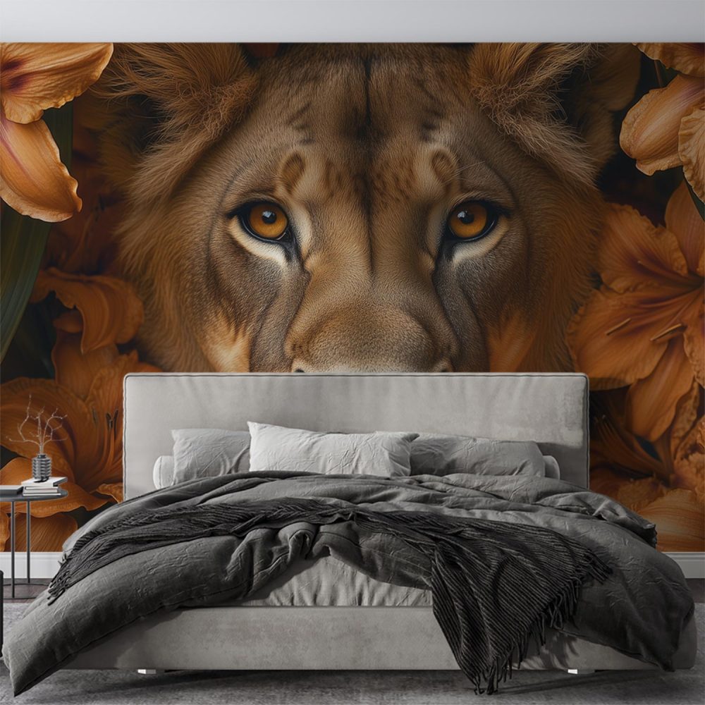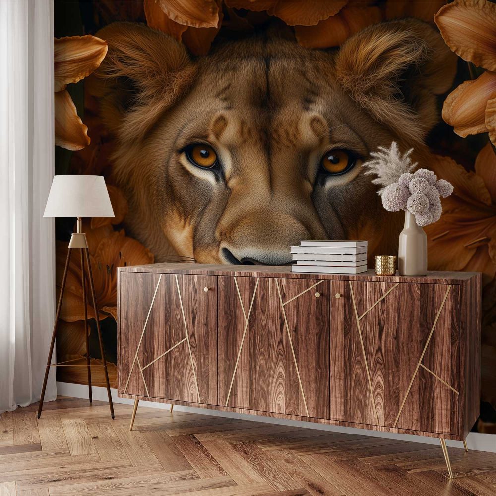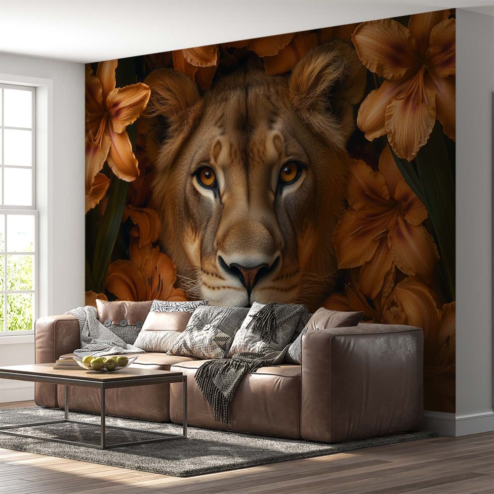 Terug naar collectie / Behang / Leeuw tussen oranje lelies behang