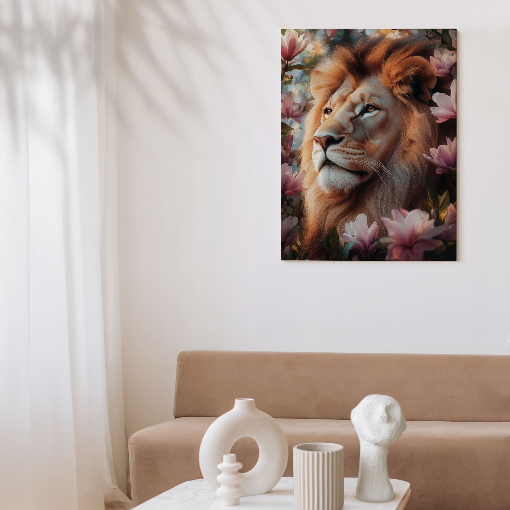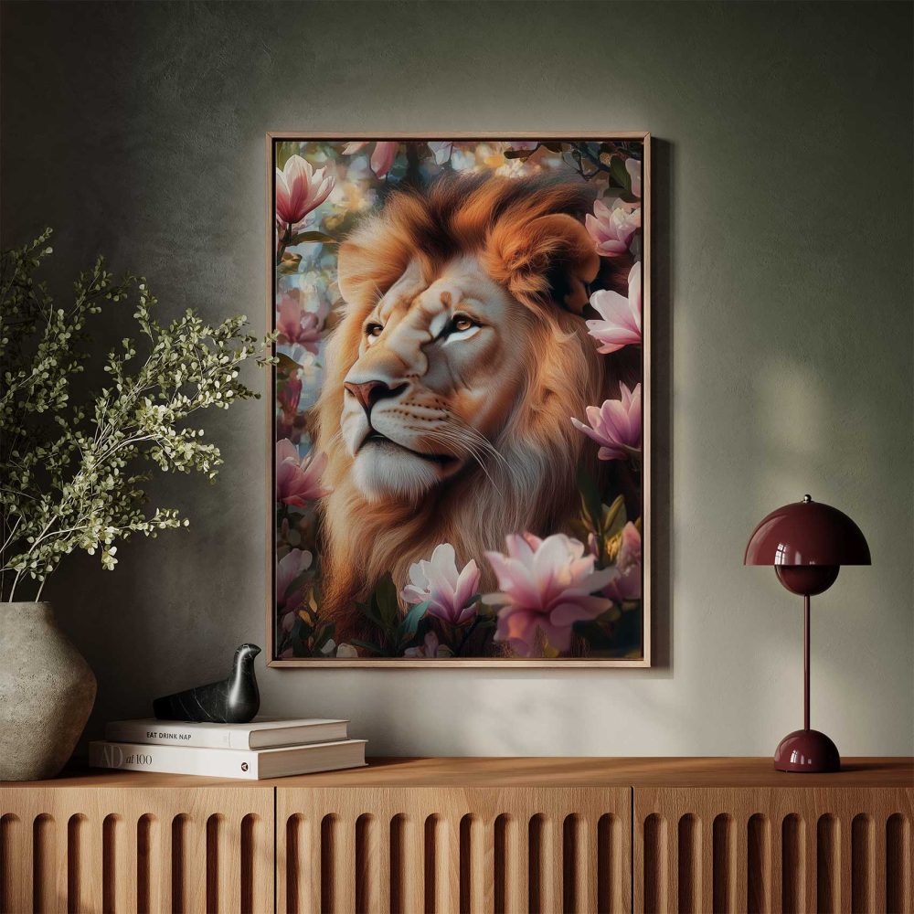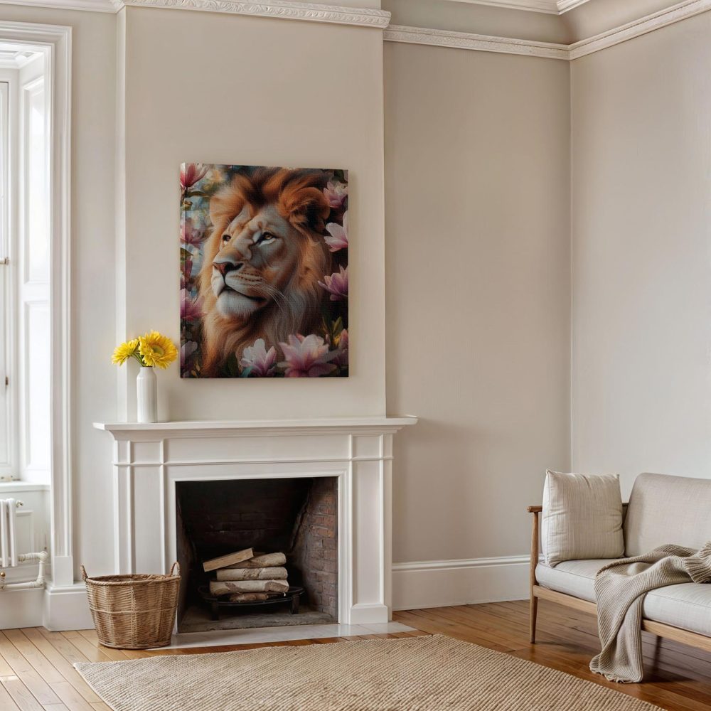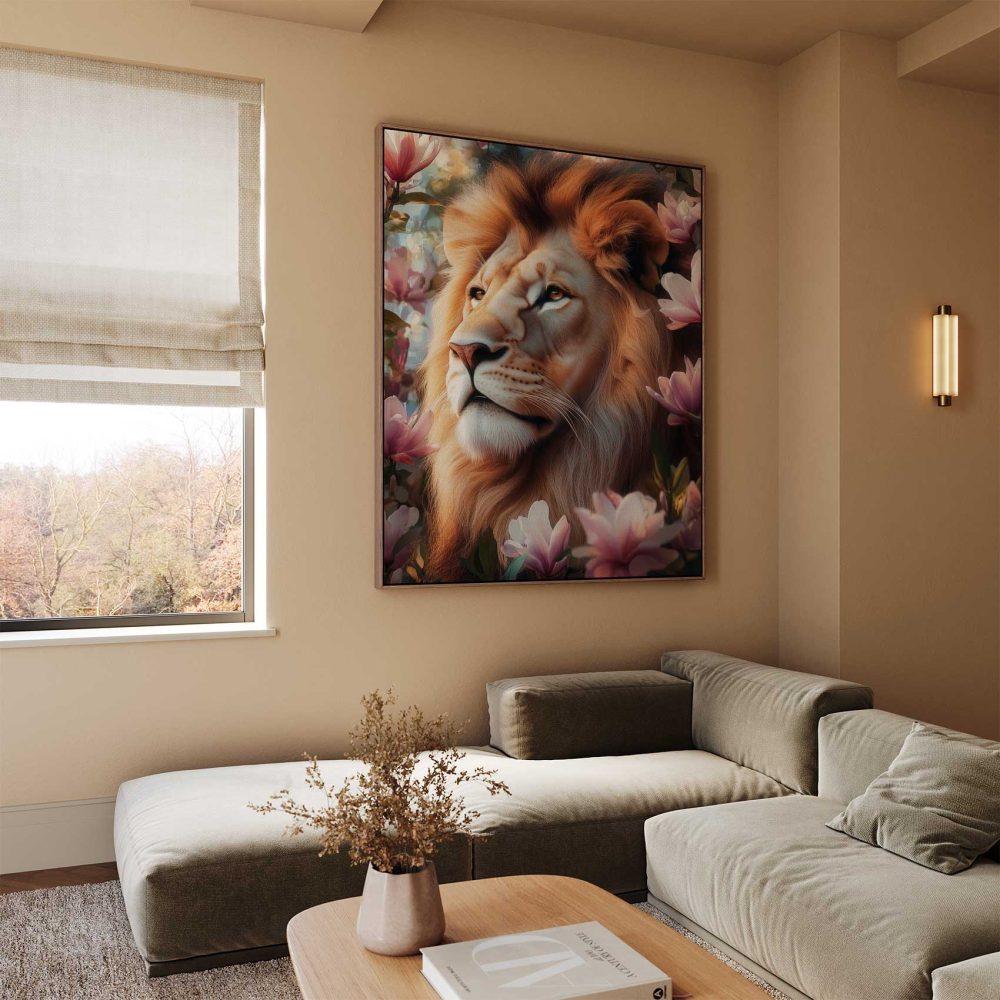 Terug naar collectie / Schilderijen / Bloemen Schilderij / Leeuw tussen roze bloemen