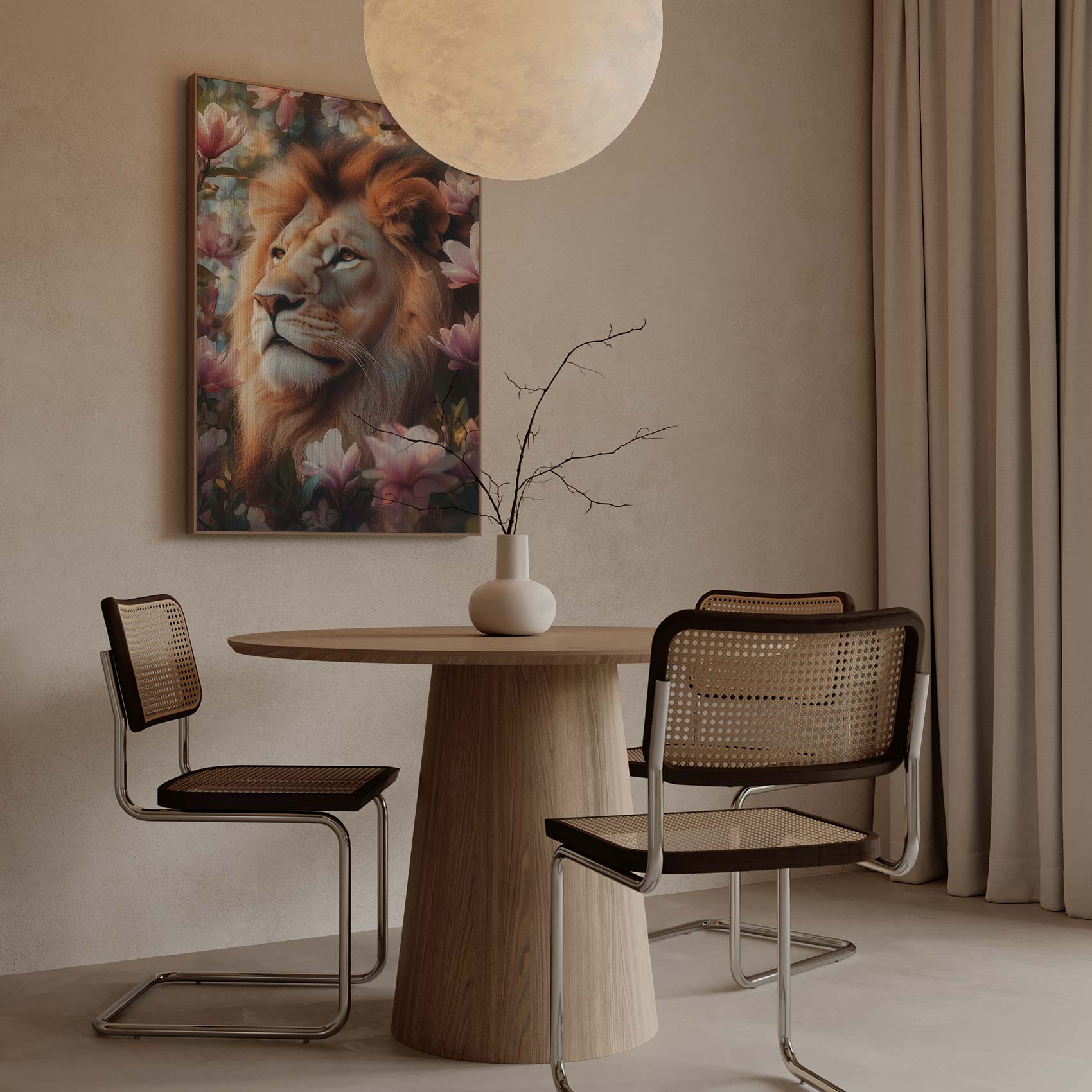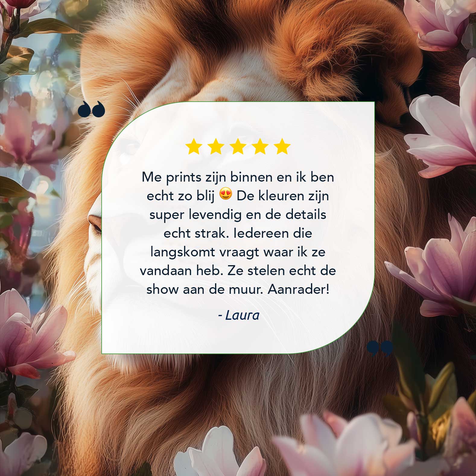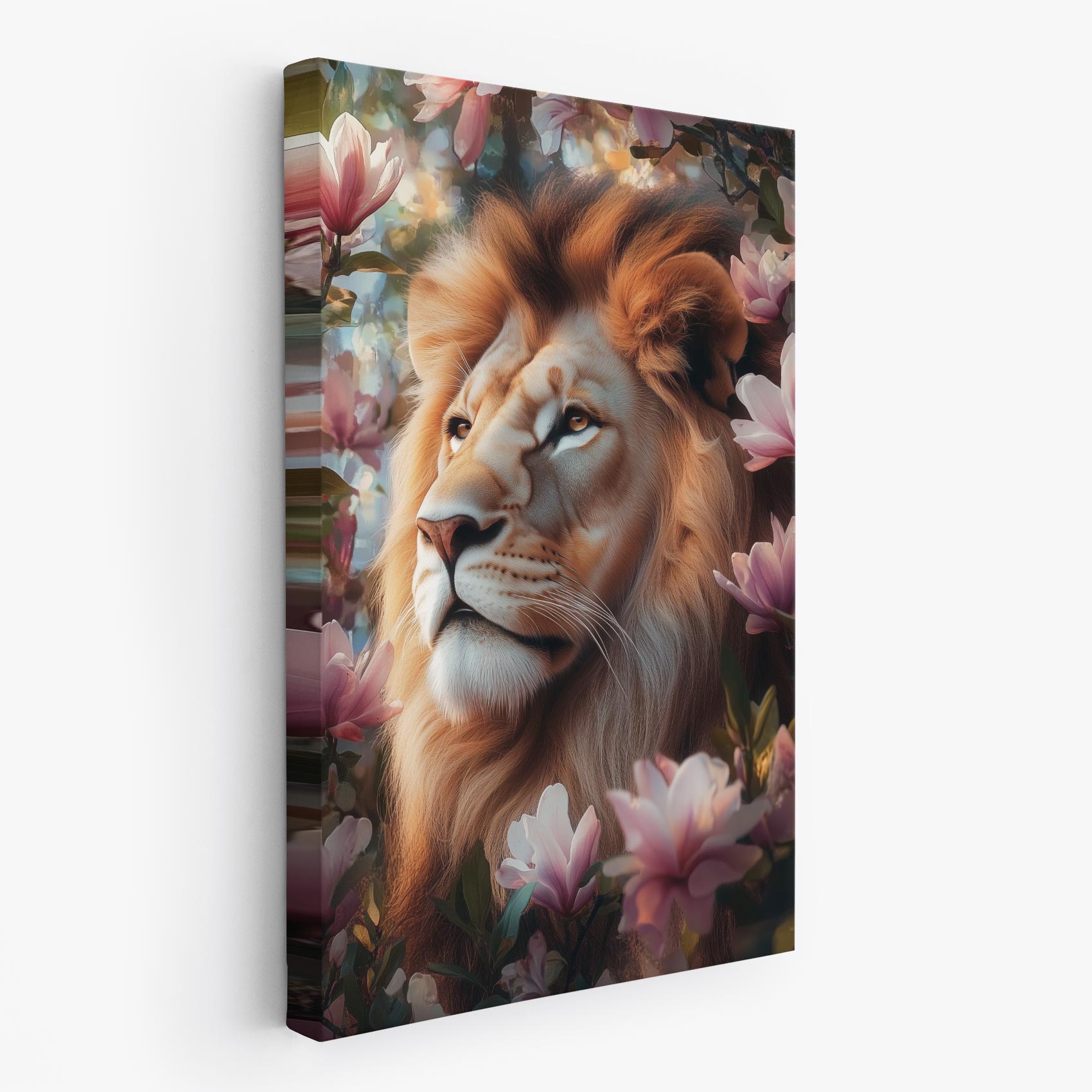 Terug naar collectie / Schilderijen / Bloemen Schilderij / Leeuw tussen roze bloemen