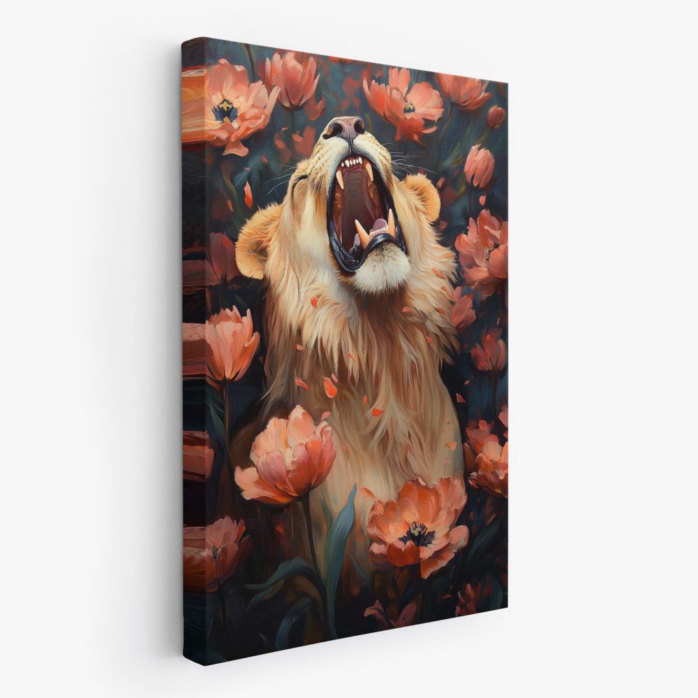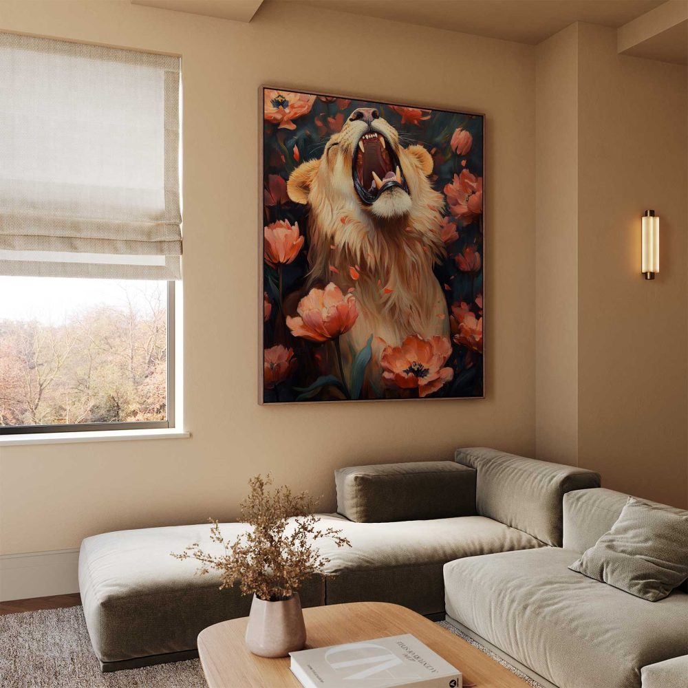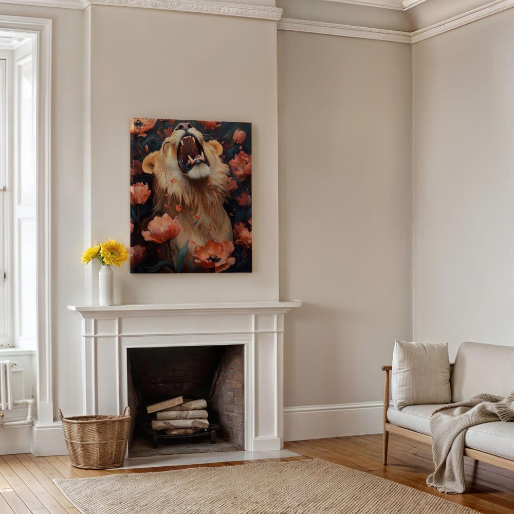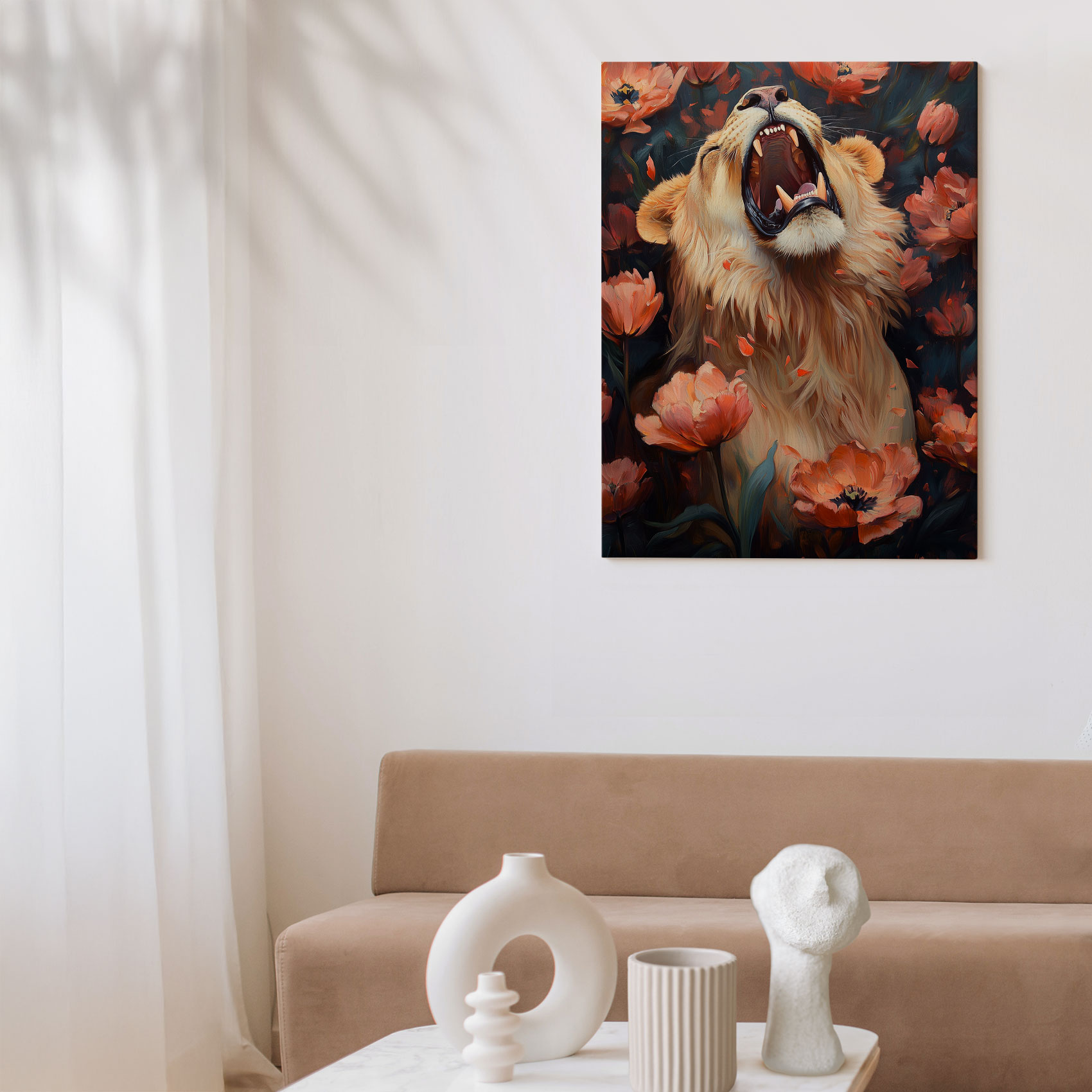 Terug naar collectie / Schilderijen / Bloemen Schilderij / Leeuw tussen vlammende bloemen