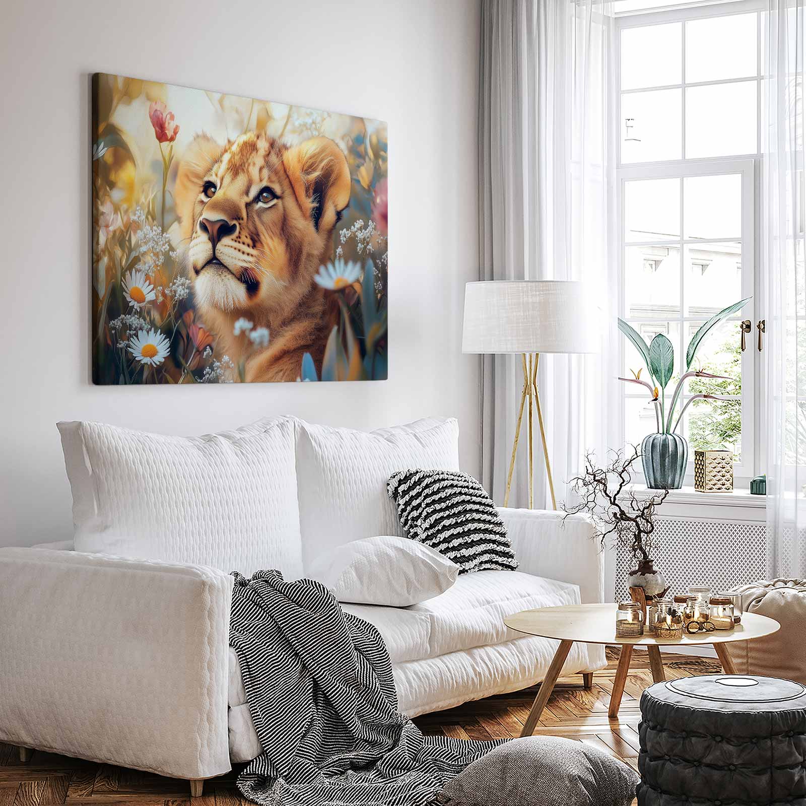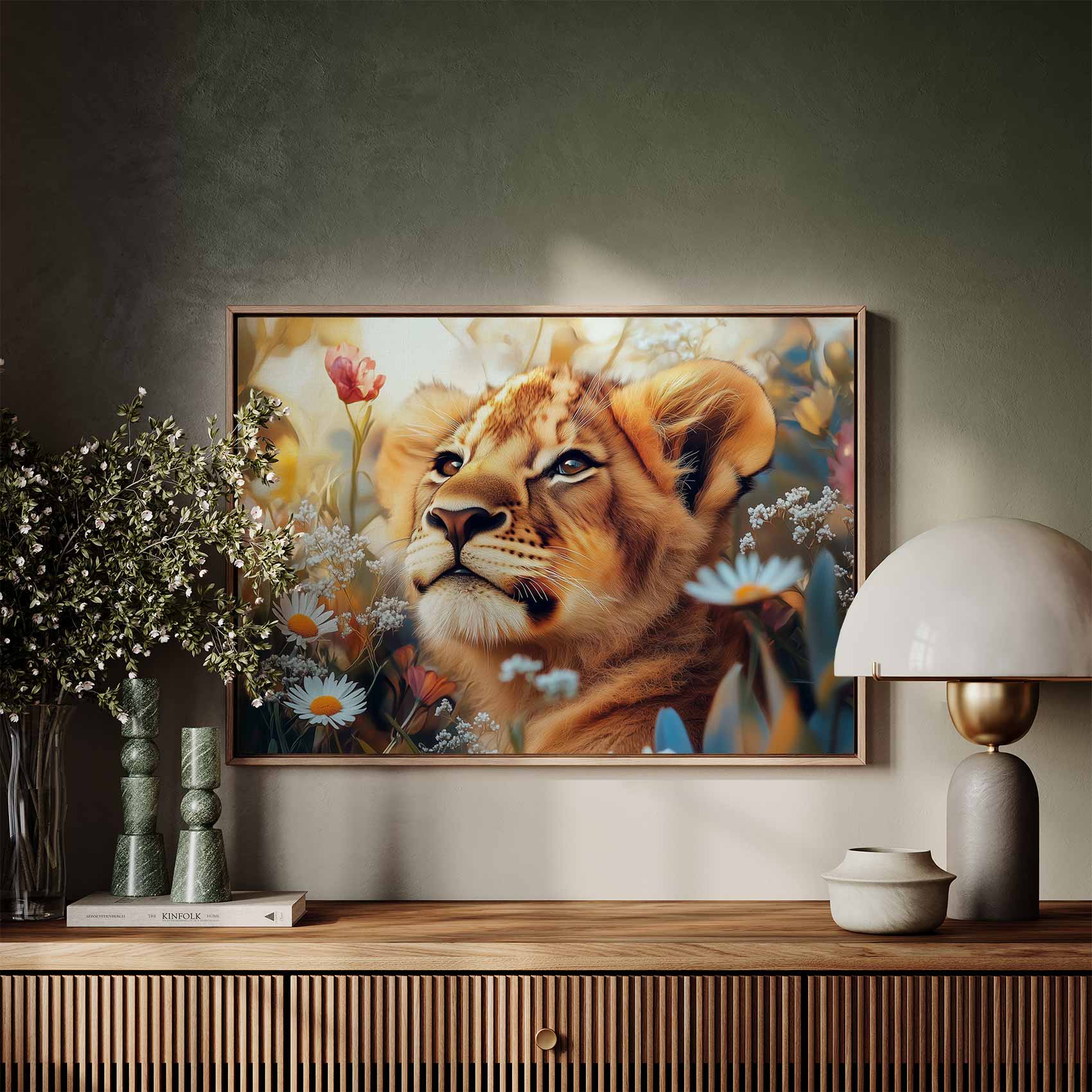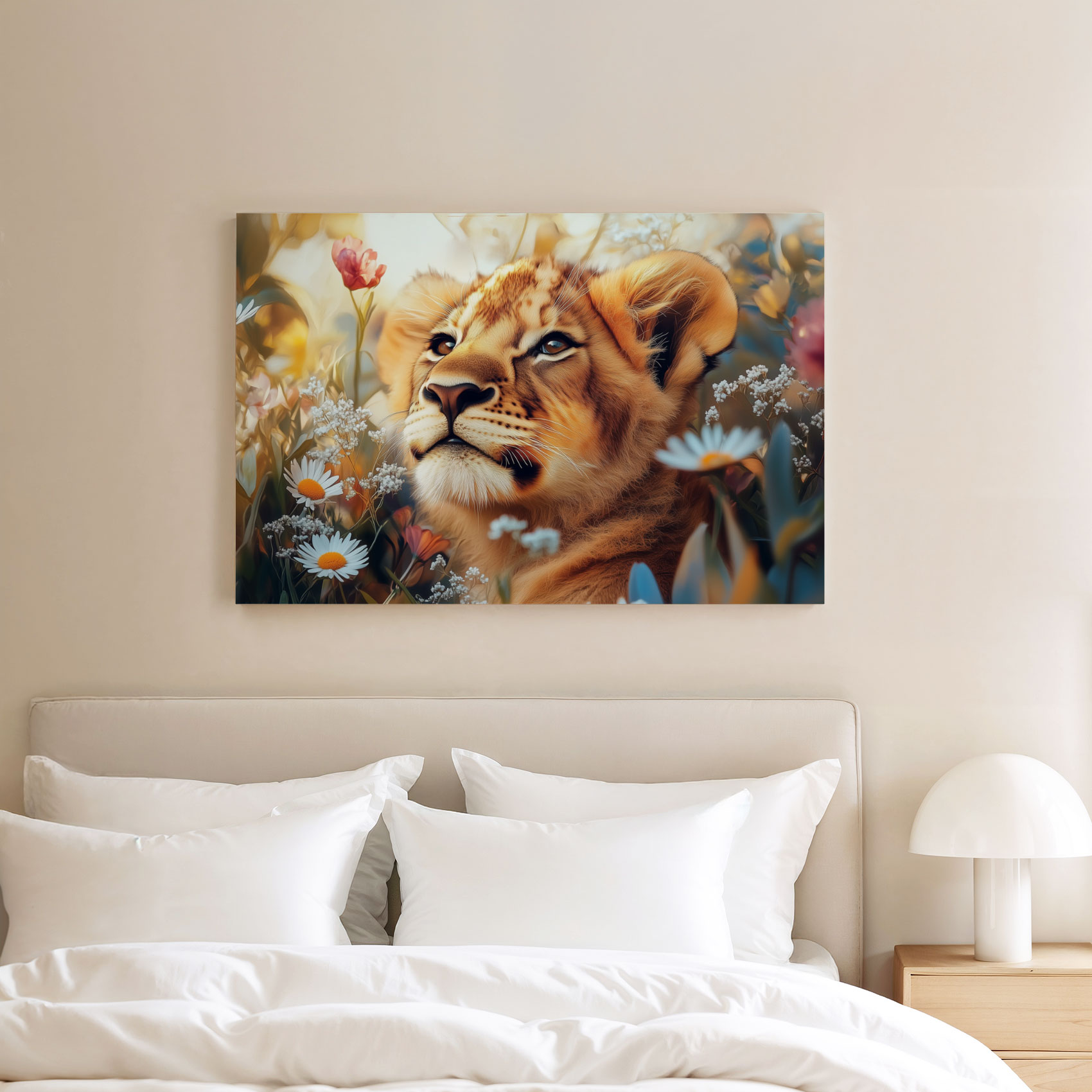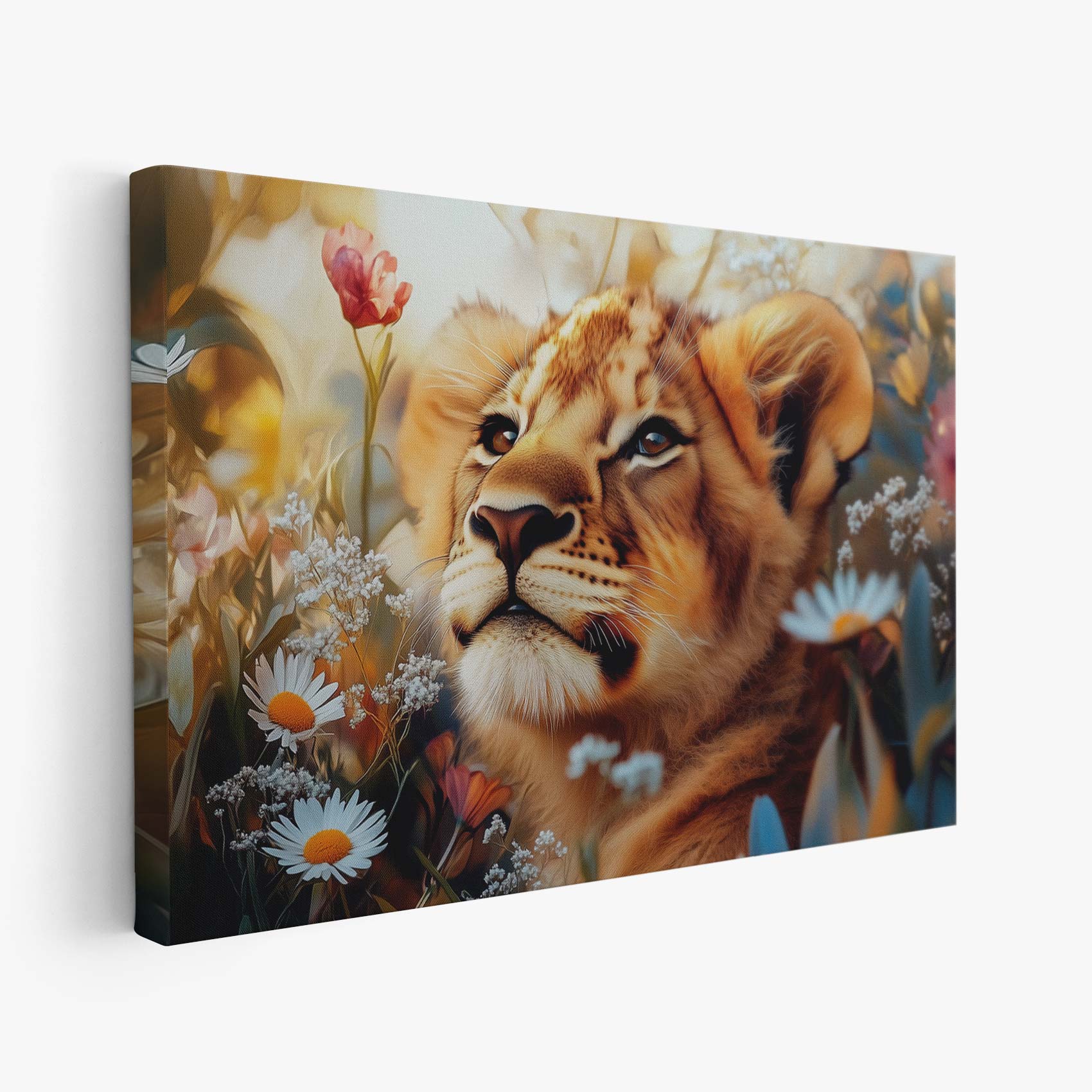 Terug naar collectie / Schilderijen / Bloemen Schilderij / Leeuwenwelp in bloemenveld