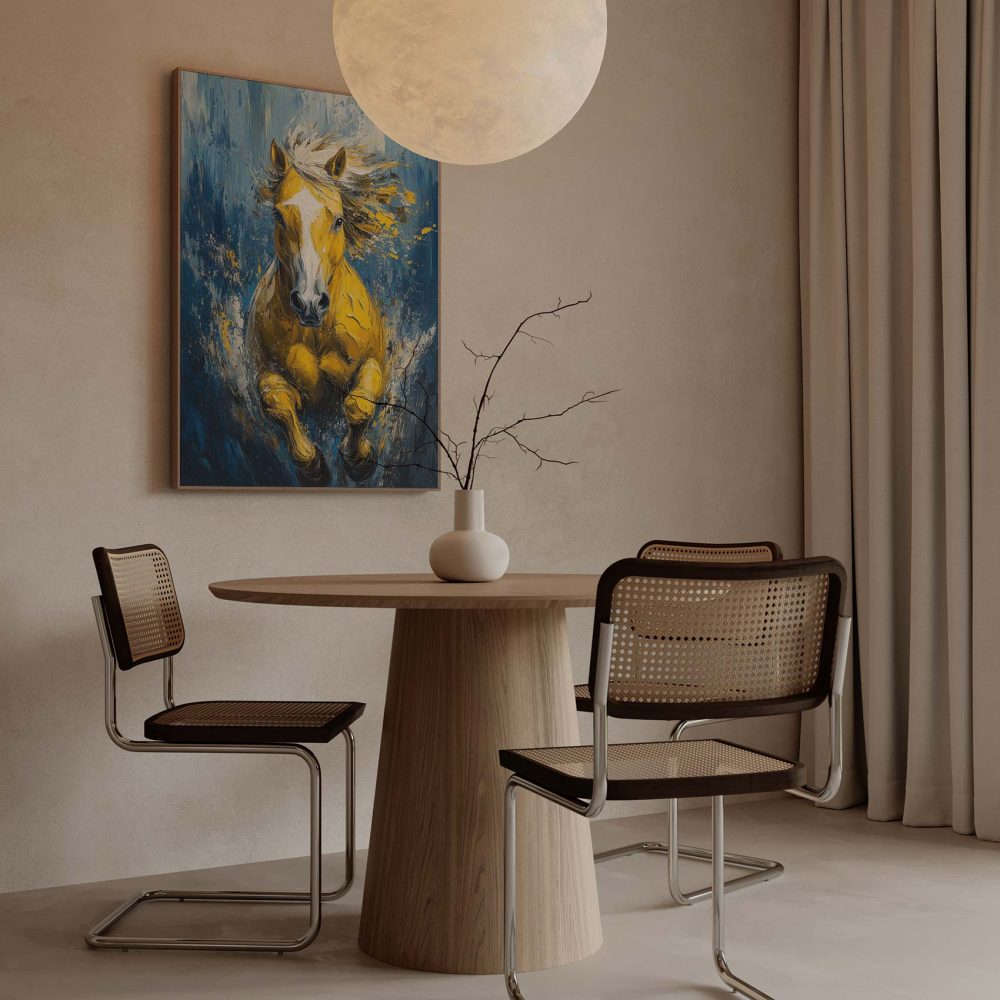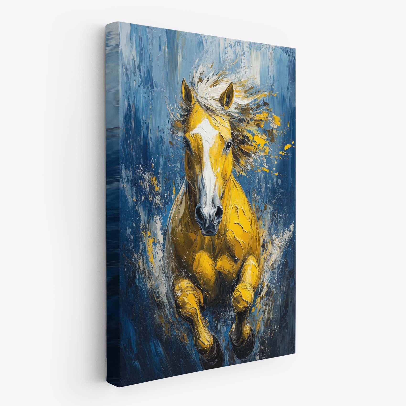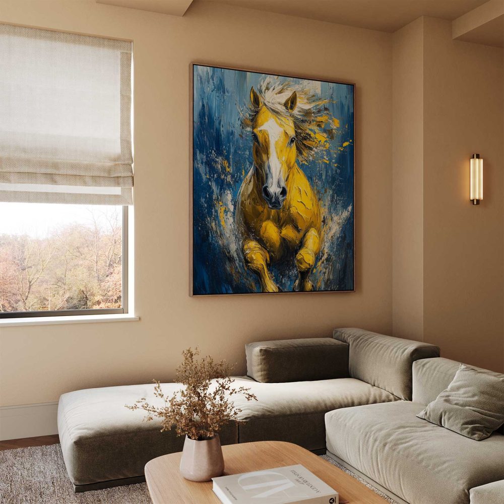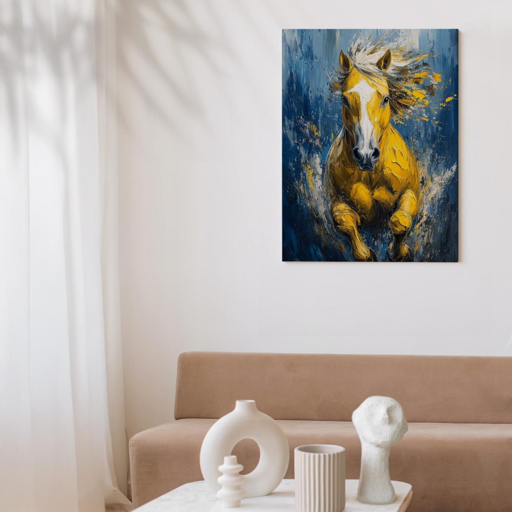 Terug naar collectie / Schilderijen / Abstract Schilderij / Levendige gele renpaard impressie