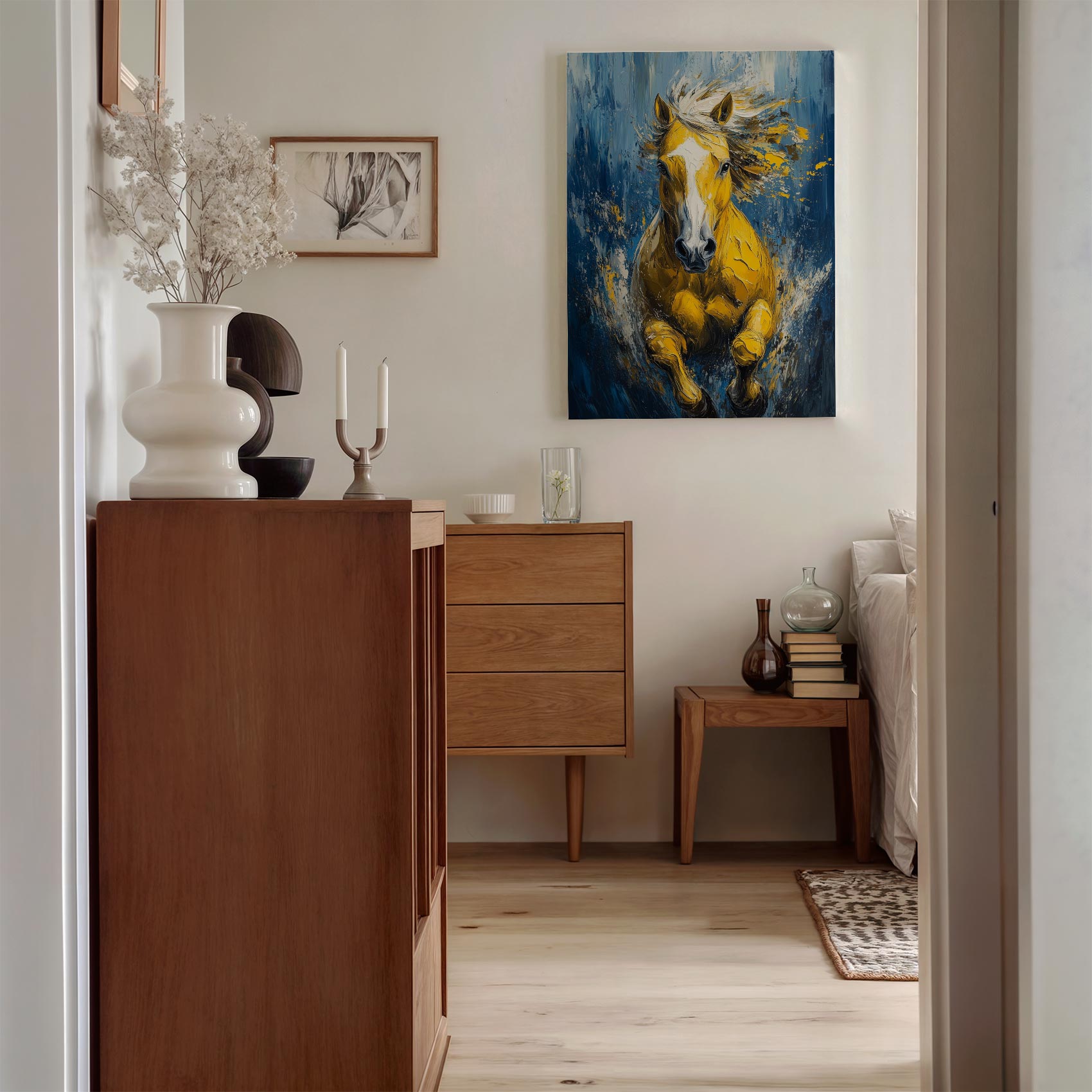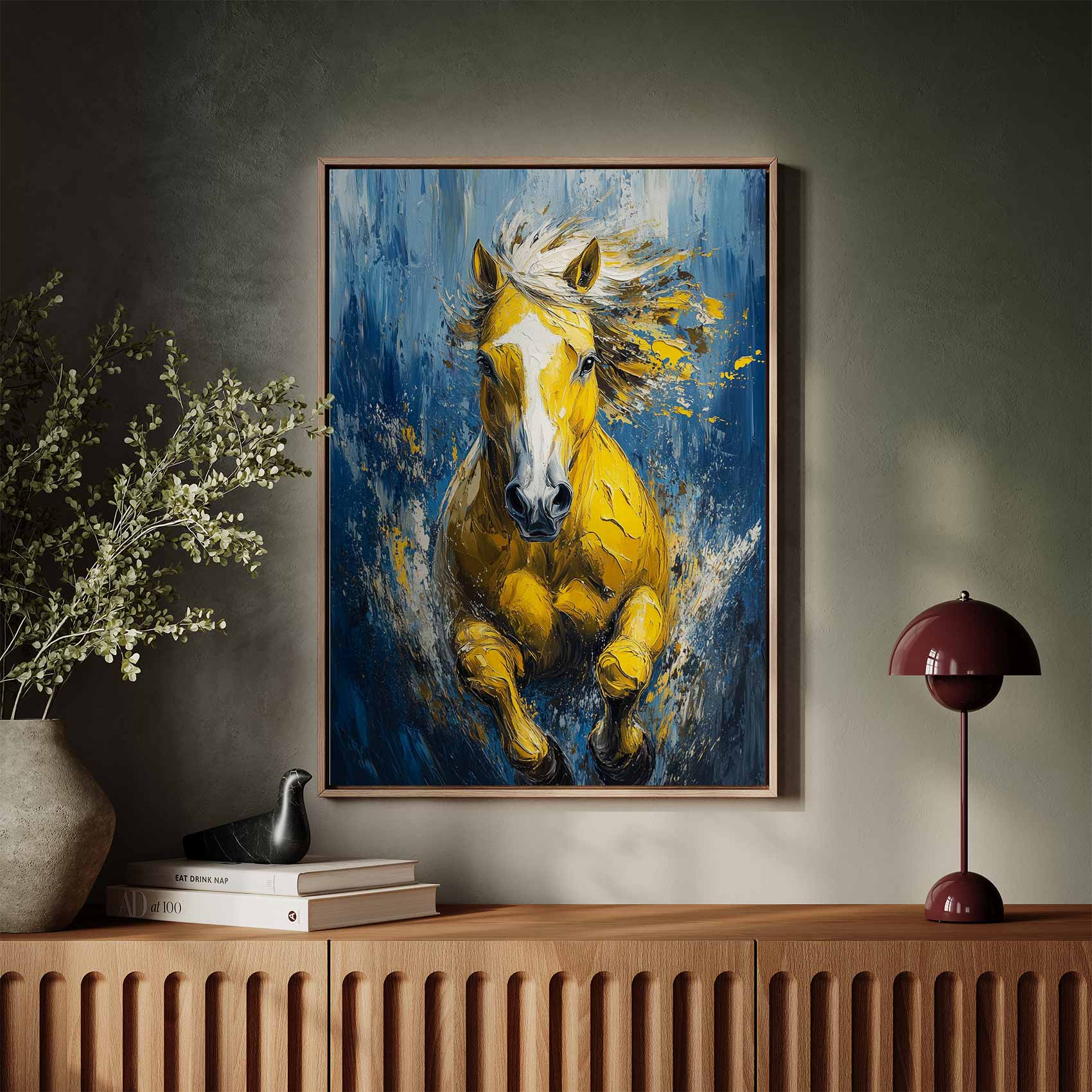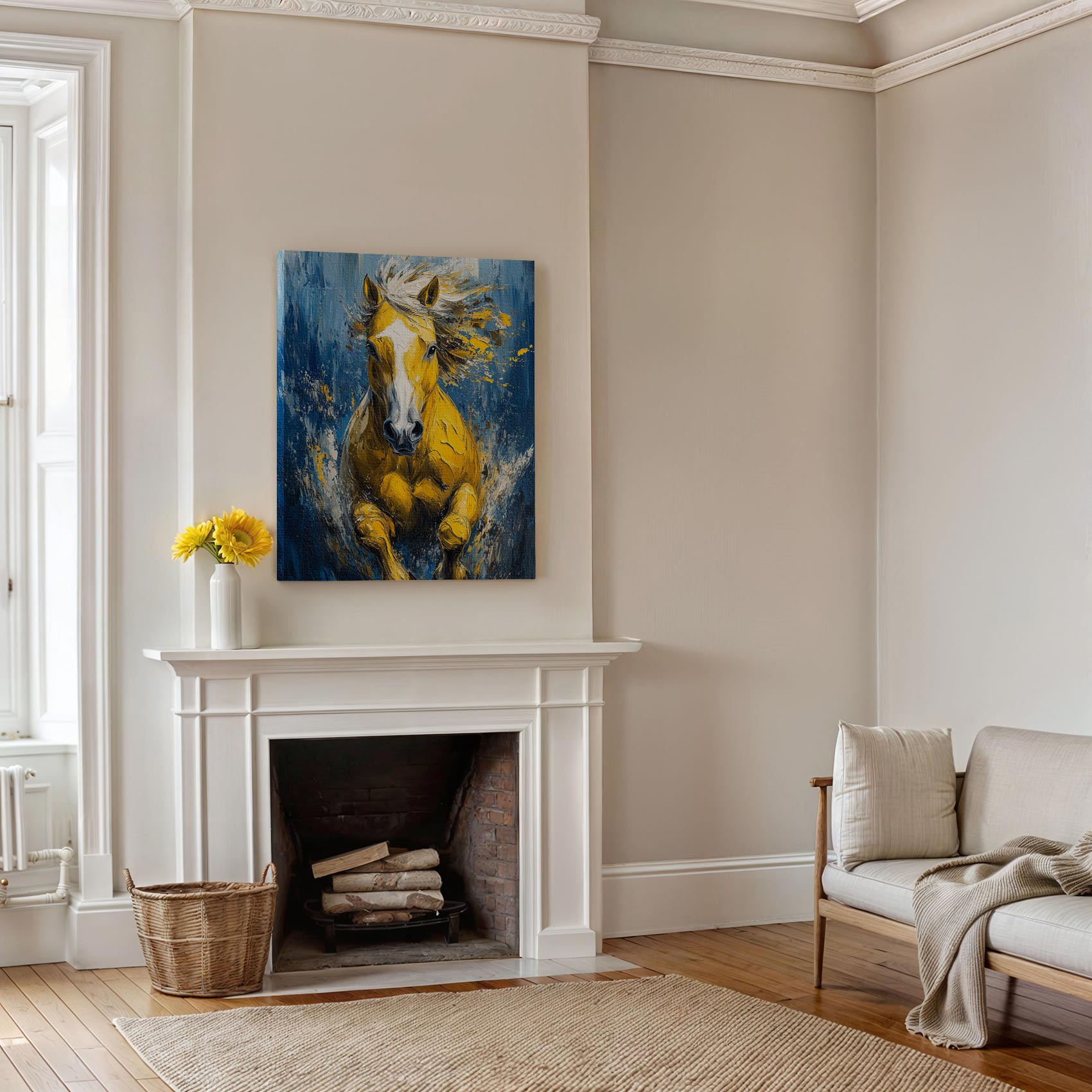 Terug naar collectie / Schilderijen / Abstract Schilderij / Levendige gele renpaard impressie