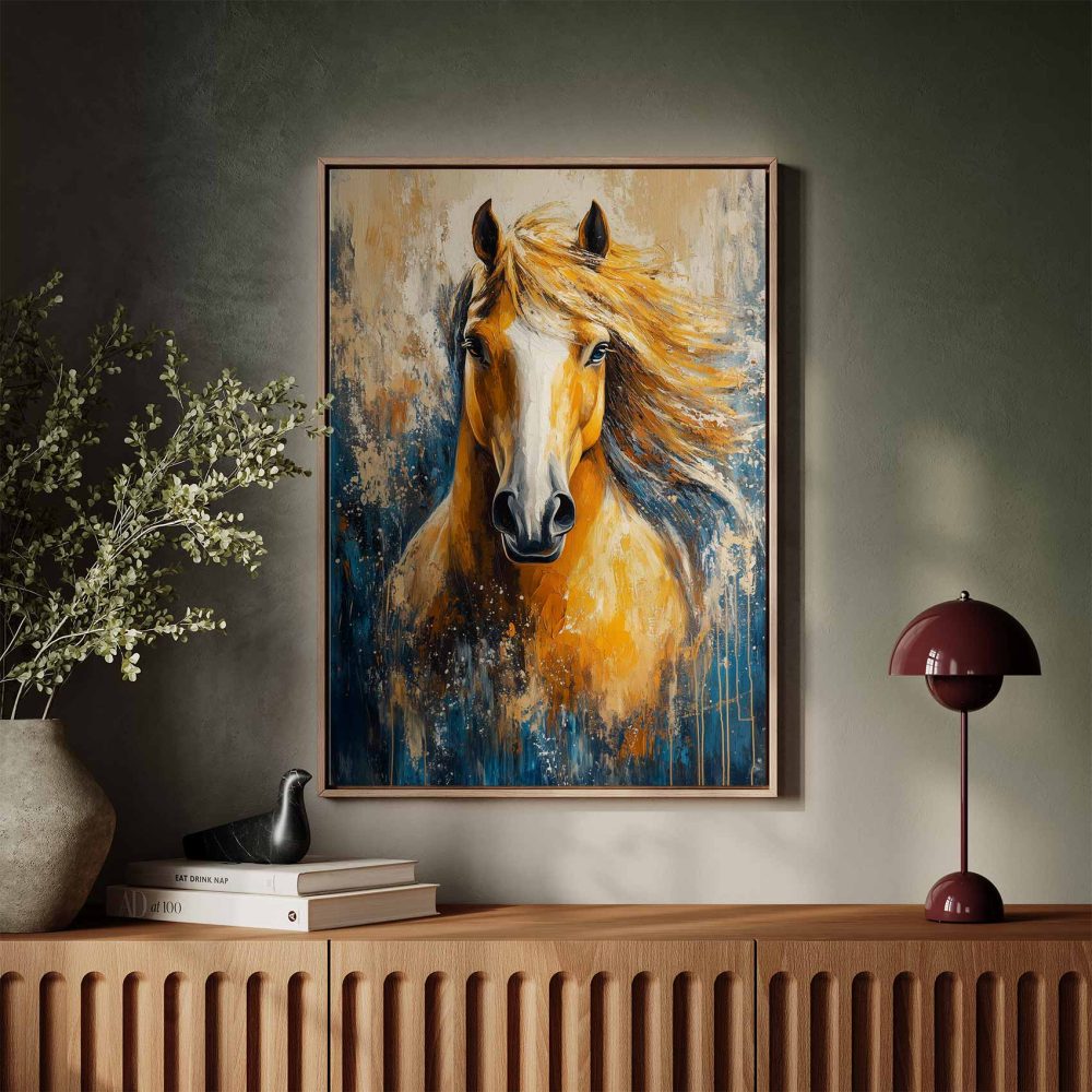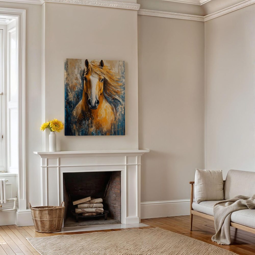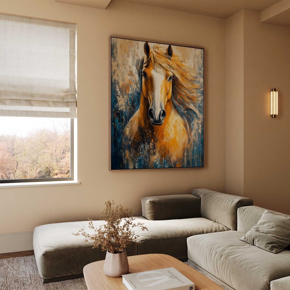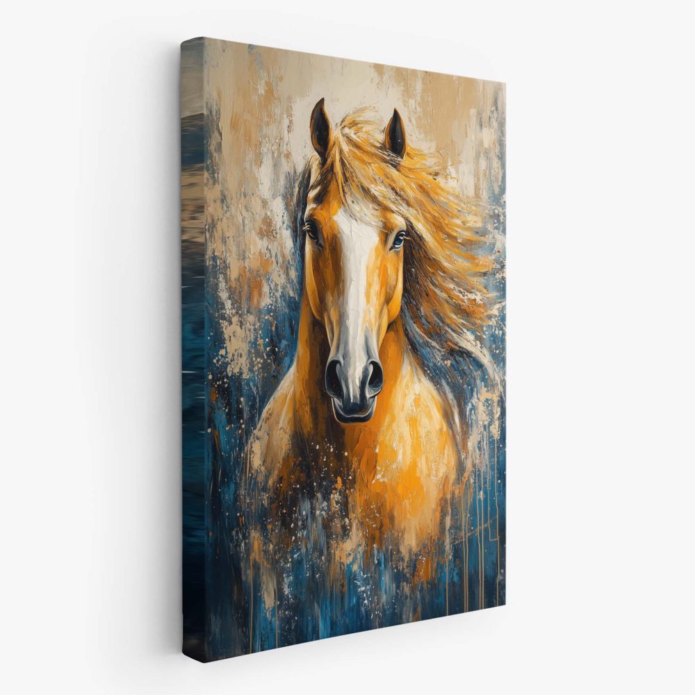 Terug naar collectie / Schilderijen / Abstract Schilderij / Levendige oranje-witte paardenschildering
