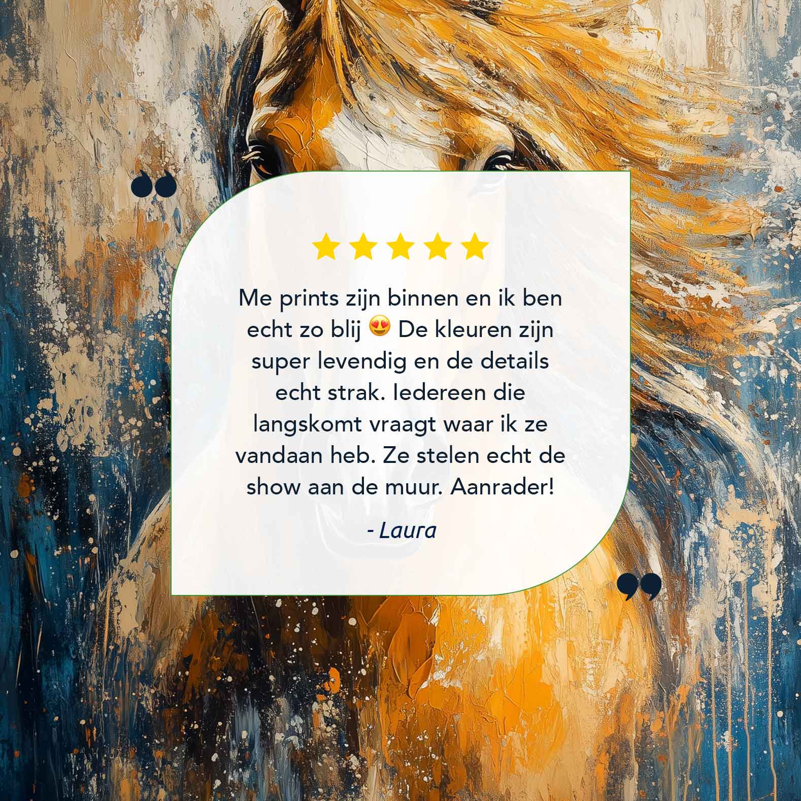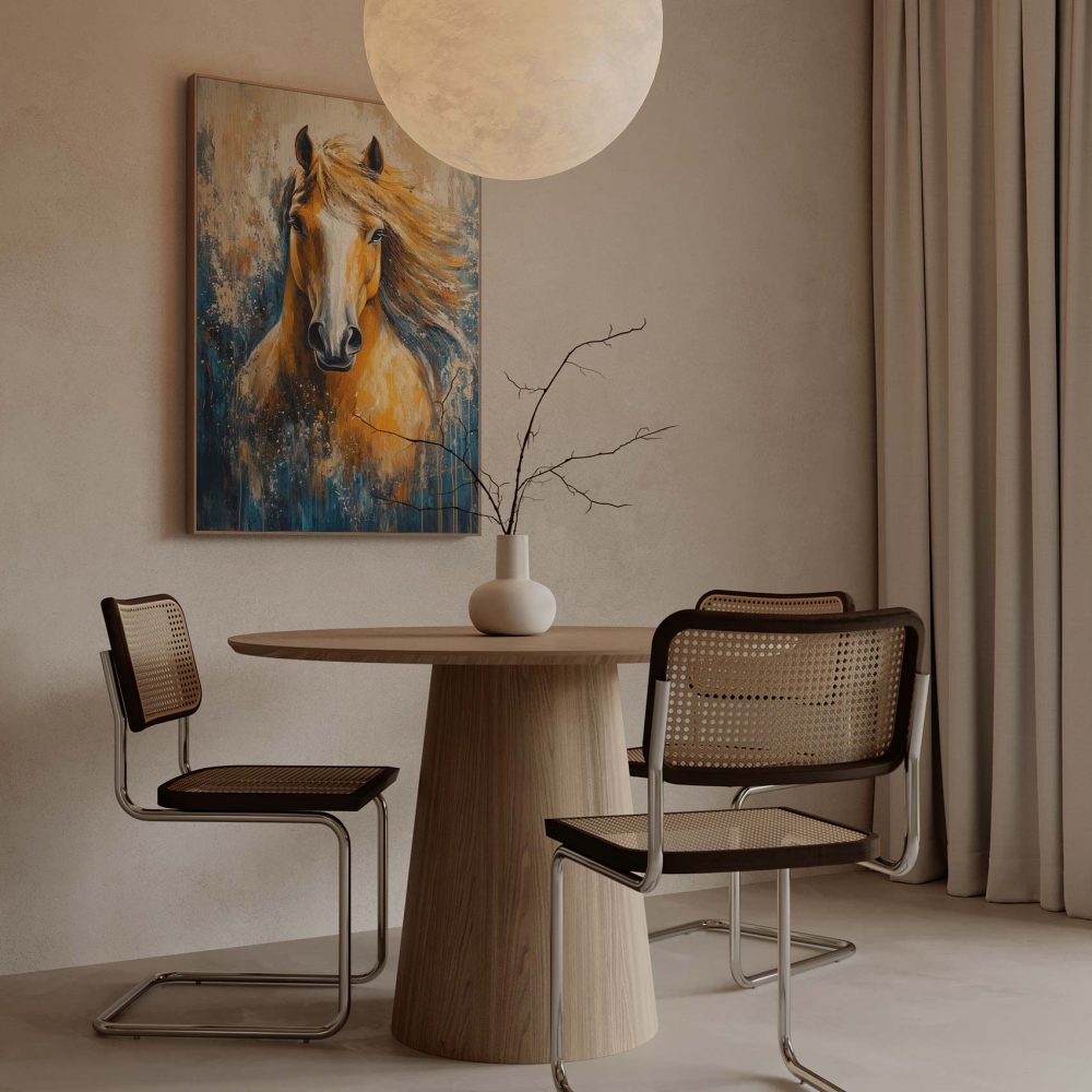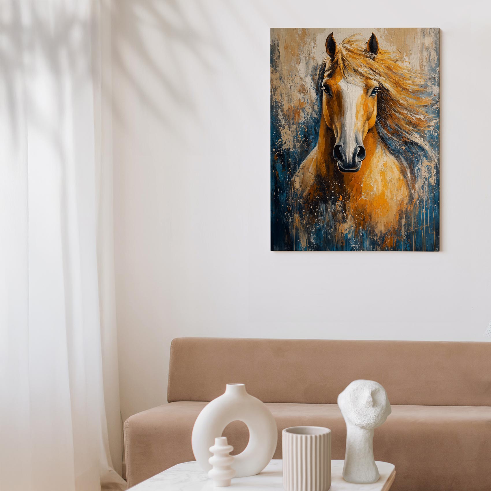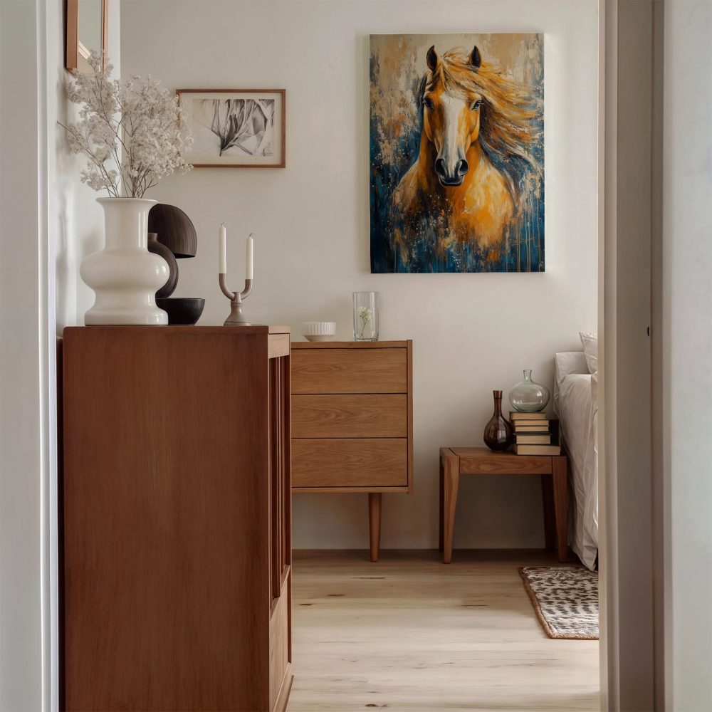 Terug naar collectie / Schilderijen / Abstract Schilderij / Levendige oranje-witte paardenschildering