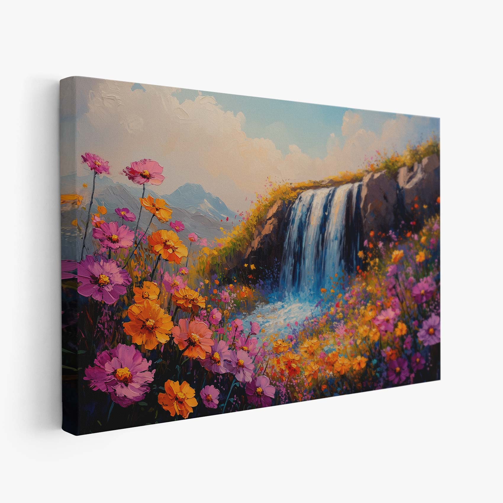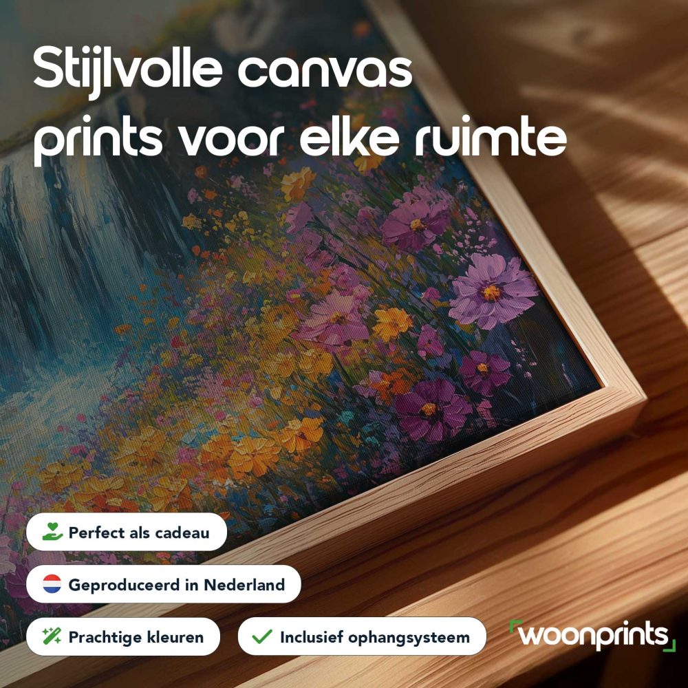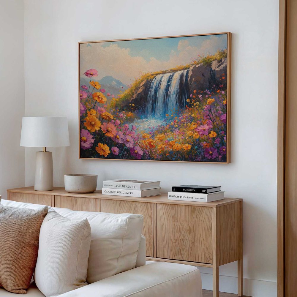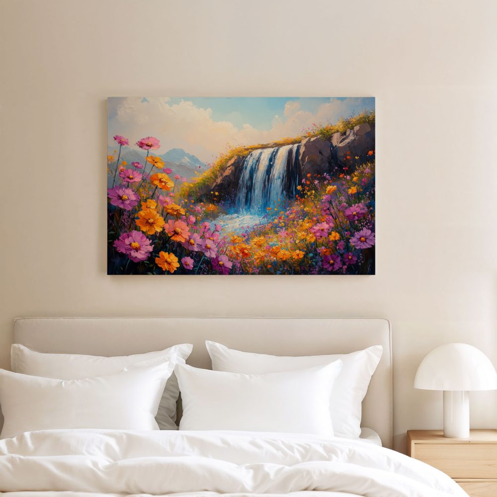 Terug naar collectie / Schilderijen / Bergen Schilderij / Levendige Watervalbloemenscène