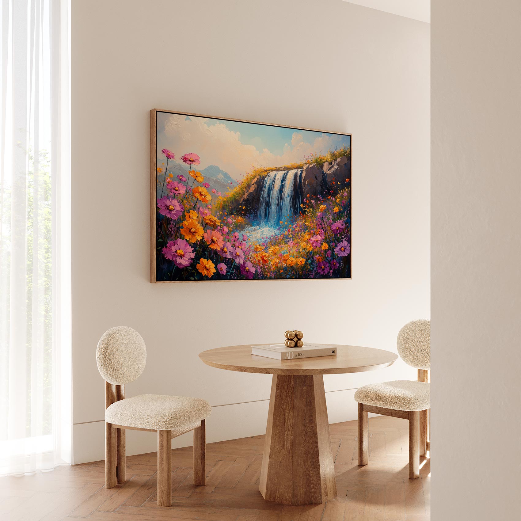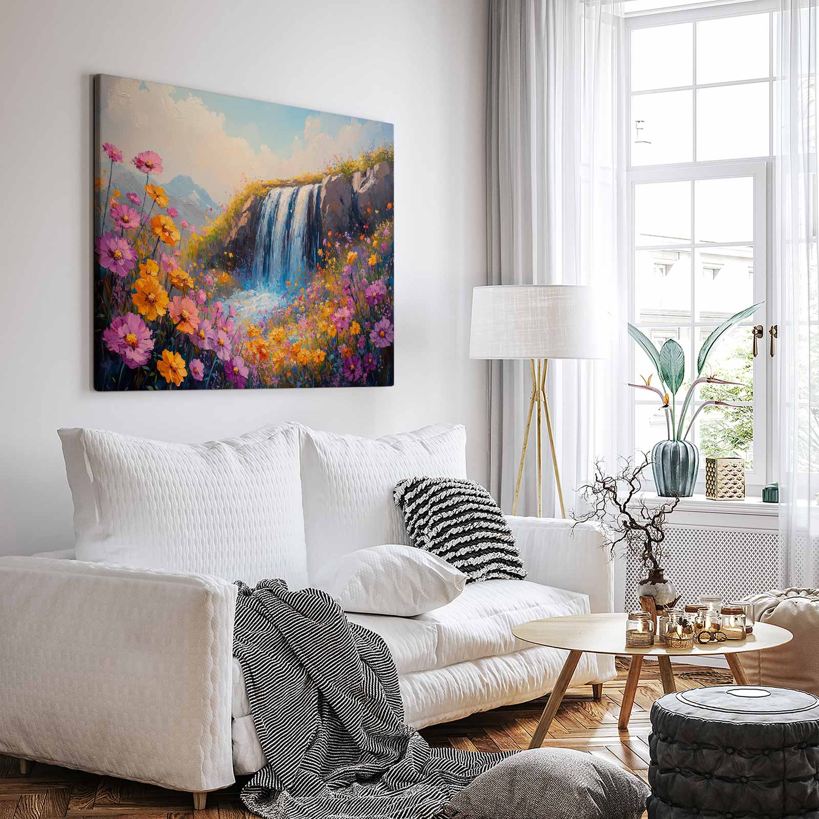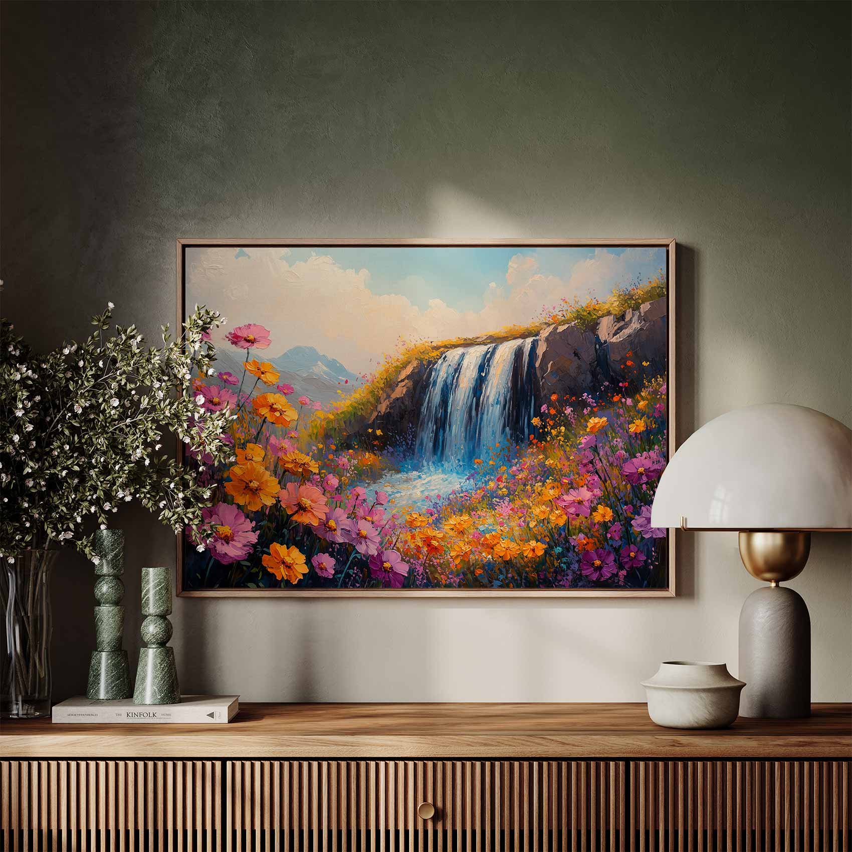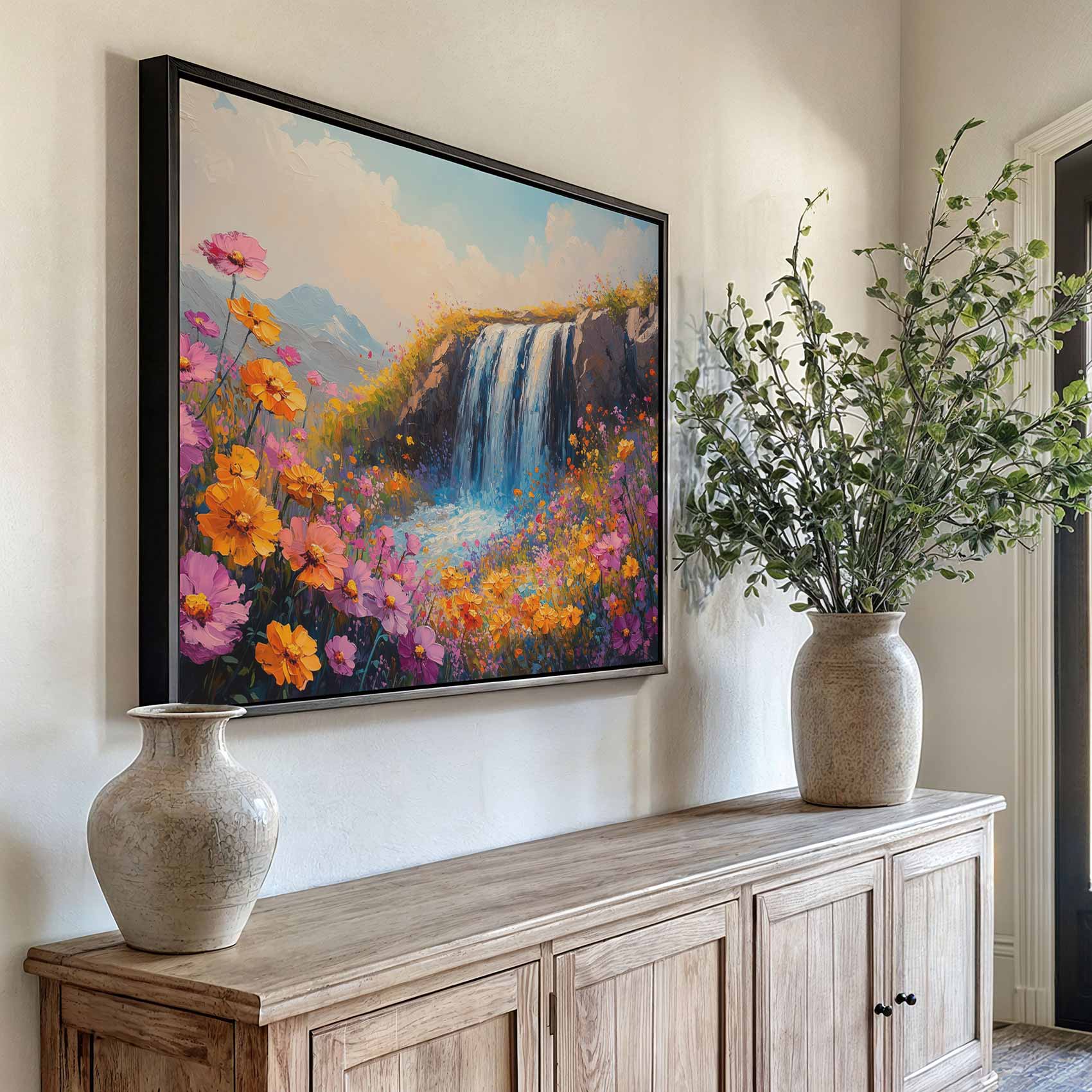 Terug naar collectie / Schilderijen / Bergen Schilderij / Levendige Watervalbloemenscène
