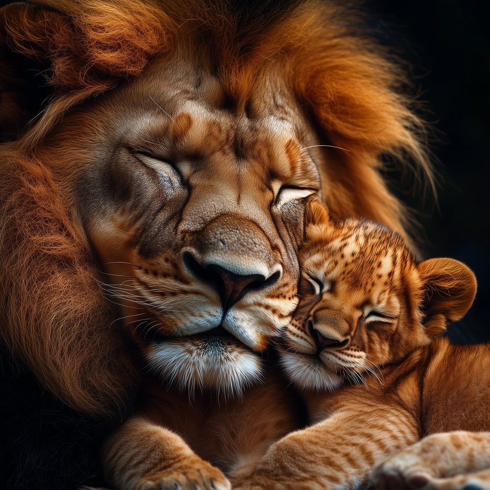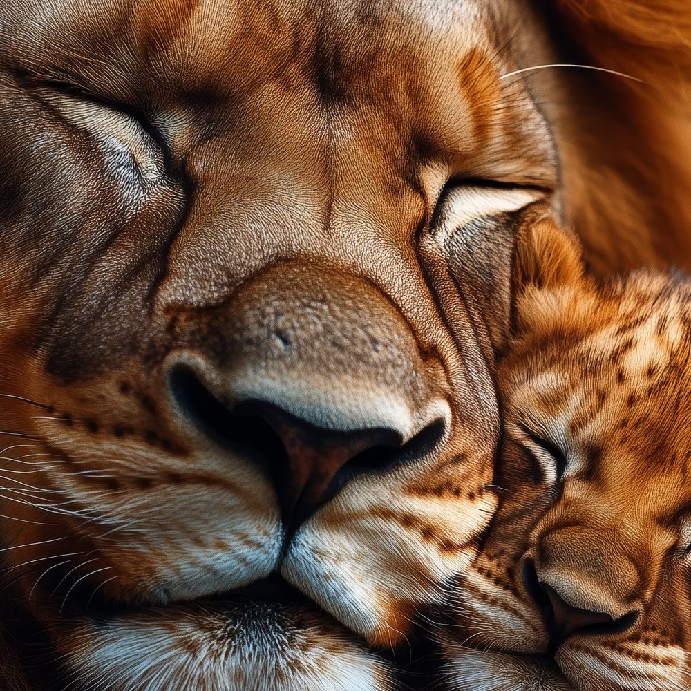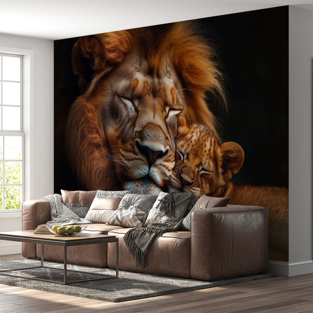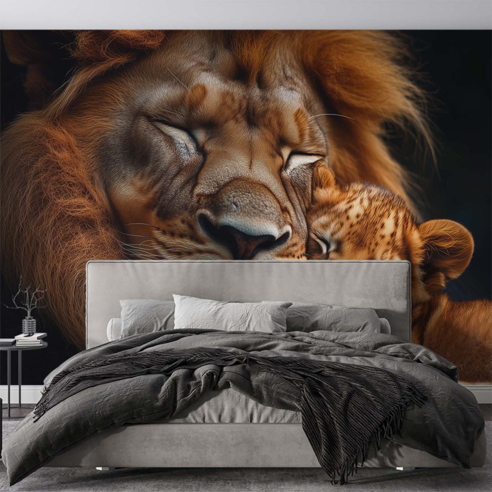 Liefdevol leeuwenmoeder en welp behang