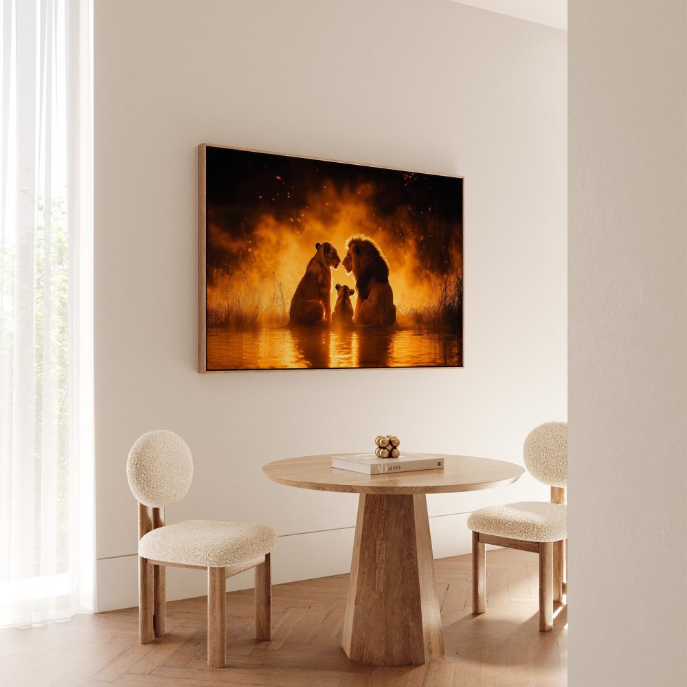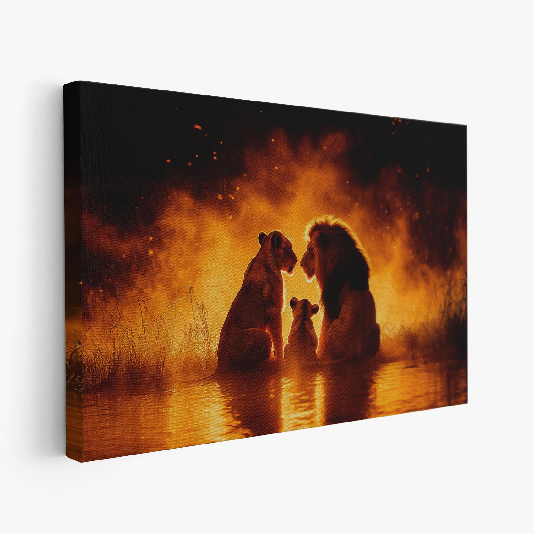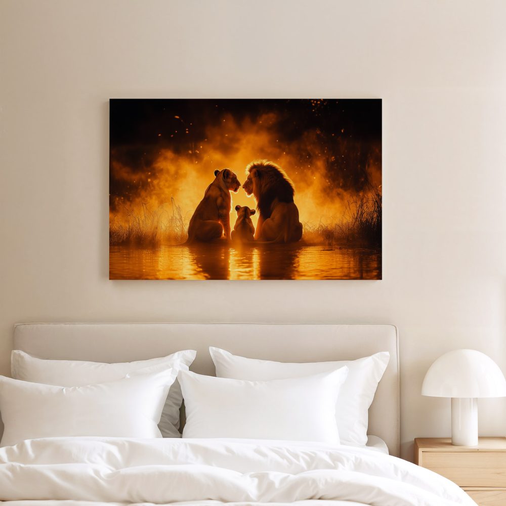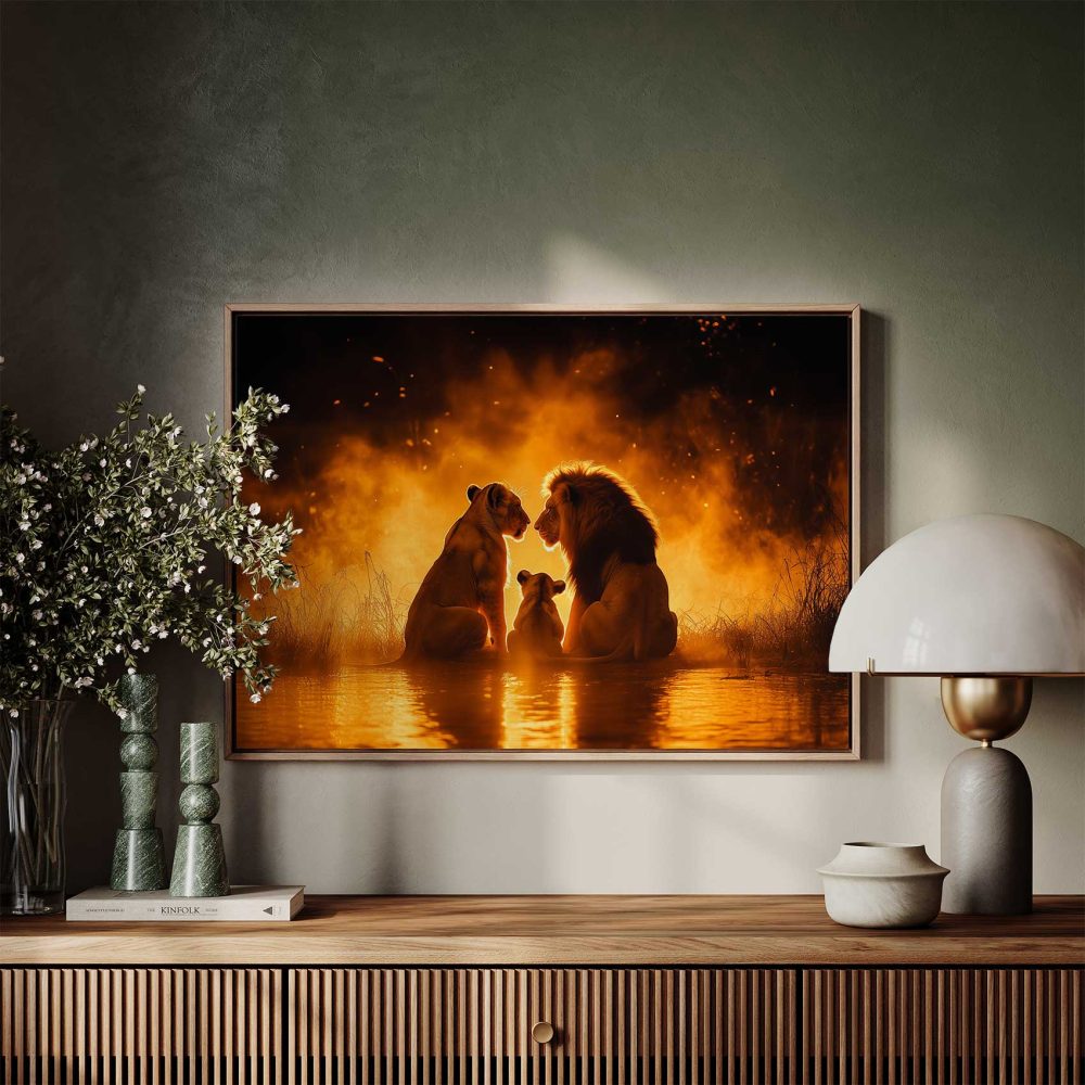 Terug naar collectie / Schilderijen / Dieren Schilderij / Lionenfamilie in vlammend water