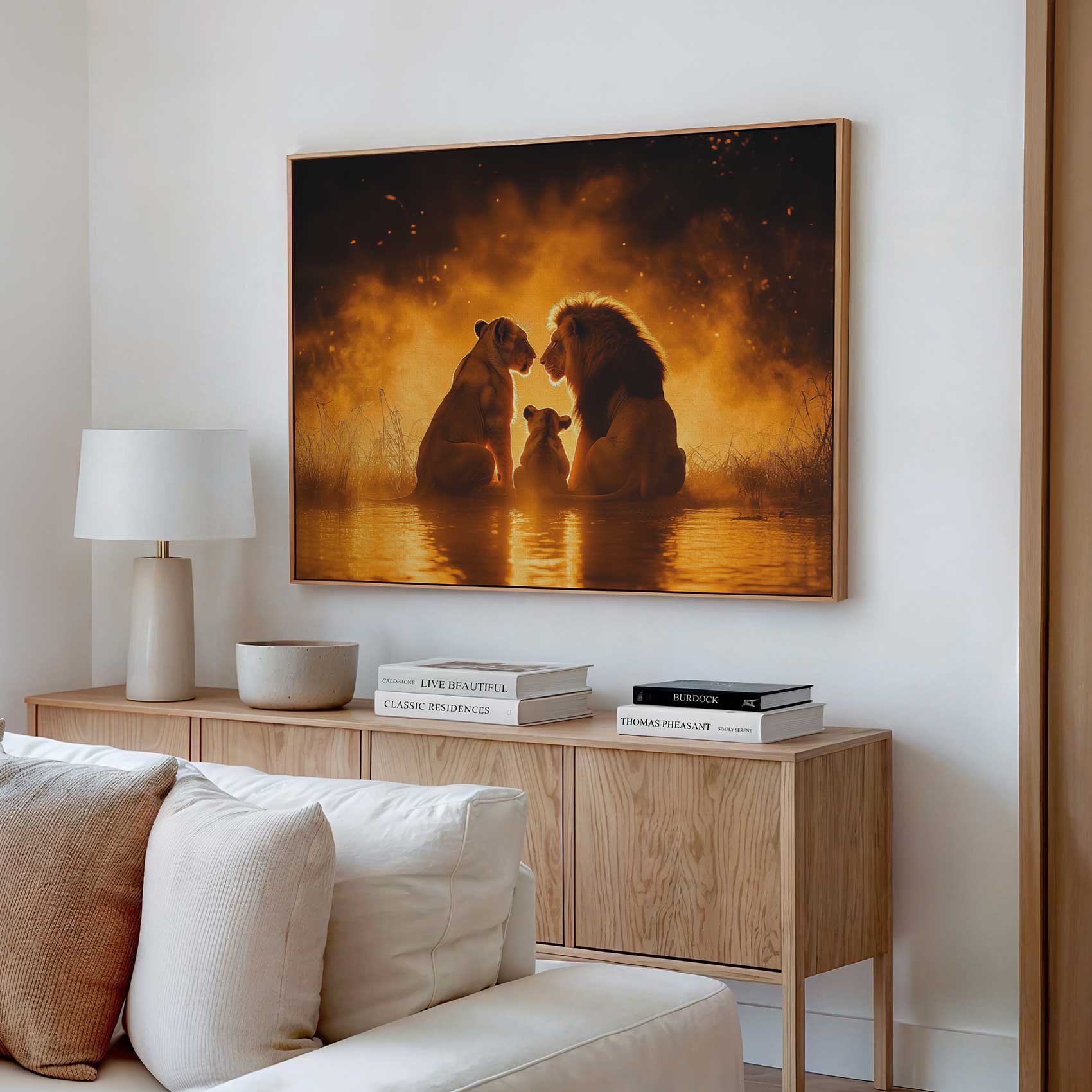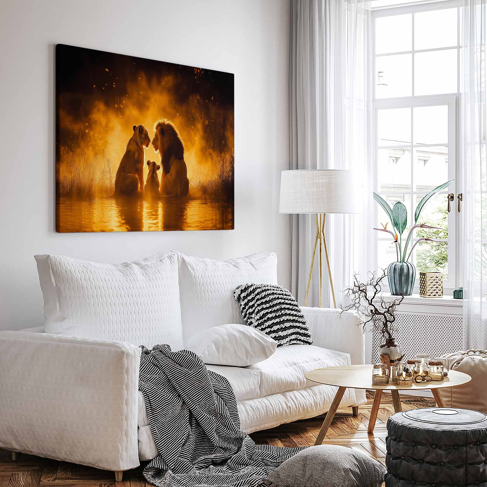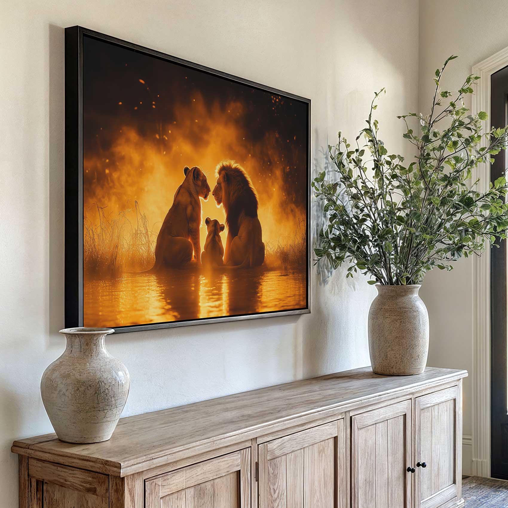 Terug naar collectie / Schilderijen / Dieren Schilderij / Lionenfamilie in vlammend water
