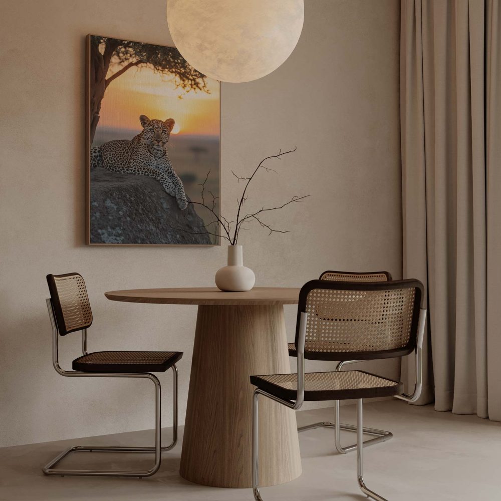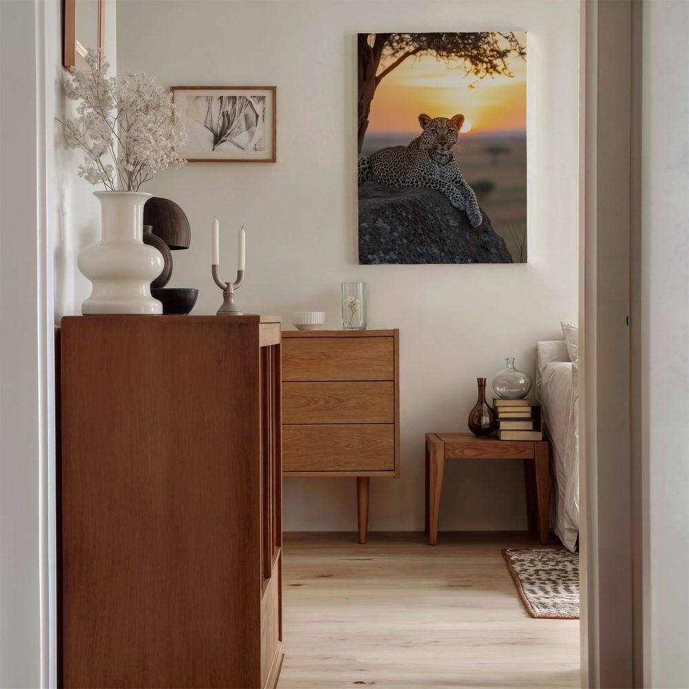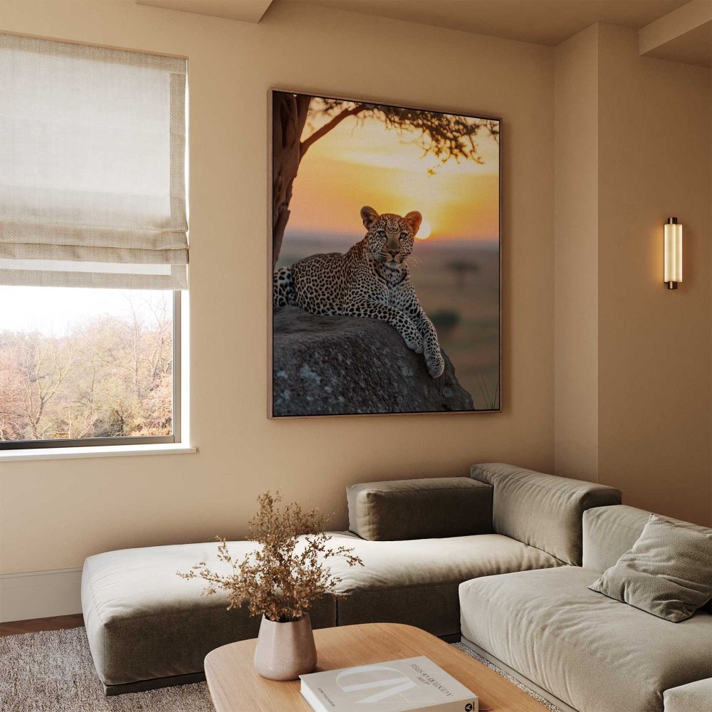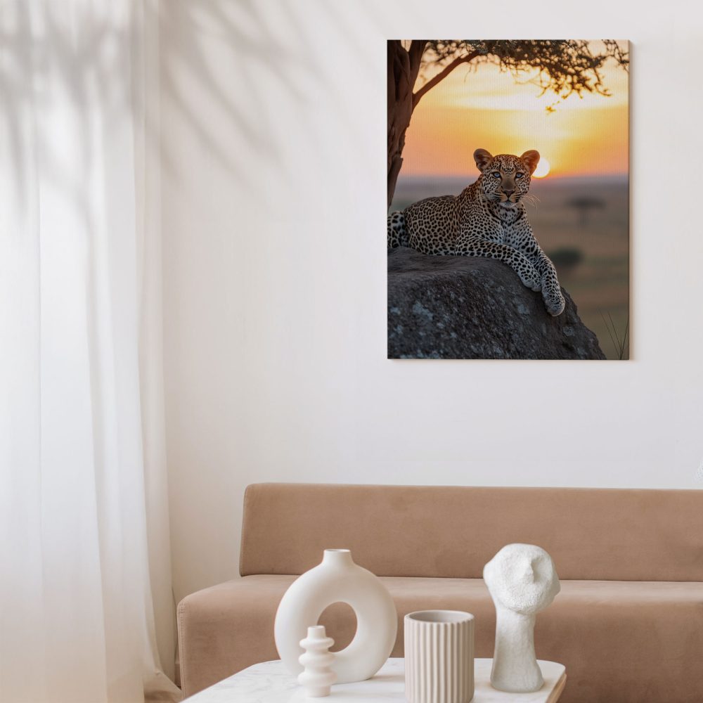 Terug naar collectie / Schilderijen / Dieren Schilderij / Luierende luipaard bij zonsondergang