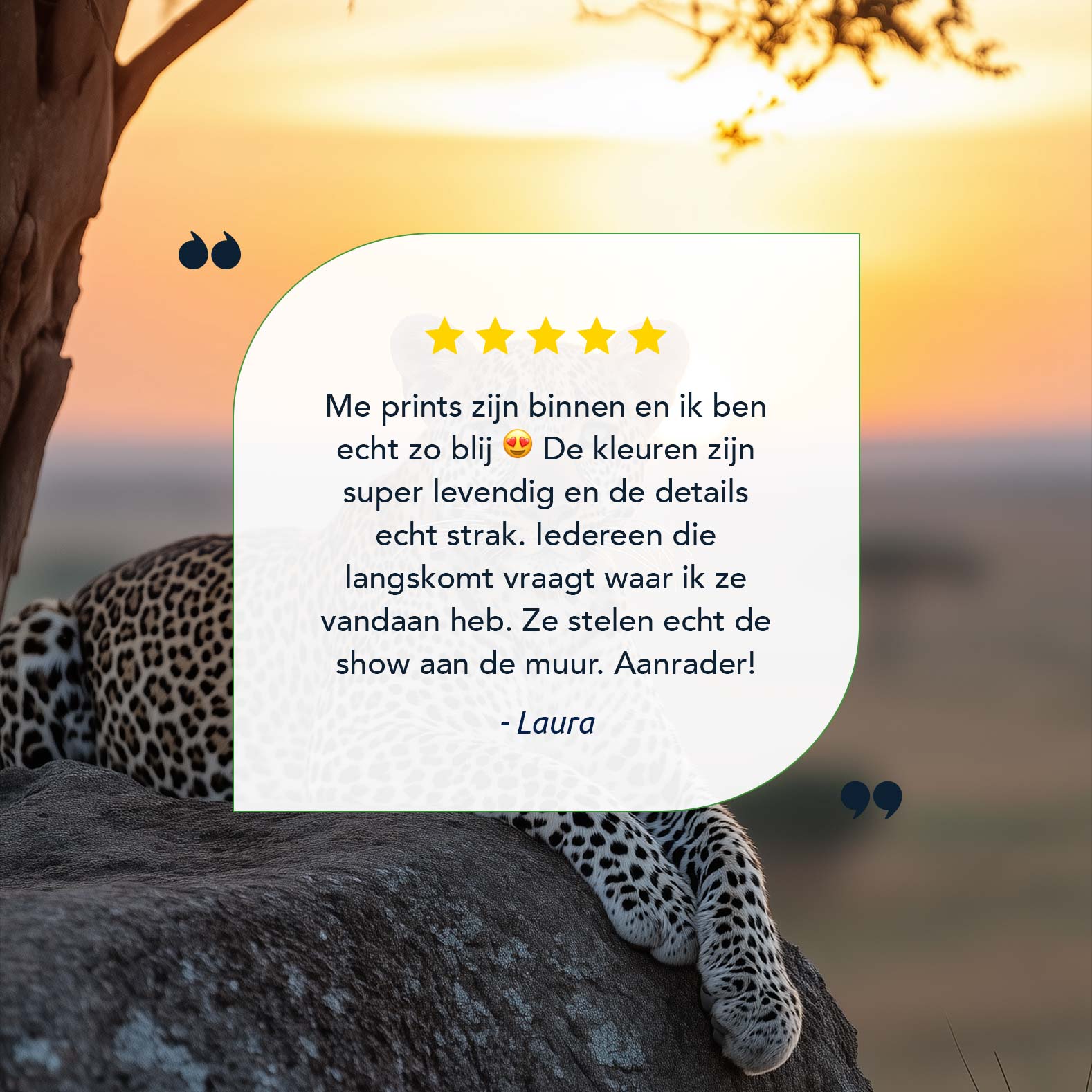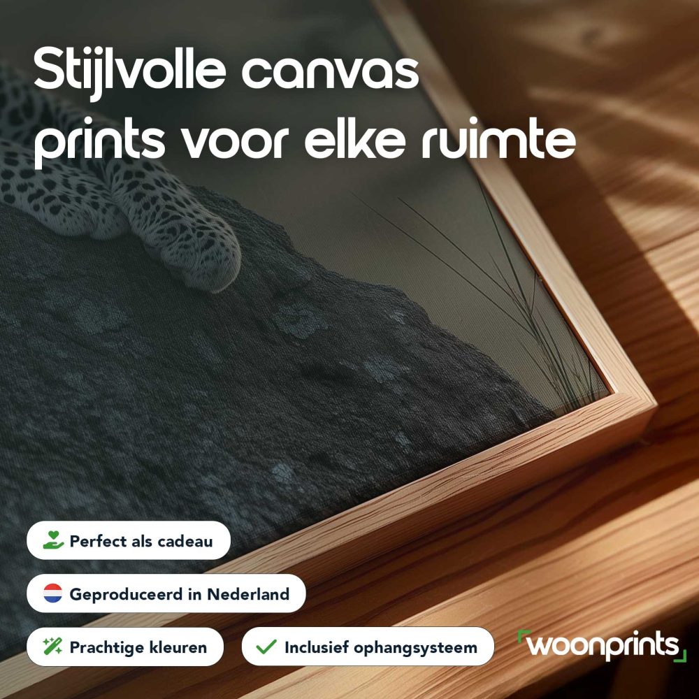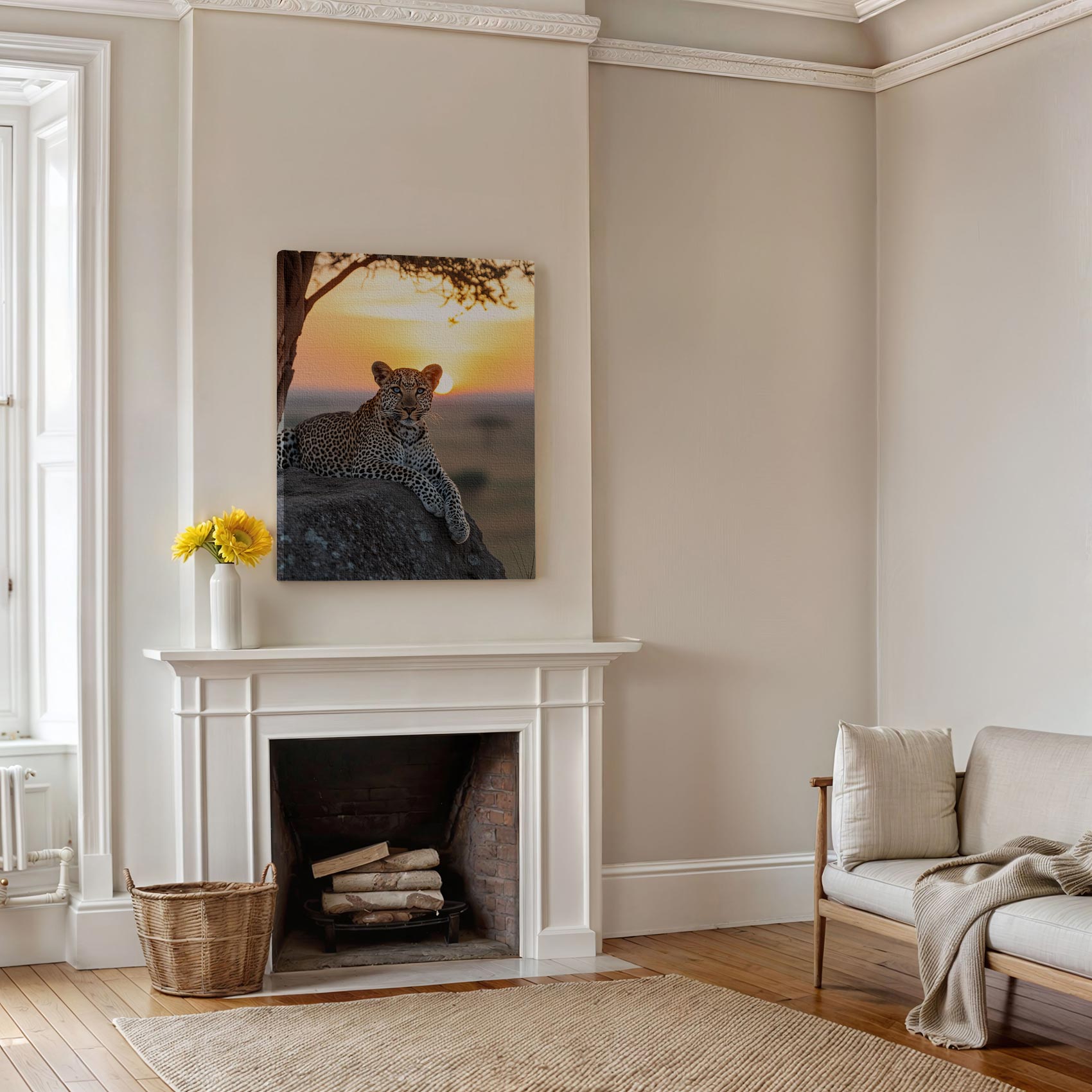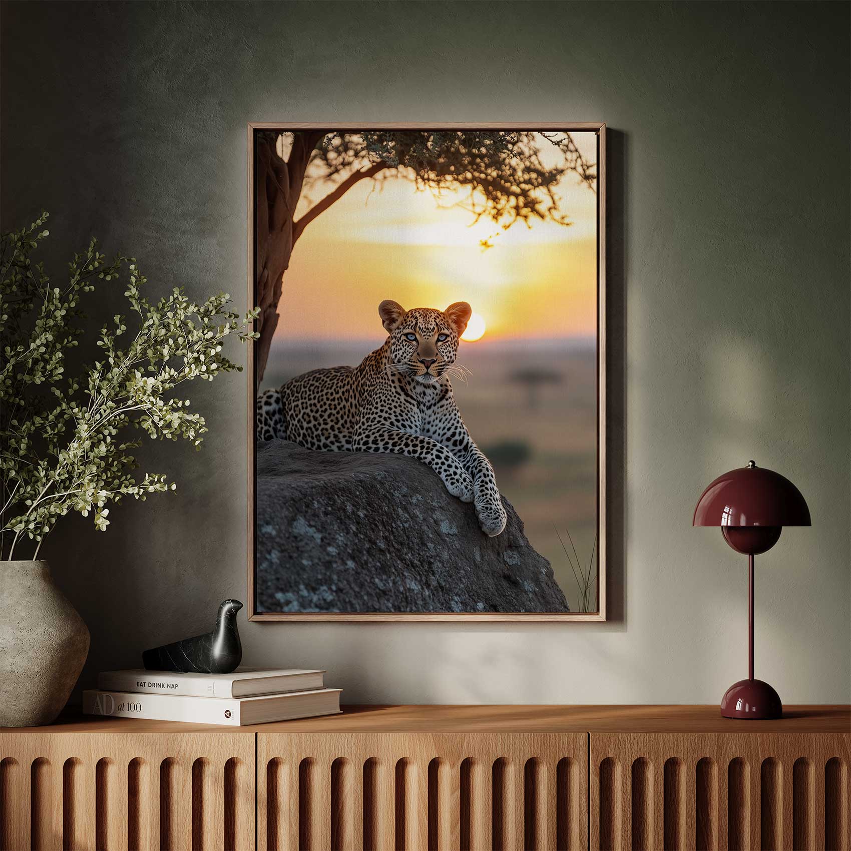 Terug naar collectie / Schilderijen / Dieren Schilderij / Luierende luipaard bij zonsondergang
